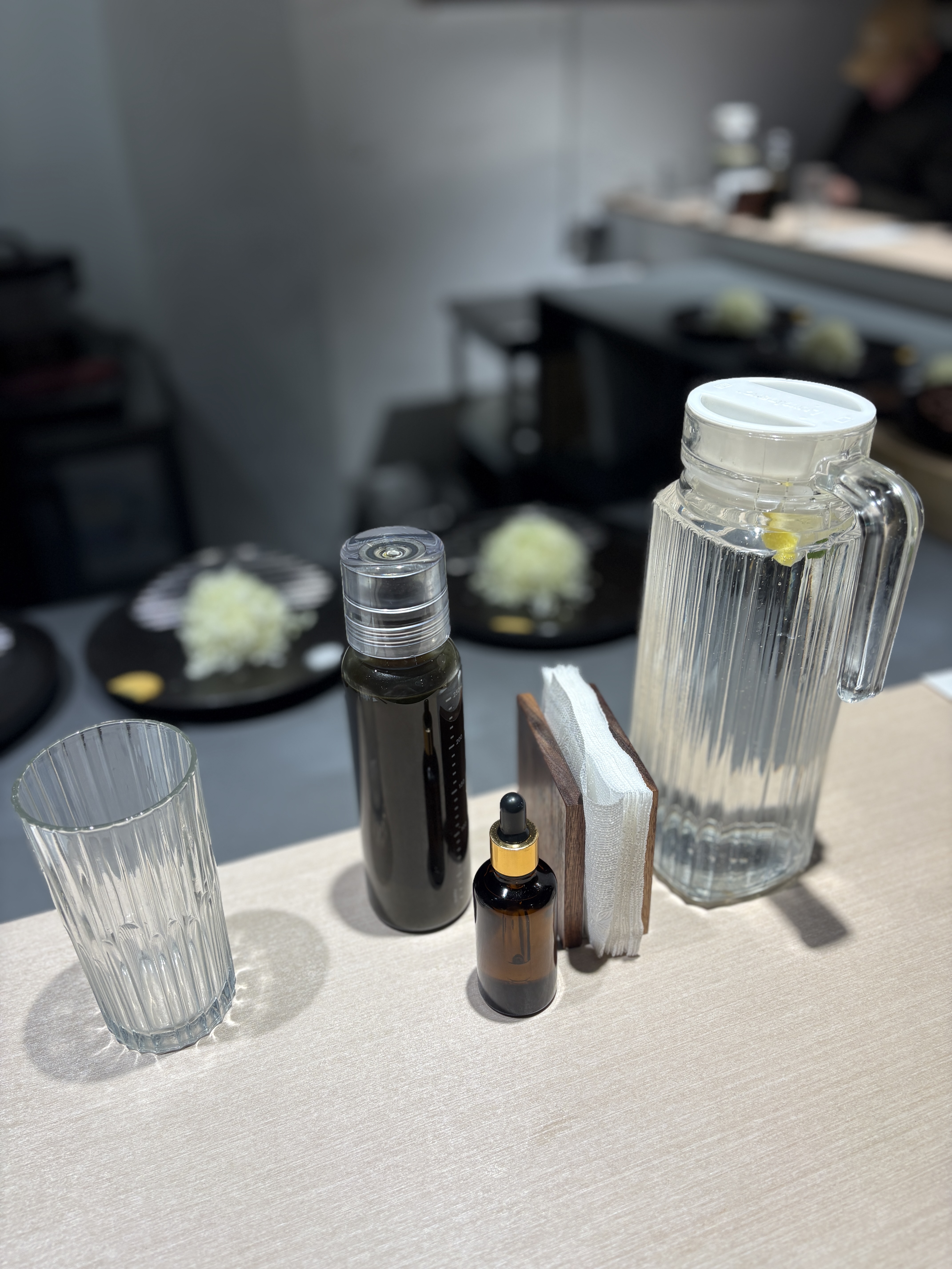 함께 곁들일 소스와 드레싱. 앞에 작은 병은 트러플 오일로 2-3방울 정도 곁들여 먹으라고 설명해주시구요, 뒤에 있는 큰 병은 시소 폰즈 드레싱으로 양배추 샐러드에 뿌려먹습니다. 개인적으로 시소향을 좋아해서 전 매우 좋았지만 이게 호불호가 있기 때문에 대체 드레싱이 있는지는 서버분에게 여쭤보셔야할거같네요. 물도 일반 정수가 아닌 레몬물에 향채가 들어있어 좋았습니다.