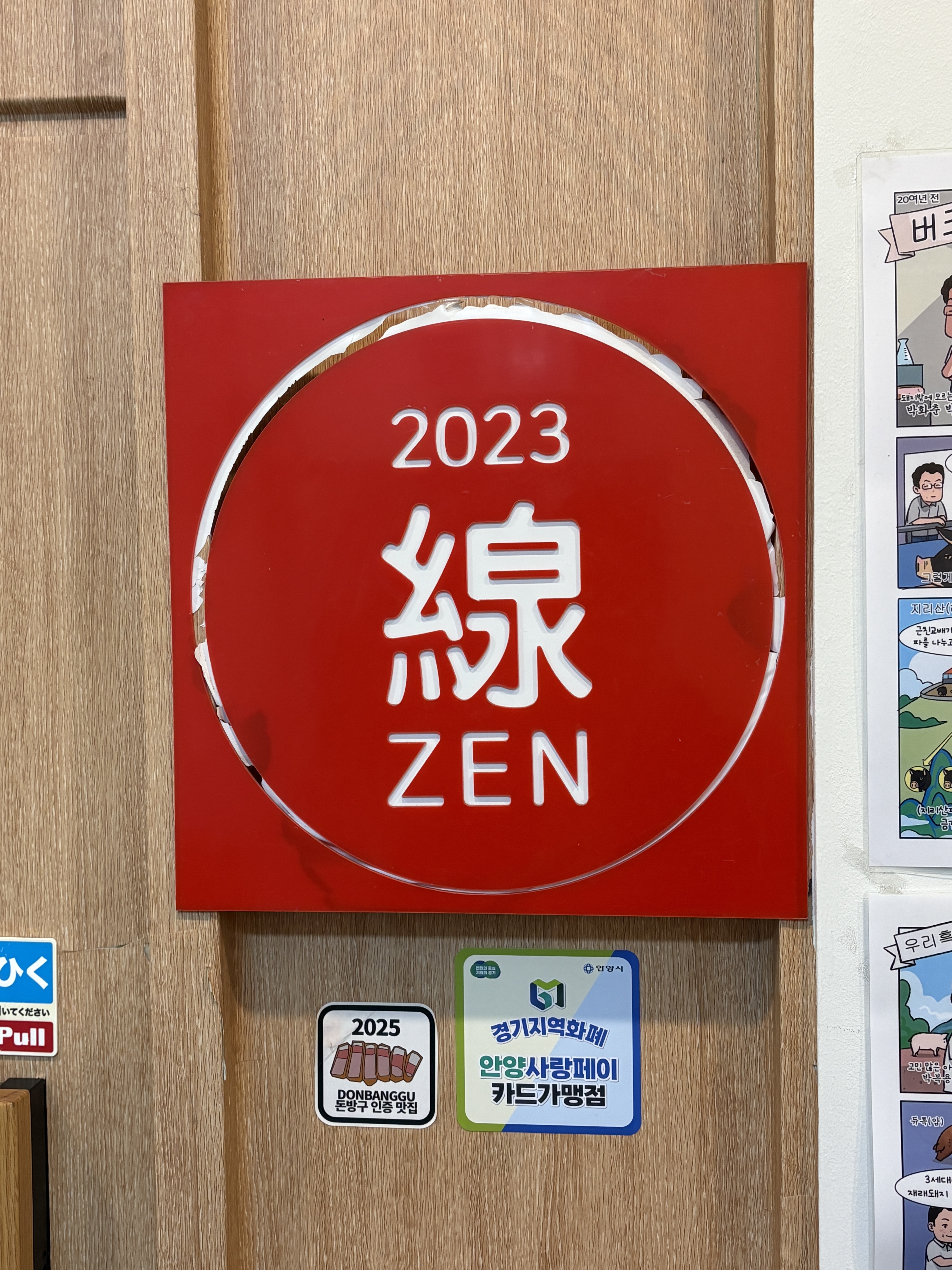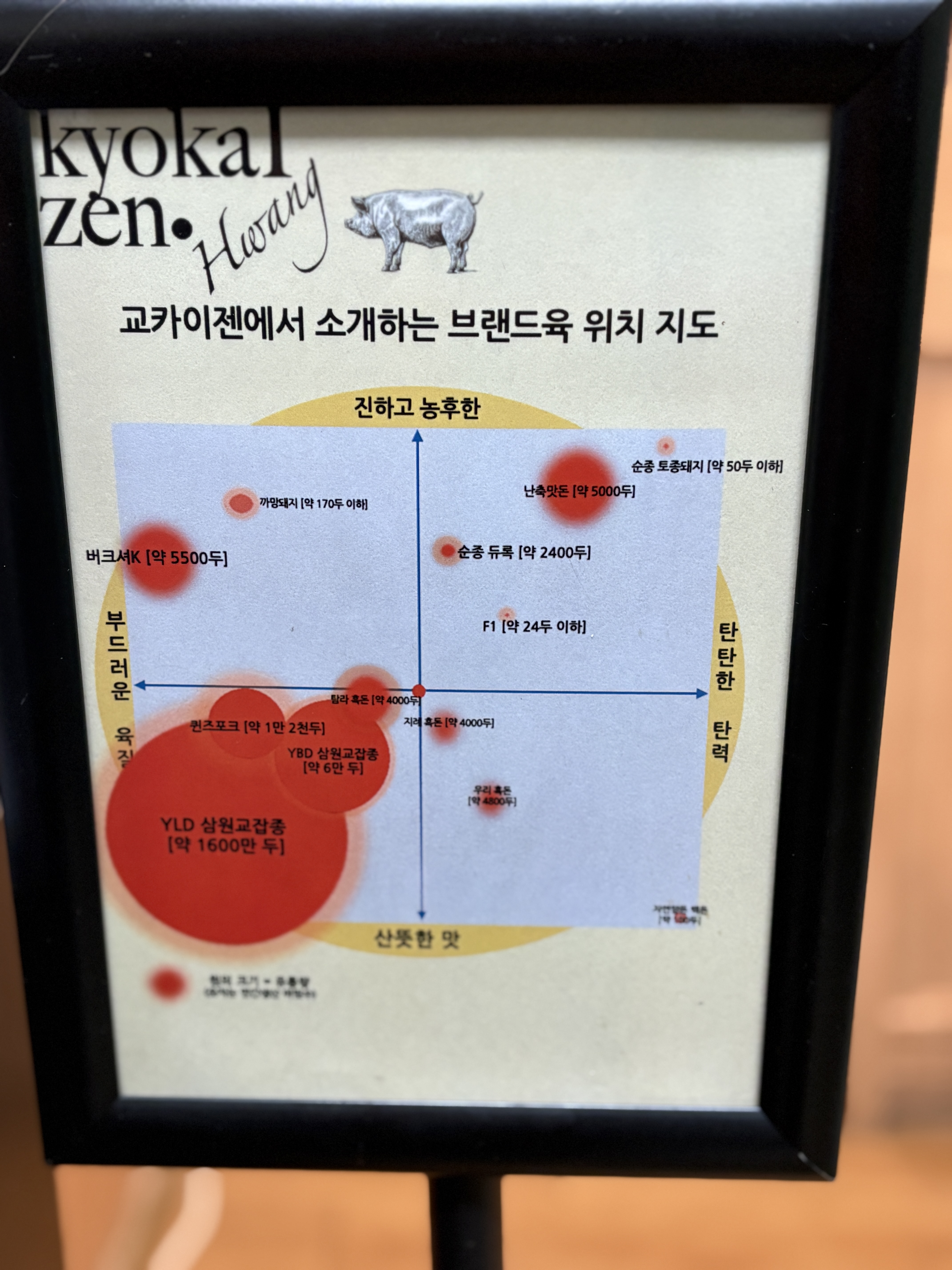 교카이젠이 높은 평가를 받는데에는 물론 여러가지가 있겠지만, 우리나라에 존재하는 재래 돼지를 포함해서, 버크셔와 같은 외국의 유명 품종들을 활용한 다년간의 연구를 통해 개량되어진 '우리 돼지'의 유전자를 지닌 품종들을 소개한다는 것도 큰 의미가 있다고 생각됩니다. 실제로 가게에 도착해서 주문을 해보면 어디선가 들어본 것 같은 품종의 이름부터, 아주 생소한 품종까지 메뉴판에 등장하기 때문에 손님들이 자연스럽게 품종의 유래나 특징들에 대해서 궁금하게 되고, 이를 만화 등으로 이해하기 쉽게 풀어서 벽에 붙여두셨기 때문에 국내 돼지 품종들에 대한 홍보대사 역할을 톡톡히 하고 계시다고 할 수 있습니다.