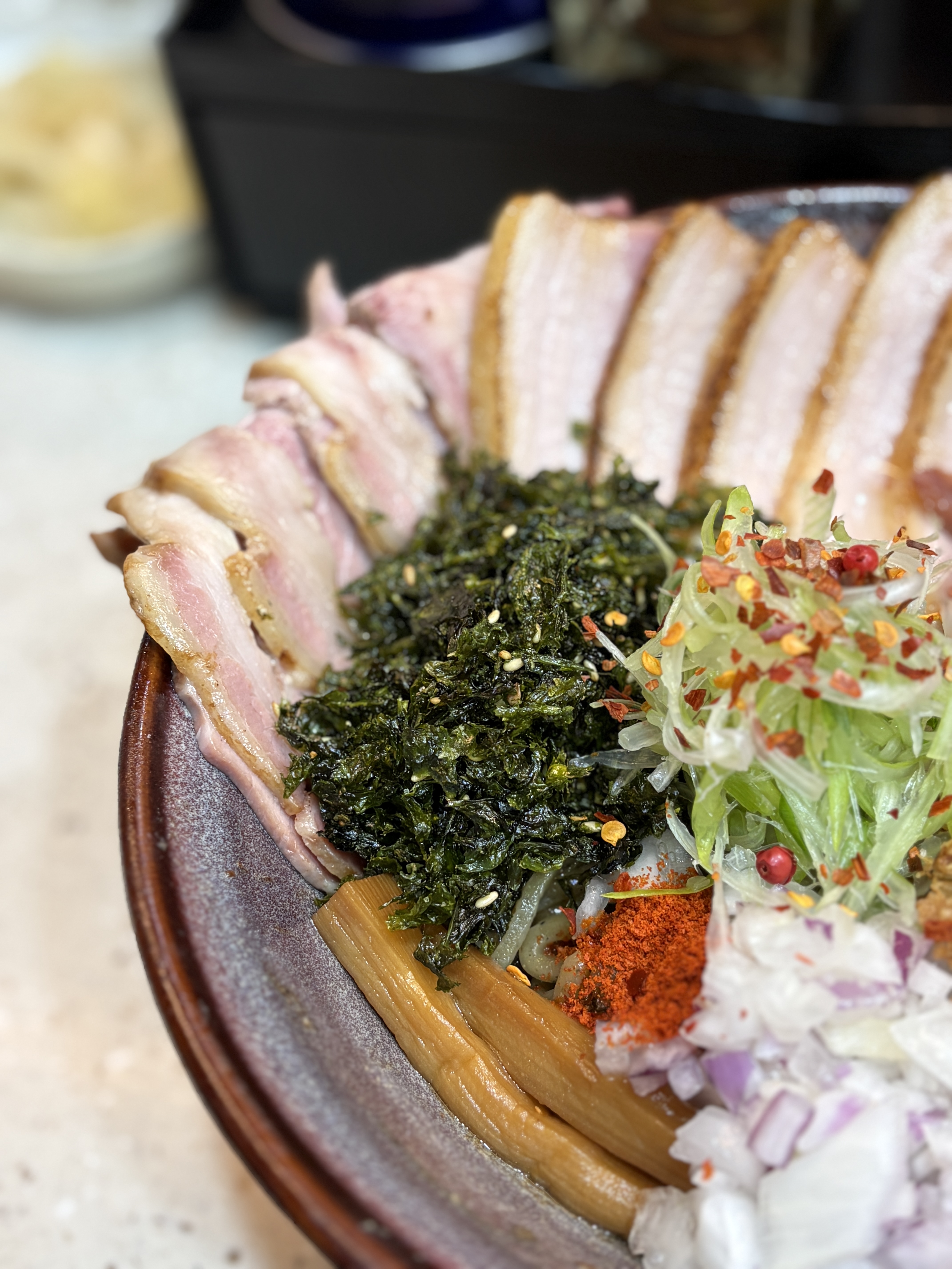 김가루와 고춧가루로 추정되는 가루도.. 이치미일까요 아니면..? 밑에 멘마도 보이고 적양파와 흰양파찹도 섞여있습니다.