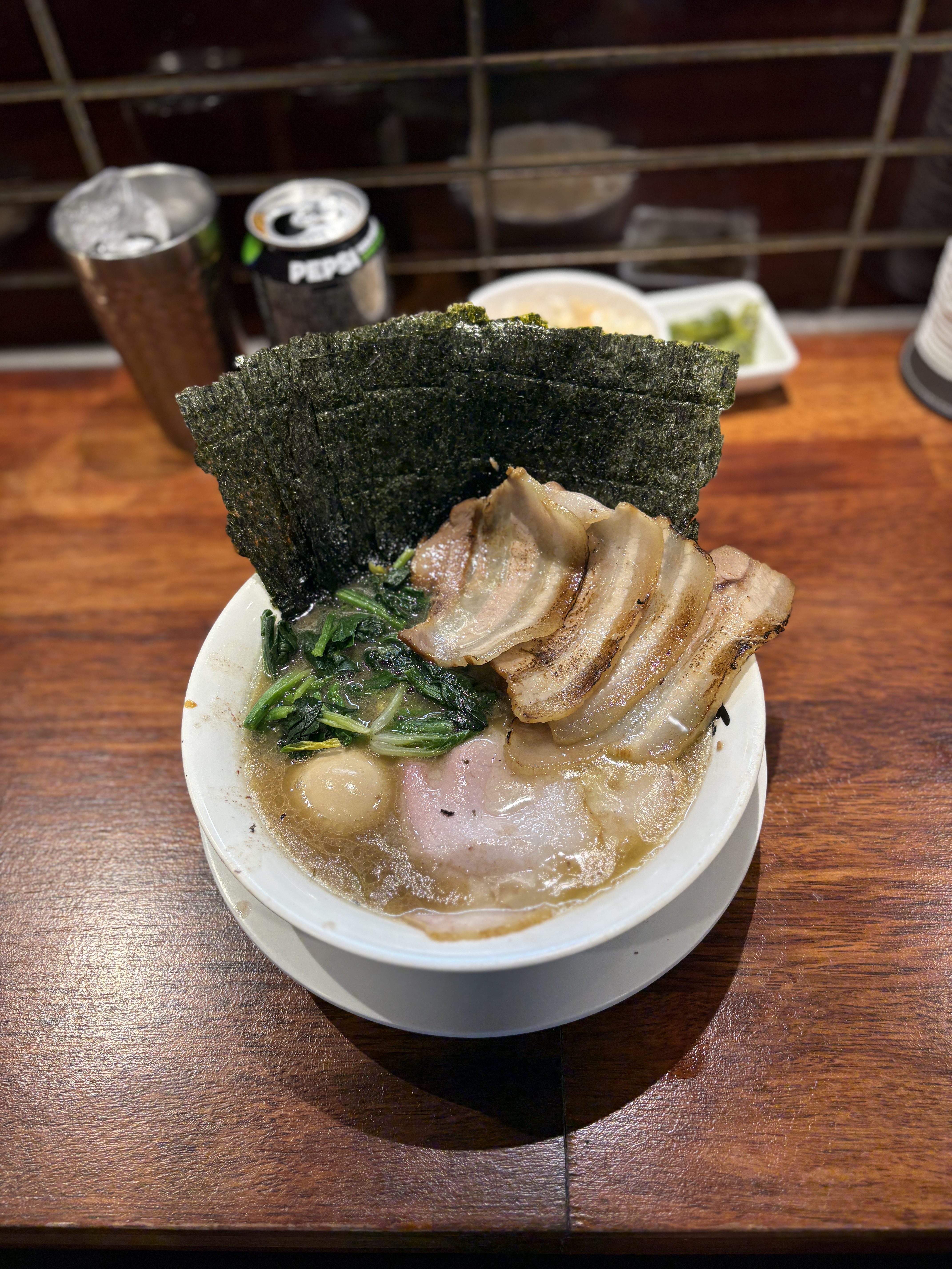단백질을 더 먹고싶다는 핑계로 주문한 삼겹차슈+2 토치로 아부라해서 내어주십니다. 한가지 특징은 하쿠텐은 차슈를 이렇게 접시에 내어주시면서 라멘보다 꽤 이른 시간 먼저 주신다는 점인데요. 스프랑 같이 먹고 싶은 분들은 좀 아쉬울 수도 있는데, 셀프바에서 가져온 밥이랑 같이 먹기에도 이게 꽤나 괜찮습니다 ㅋㅋ 근데 전 또 사진을 찍고 싶은 사람이므로.. 하릴없이 라멘이 나오길만을 기다렸다는..