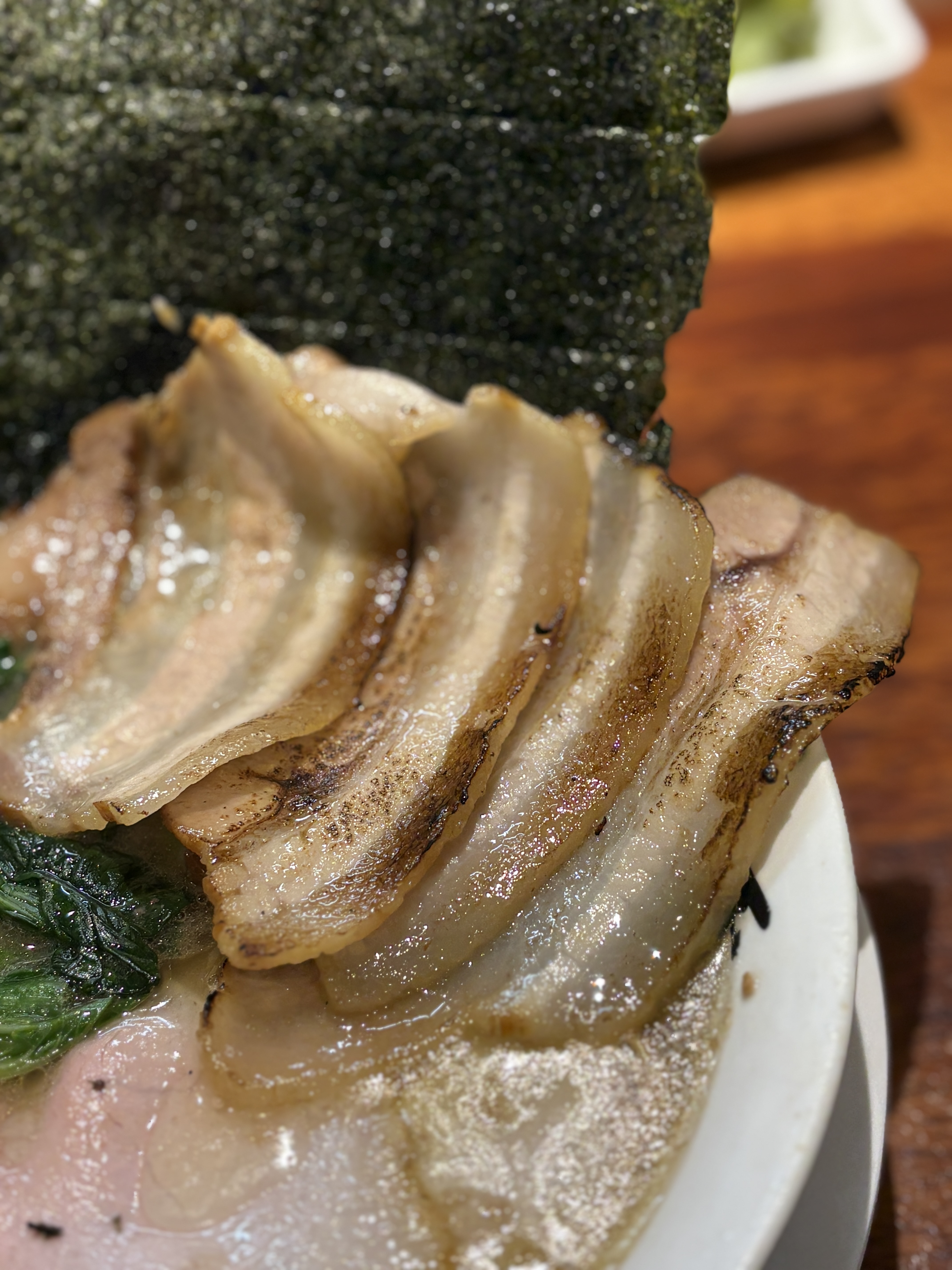 드디어 라멘님이 나오시자마자 주문한 삼겹차슈를 올리고 사진 한 컷 찍습니다. 그냥 기본으로 나오는 라멘도 잘 담겨서 나오지만 이 삼겹차슈가 올라가야 비쥬얼이 완성되는 것 같은 느낌 ㅋㅋ