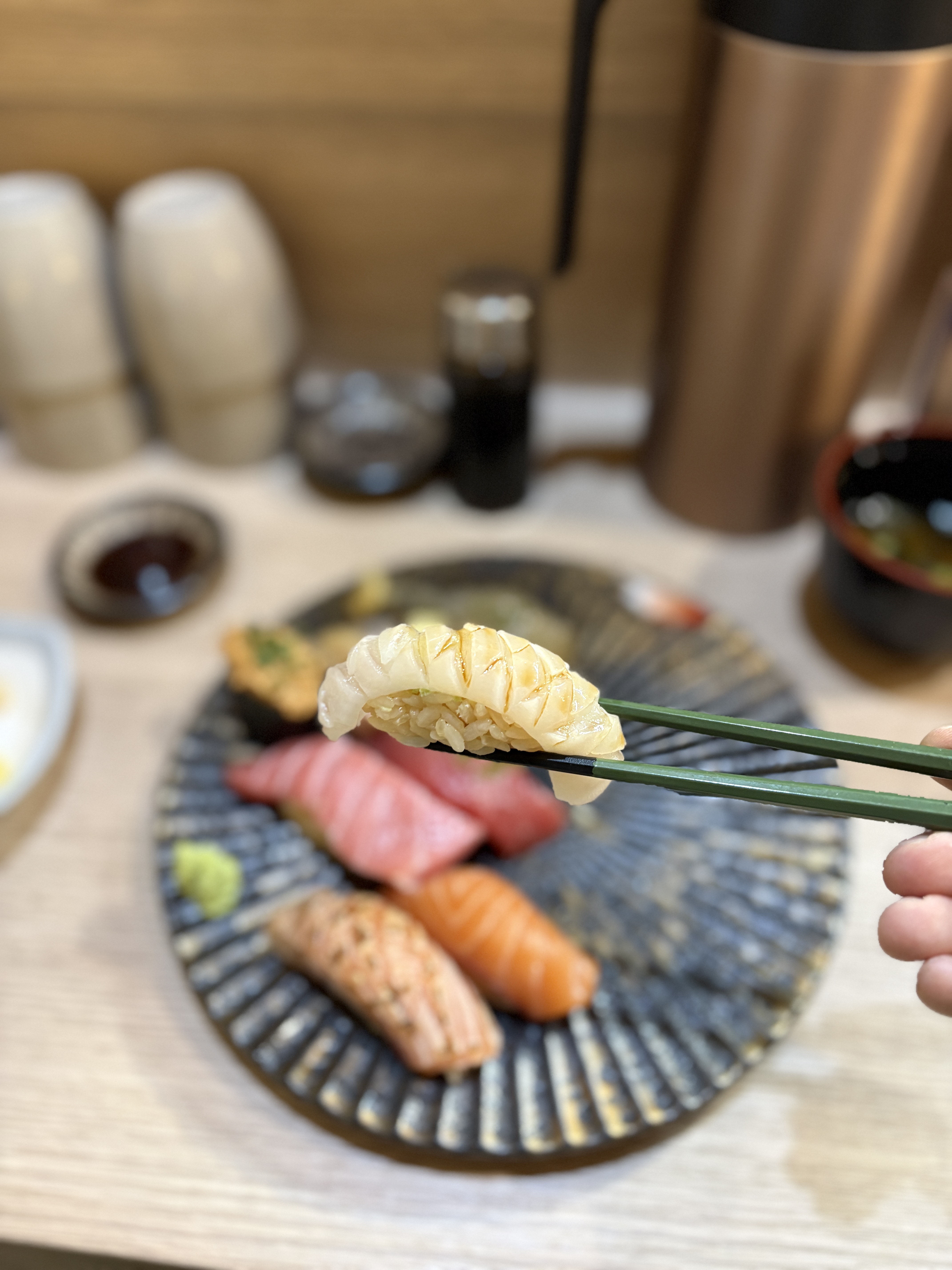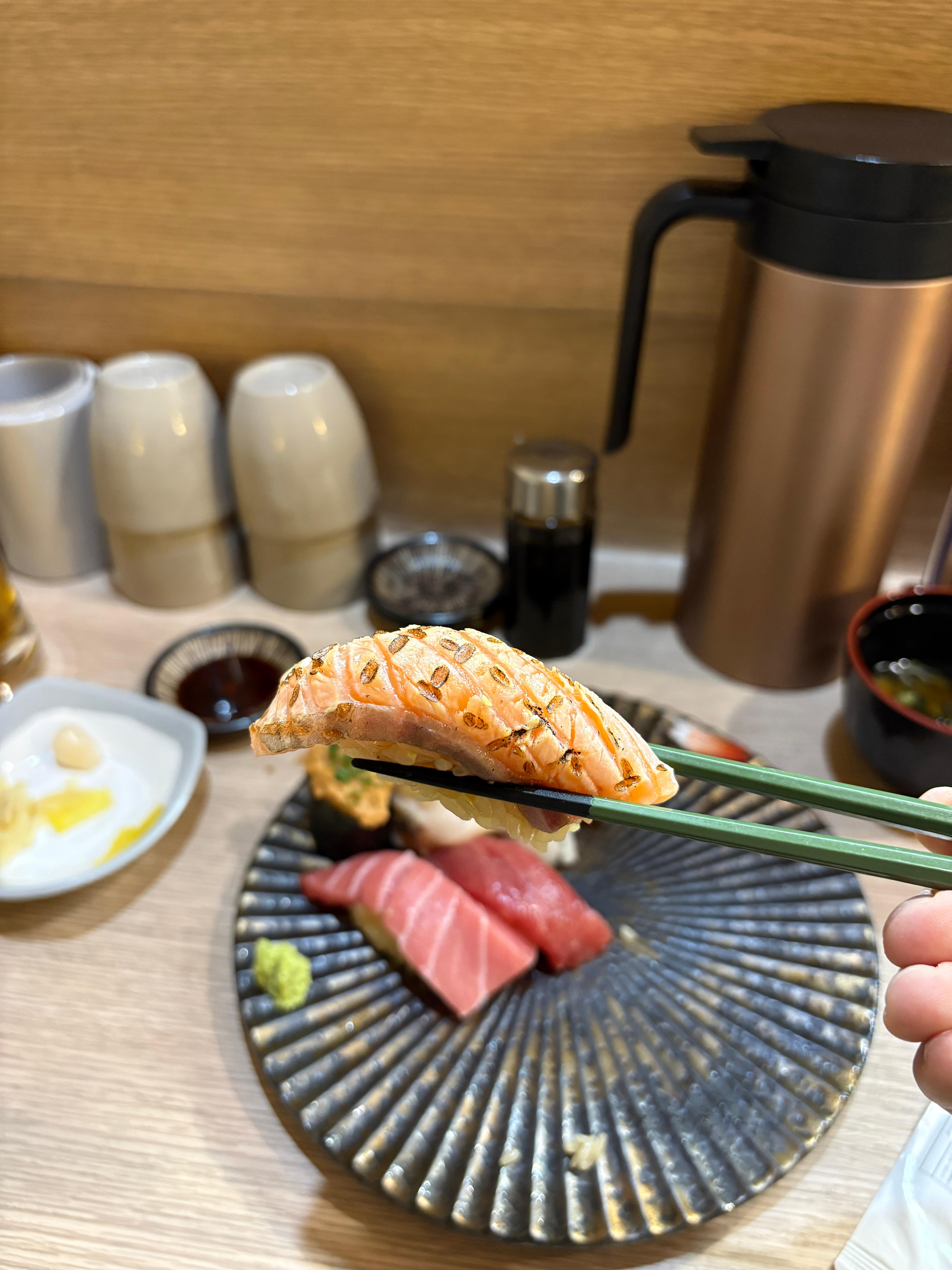 연어도 이렇게 칼집을 내주신 후 아부리를 해주셔서 연어가 두피스임에도 불구하고 각기 다른 맛으로 먹을 수 있어서 좋았습니다. 이 사진을 보시면 아시겠지만 네타도 두툼하고 샤리도 양이적지 않아서 푸짐하게 먹을 수 있는 곳입니다.