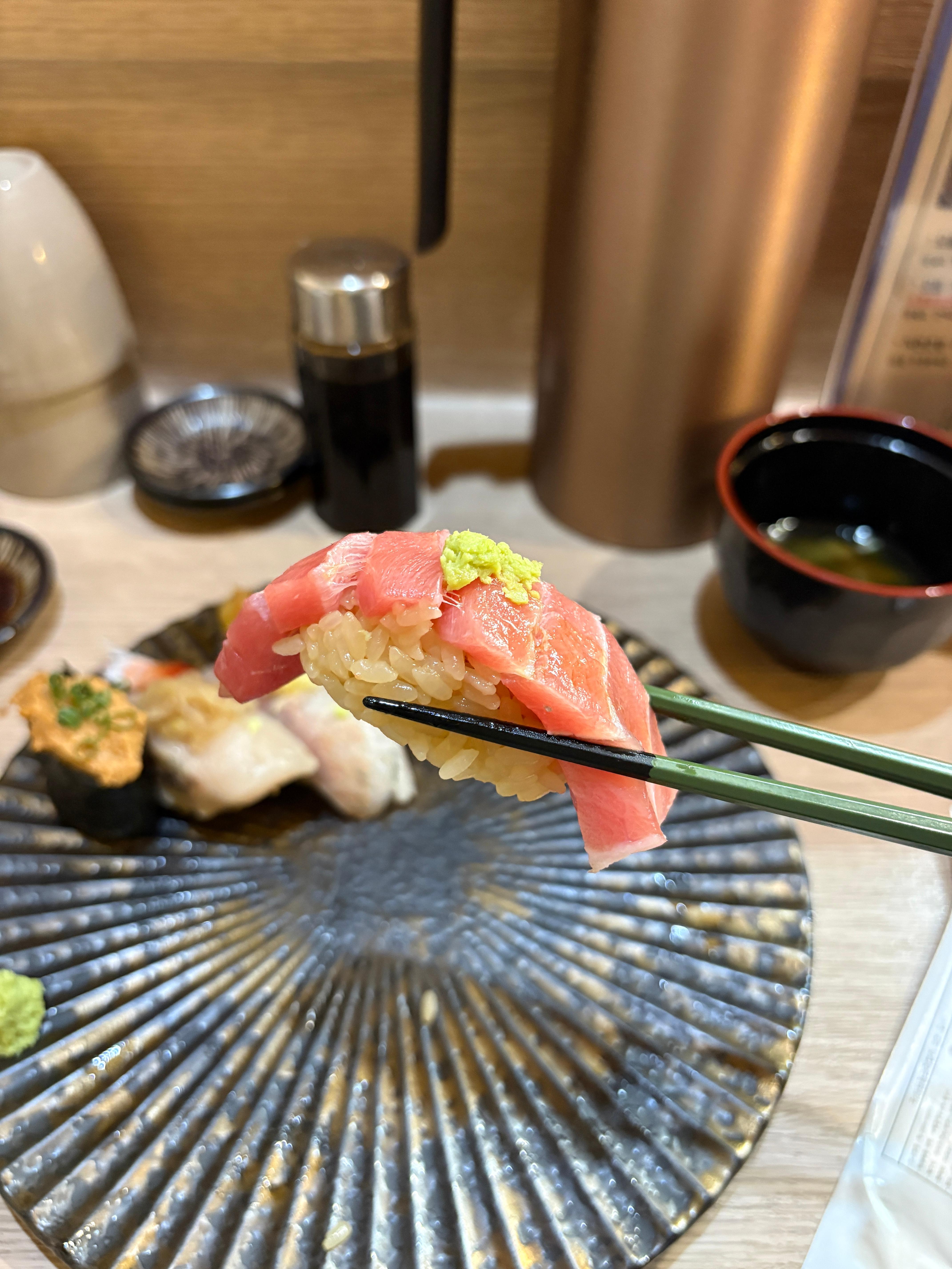원물차가 가장 크다고 할 수 있는 참치 부위인데요, 미들급 오마카세랑 비교해도 쫀쫀함은 조금 떨어질 순 있어도 맛은 좋았어요. 자체적으로 간장을 넉넉하게 일찍 발라 두었다가 즈케되는 것을 기다린 후에 먹었습니다.