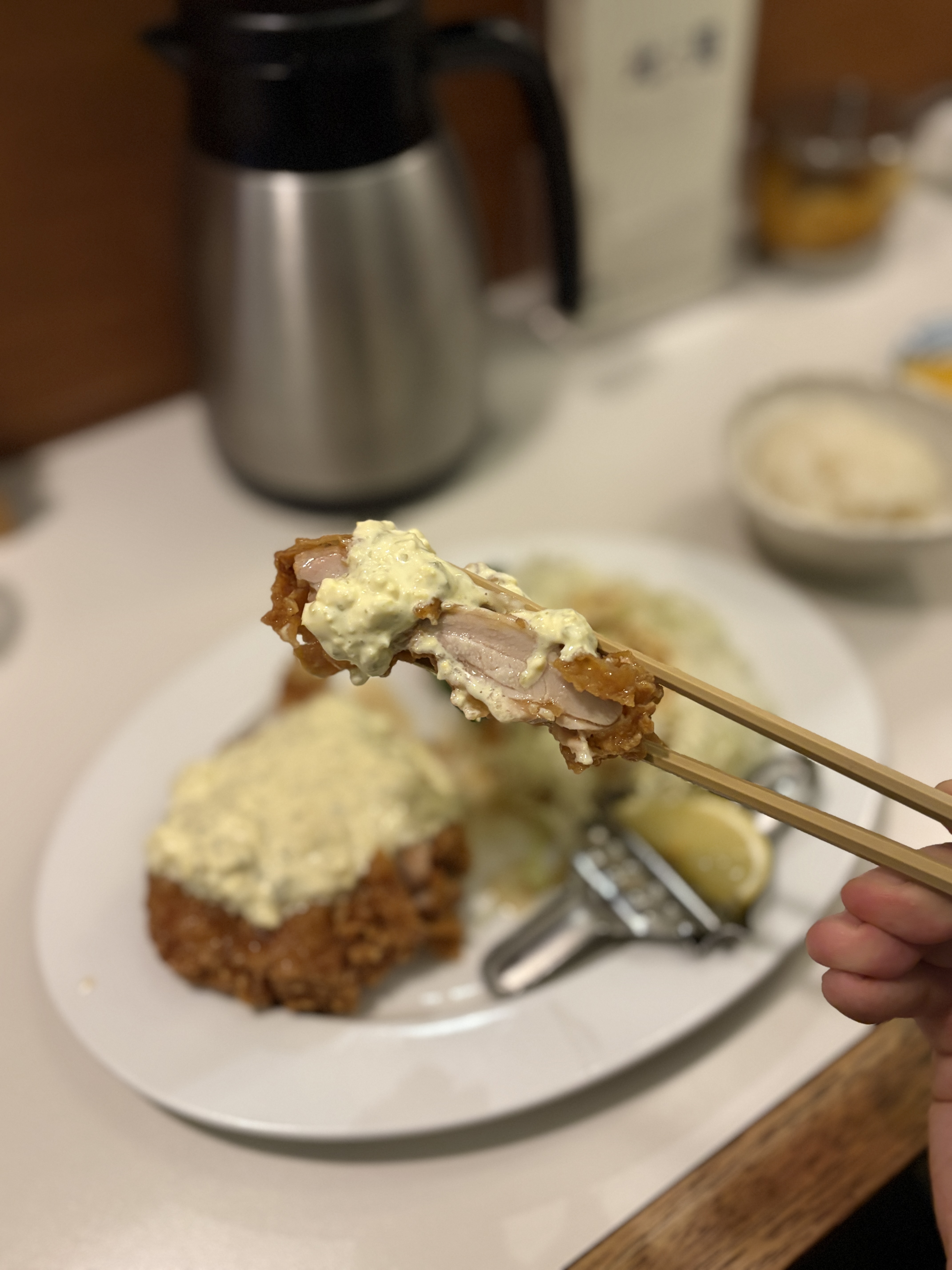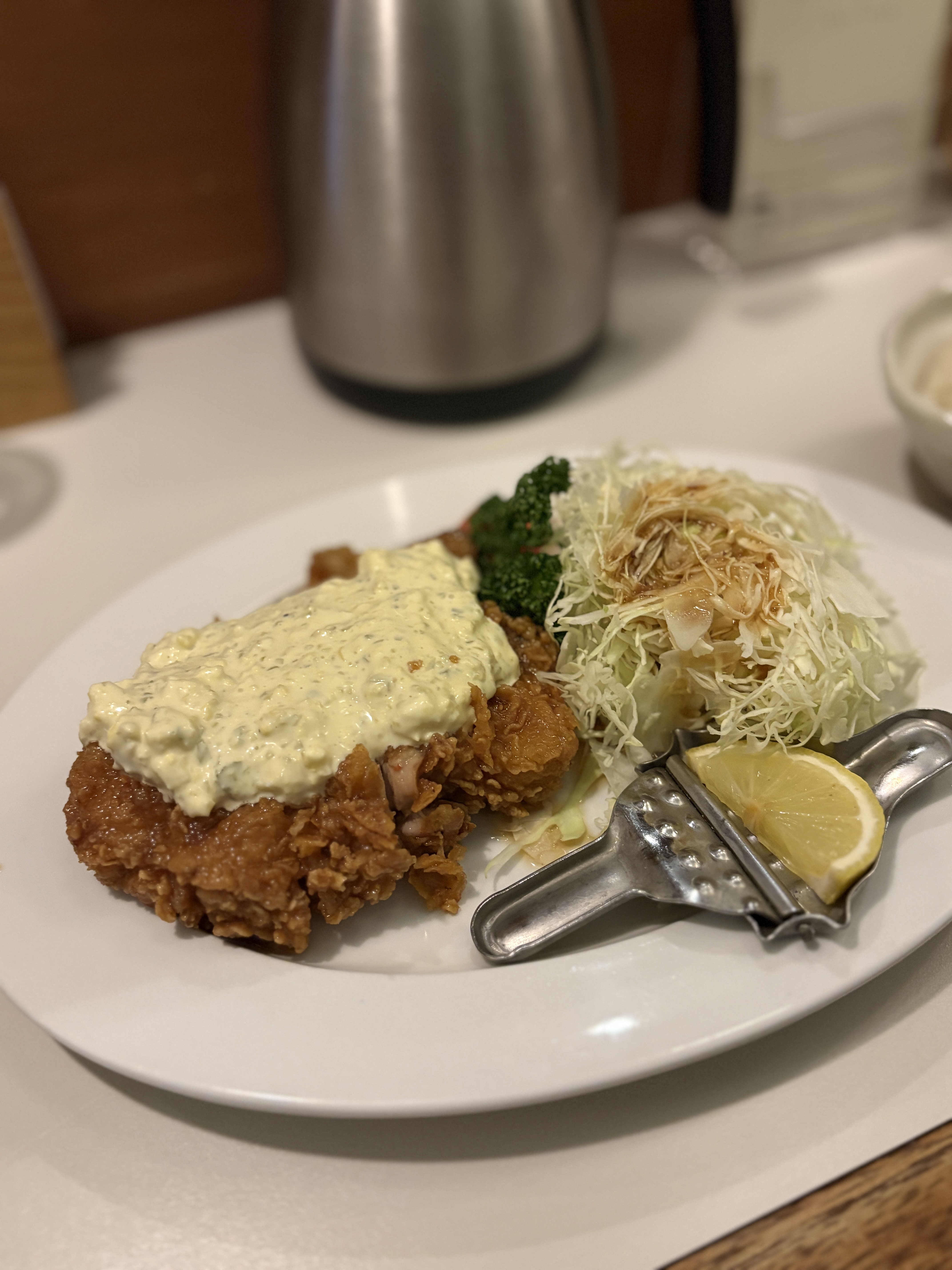 그렇게 해서 받아본 치킨 난반입니다. 레몬즙을 짜는 도구를 같이 주시는게 인상적이었구요, 흔히 생각하는 치킨 난반의 기본 구성은 모두 갖추었는데 한차원 업그레이드된 느낌입니다. B급 구루메가 주는 B급 감성이 아닌 A급 감성이라고 할까요 ㅎㅎ 제가 일본에서 대학가에서 자주 사먹던 치킨 난반은 좀 더 투박한 치킨 튀김에 타르타르 소스도 시판이었는데 말이죠 ㅎㅎ