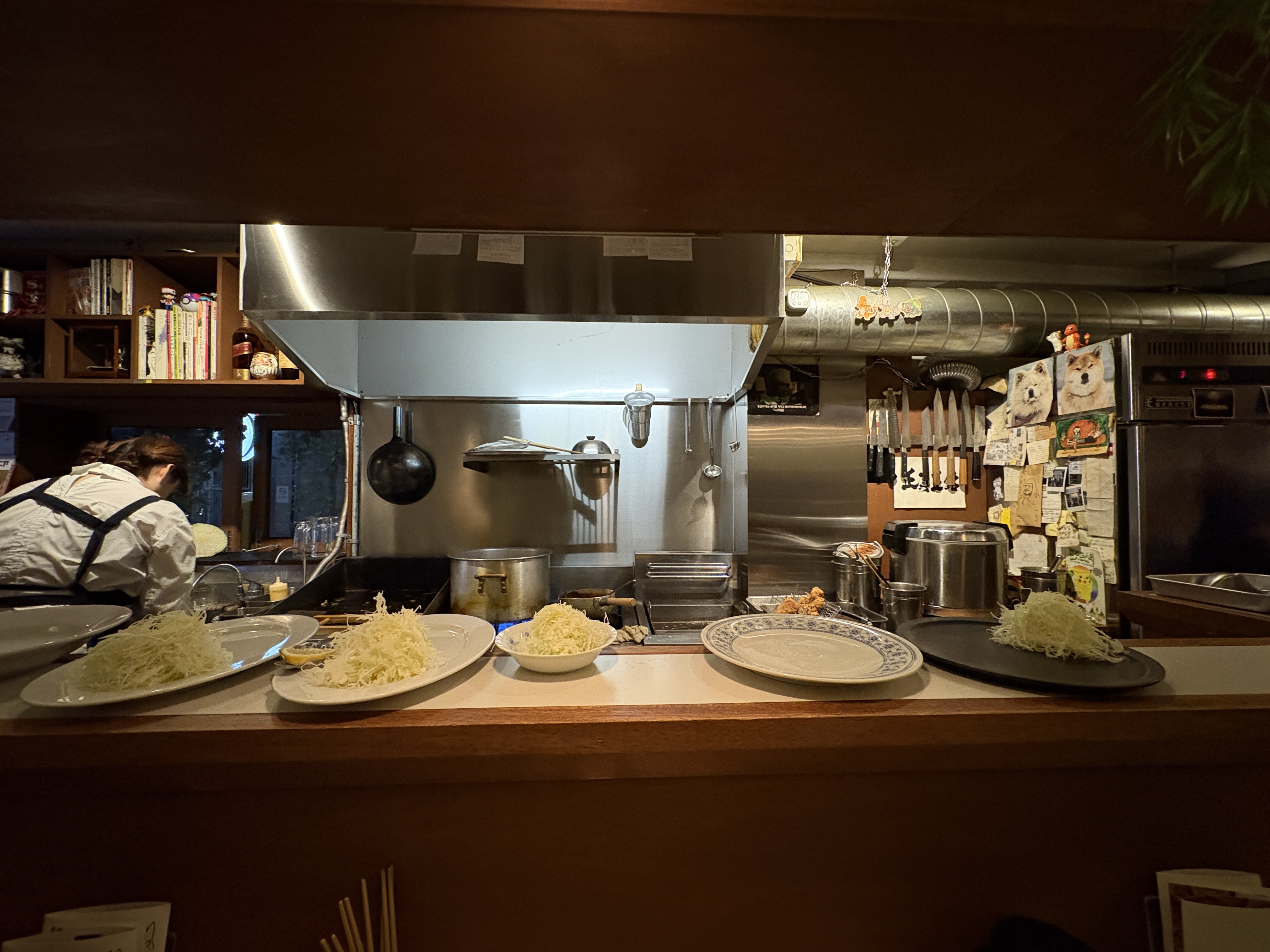 일본 가게의 접객 특유의 바이브가 느껴지는 여사장님의 목소리와 어투는 더욱 더 퇴근한 일본 오피스 골목 뒤에 자리잡은 선술집을 연상하게 합니다. 각 메뉴마다 다른 그릇을 준비해두신 섬세함도 돋보이구요 B급 구루메에서 빠질 수 없는 양배추가 넉넉하게 세팅됩니다.
