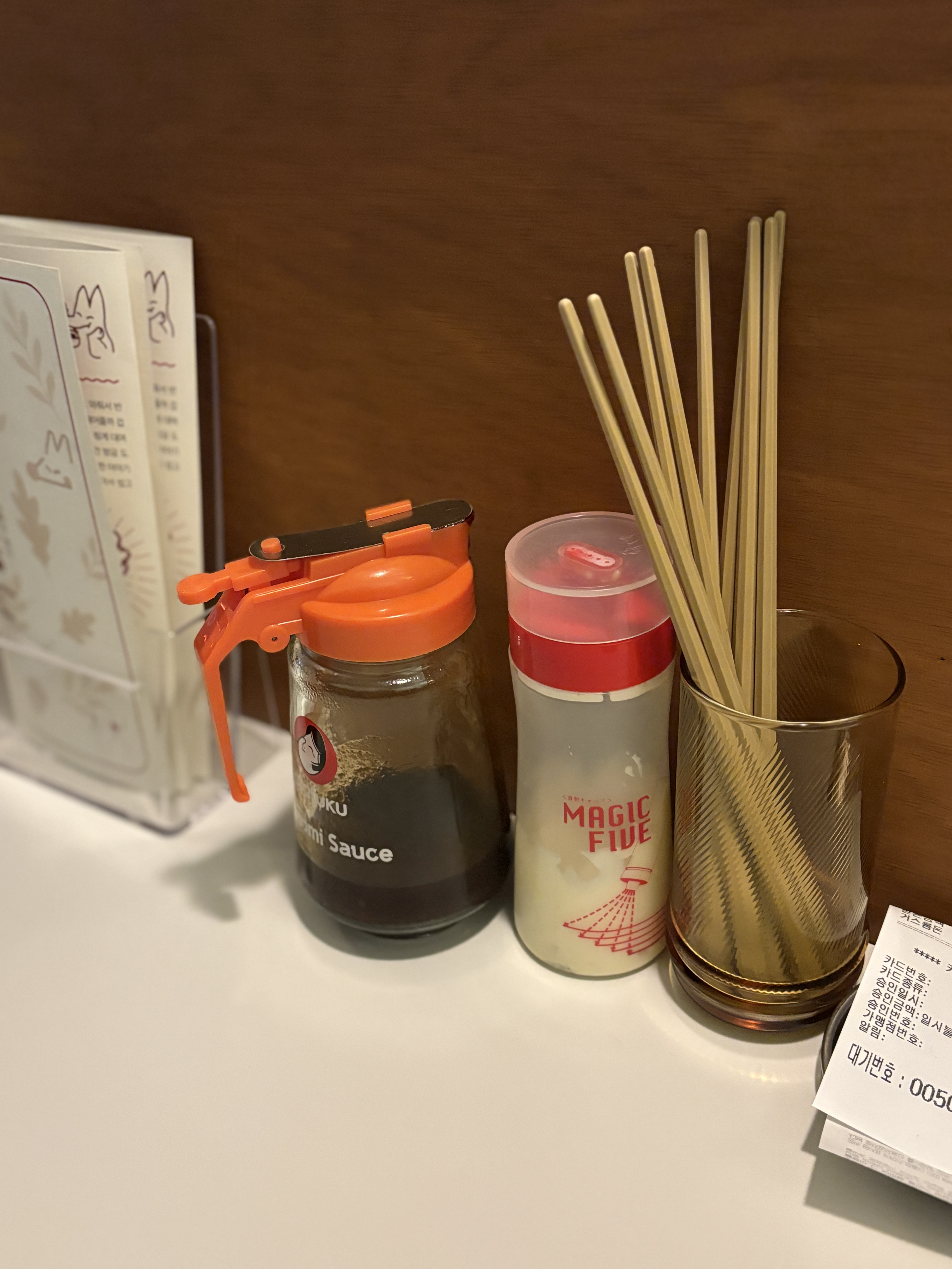 야끼소바를 위한 소스와 마요네즈는 자리마다 비치되어있어서 기호에 따라 간을 조절 할 수 있습니다.