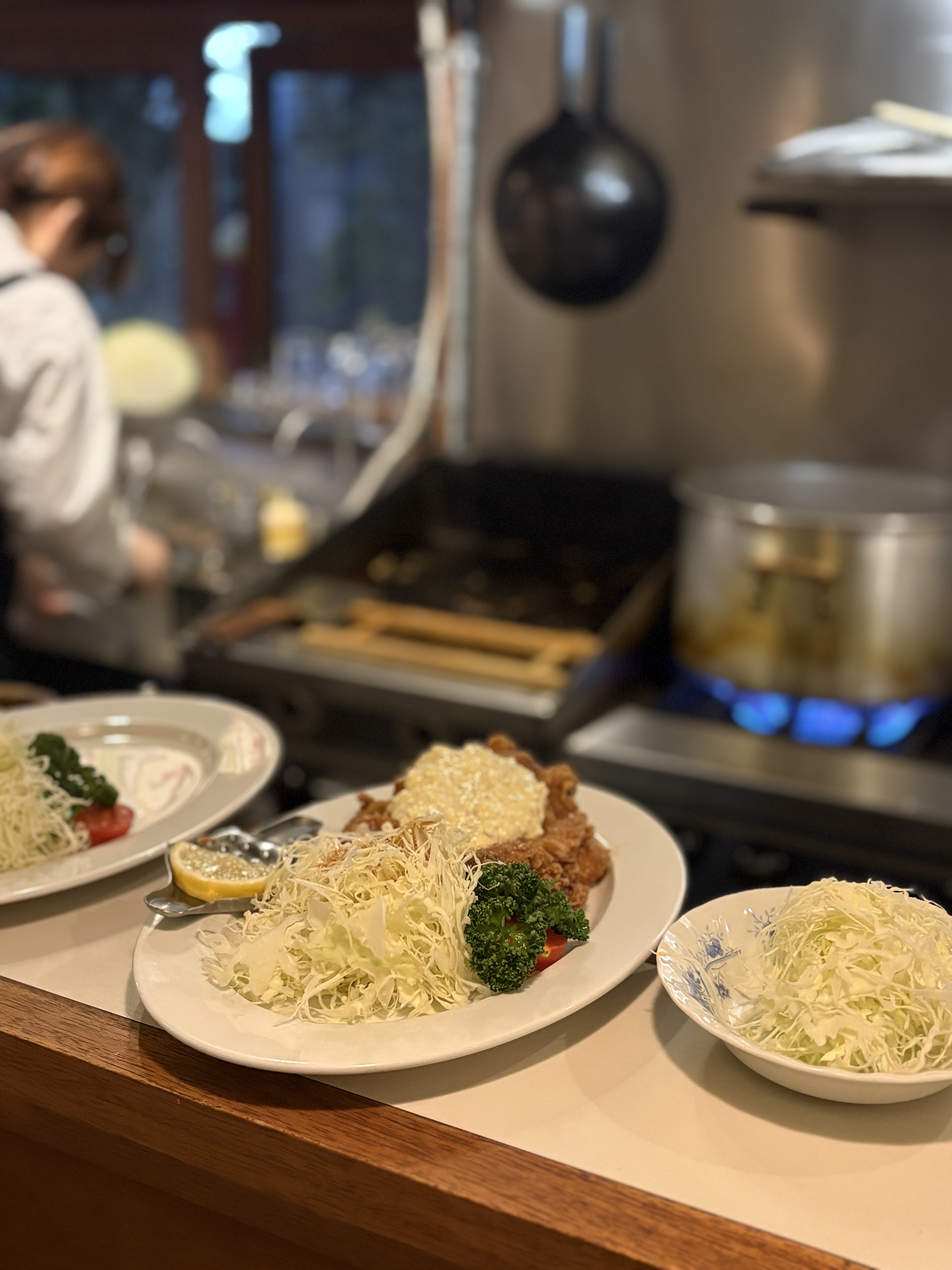 준비되고 있는 치킨난반의 모습. 향이 매우 좋습니다. 직접 만드신 타르타르소스가 듬뿍 올려져있구요, 고기를 건져내서 덜어주시는데 소스가 생각보다 굉장히 되직하게 양념되어있는 느낌이었어요.