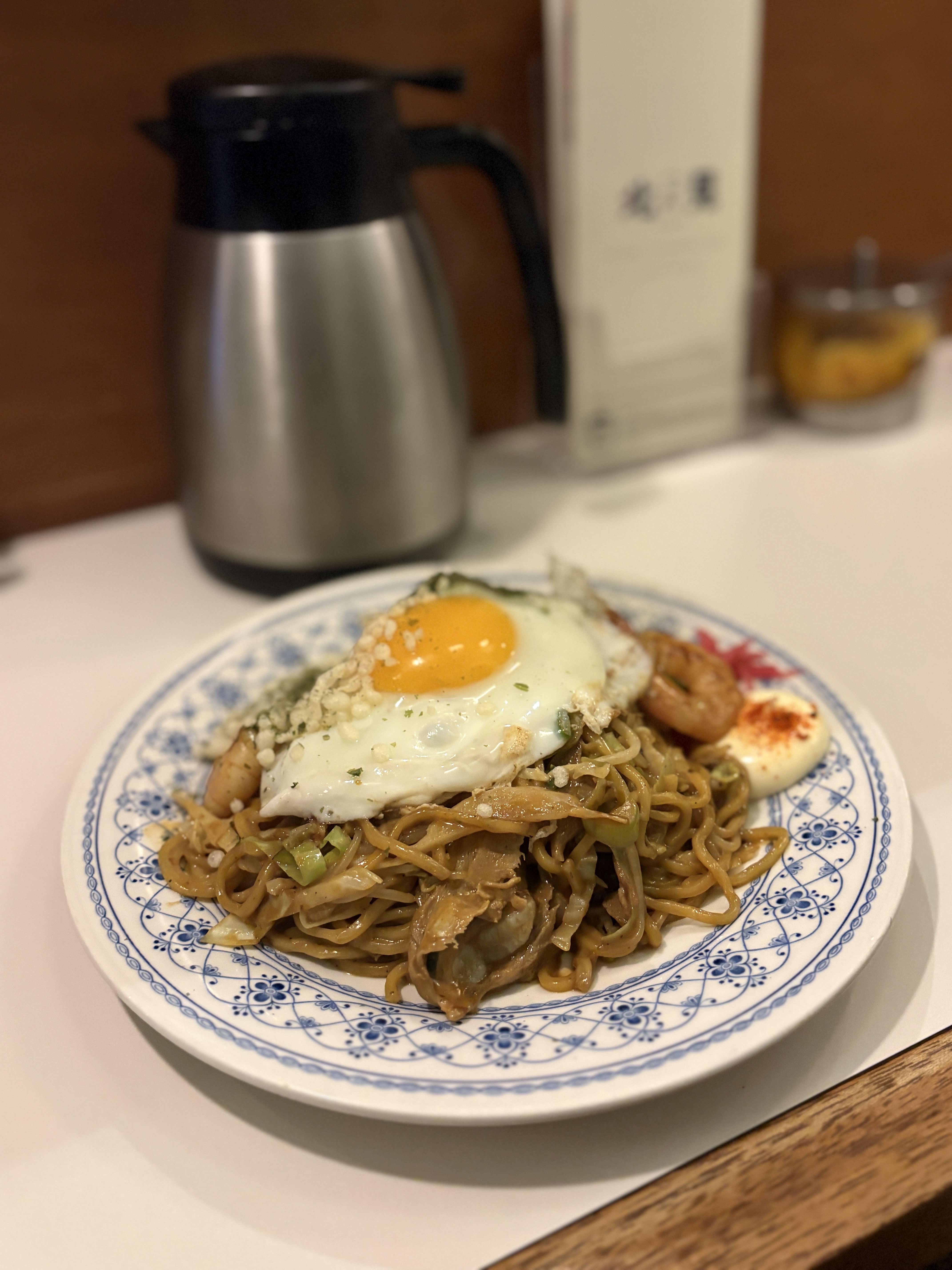 뒤이어 나온 건 디럭스 야끼소바입니다. 반숙 계란후라이가 올라가있구요, 새우같은 토핑들도 굉장히 실하게 들어있습니다. 디럭스라는 이름에 걸맞게요.