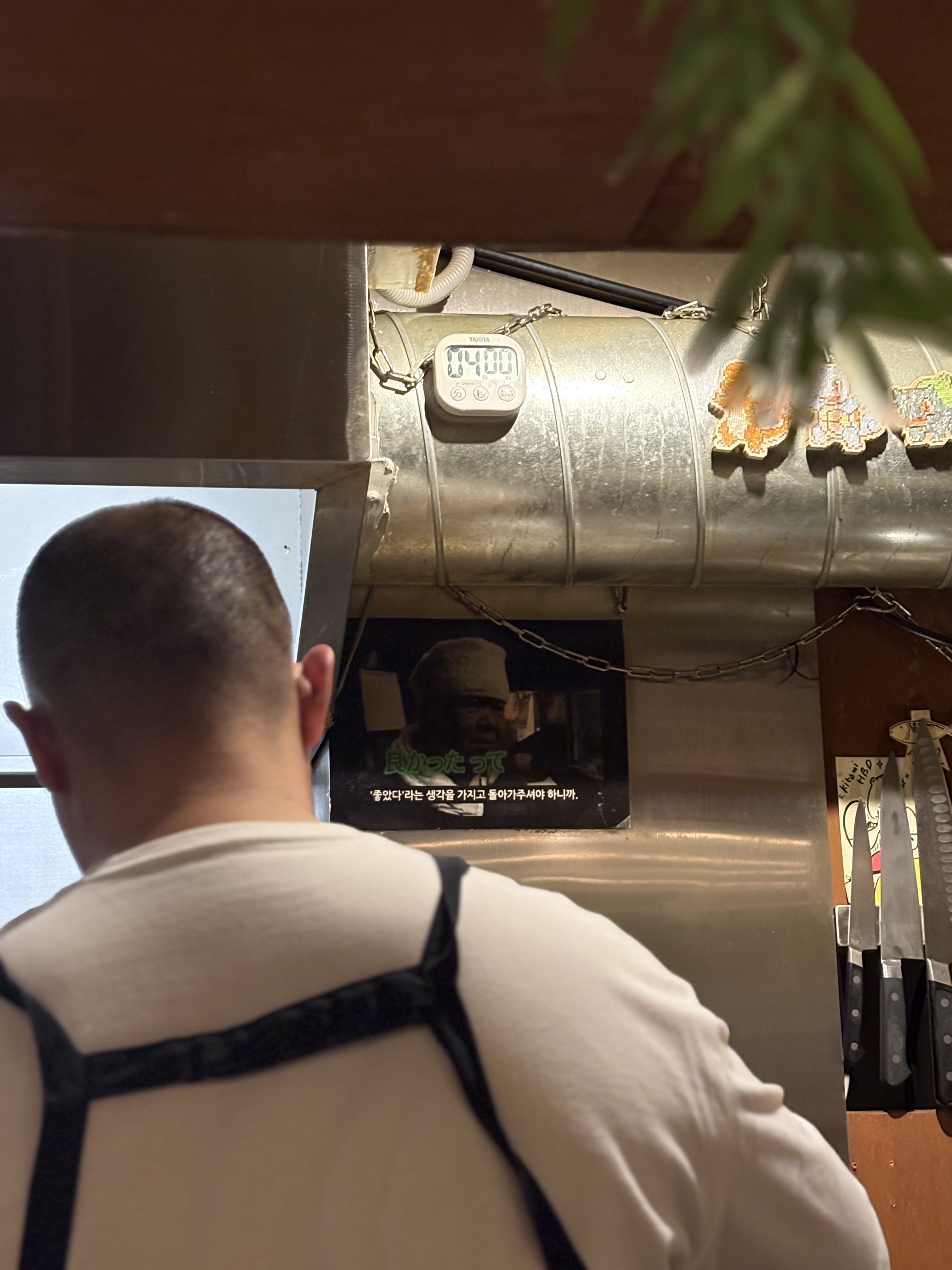 사장님의 장사 마인드를 보여주는 문구가 어깨 넘어로 보이는 장면. 사장님이 길거리에서 만나면 무서울(?)수도 있는 덩치이신데 굉장히 사근사근하시고 친절하십니다.