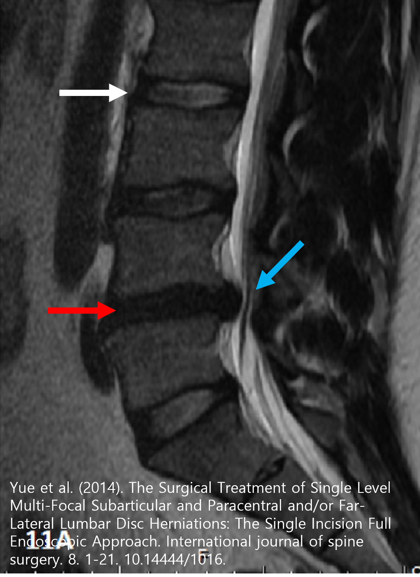 위 MRI 영상을 보시면 정상적인 디스크의 내부는 (하얀 화살표) 수분으로 인한 높은 신호강도를 보여 하얗게 보여야 하지만, 손상된 디스크의 내부는 (붉은 화살표) 수핵이 후방으로 탈출된 후 흡수가 되어 수분이 없어 저신호강도로 검은색으로 보이게 됩니다. 후방으로 탈출된 디스크 조직 (파란 화살표)는 척추체 후방에 위치한 척추신경을 압박하여 신경증상을 일으키게 됩니다.