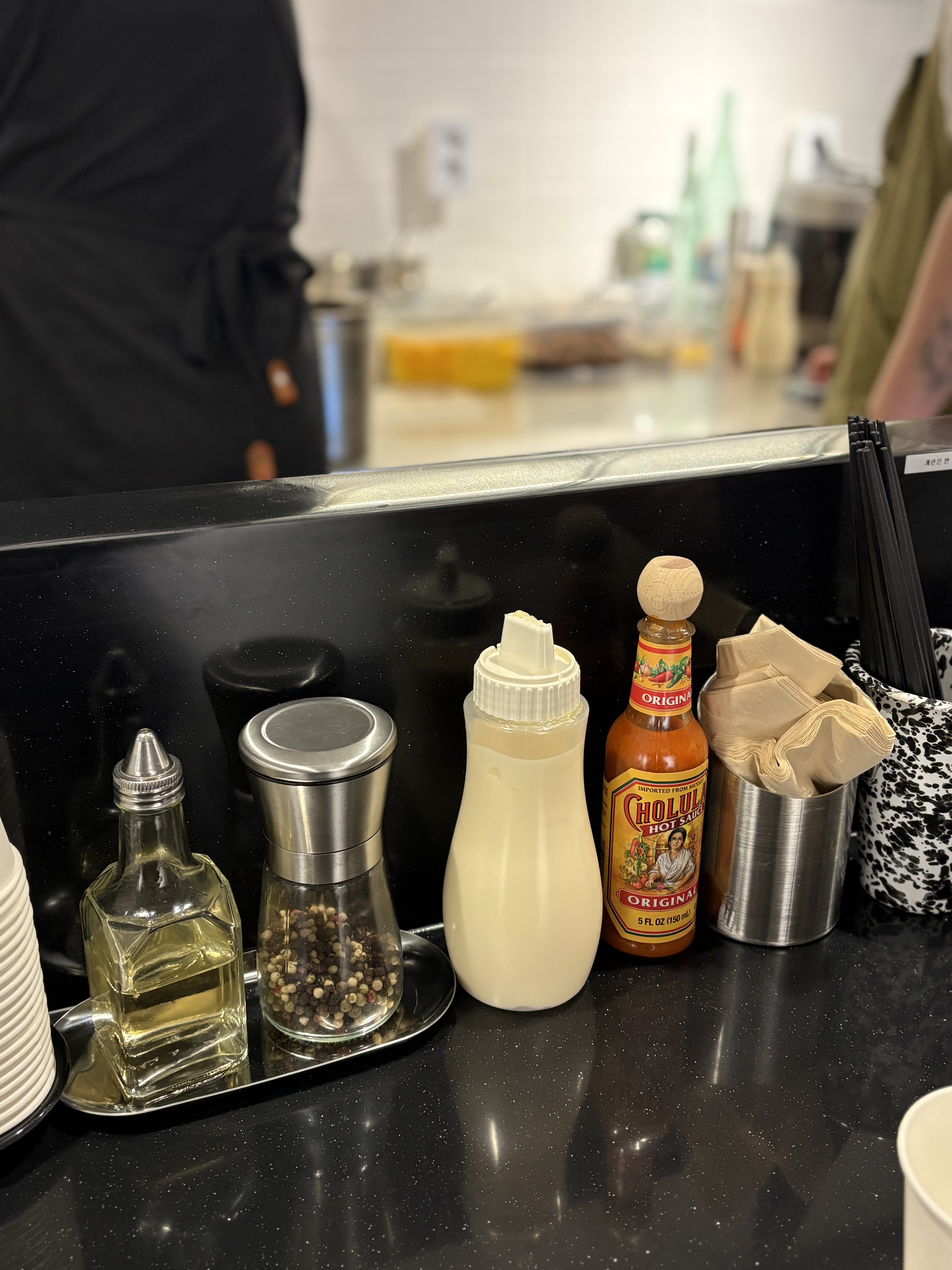테이블에는 곁들여 먹을 수 있는 여러 조미료들과 곁들이는 방법에 대한 설명문이 친절하게 적혀있습니다. 산재한 조미료들 사이에서 어떻게 먹을지 길잡이가 있으니 초심자도 놓치지 않고 즐길 수 있습니다.