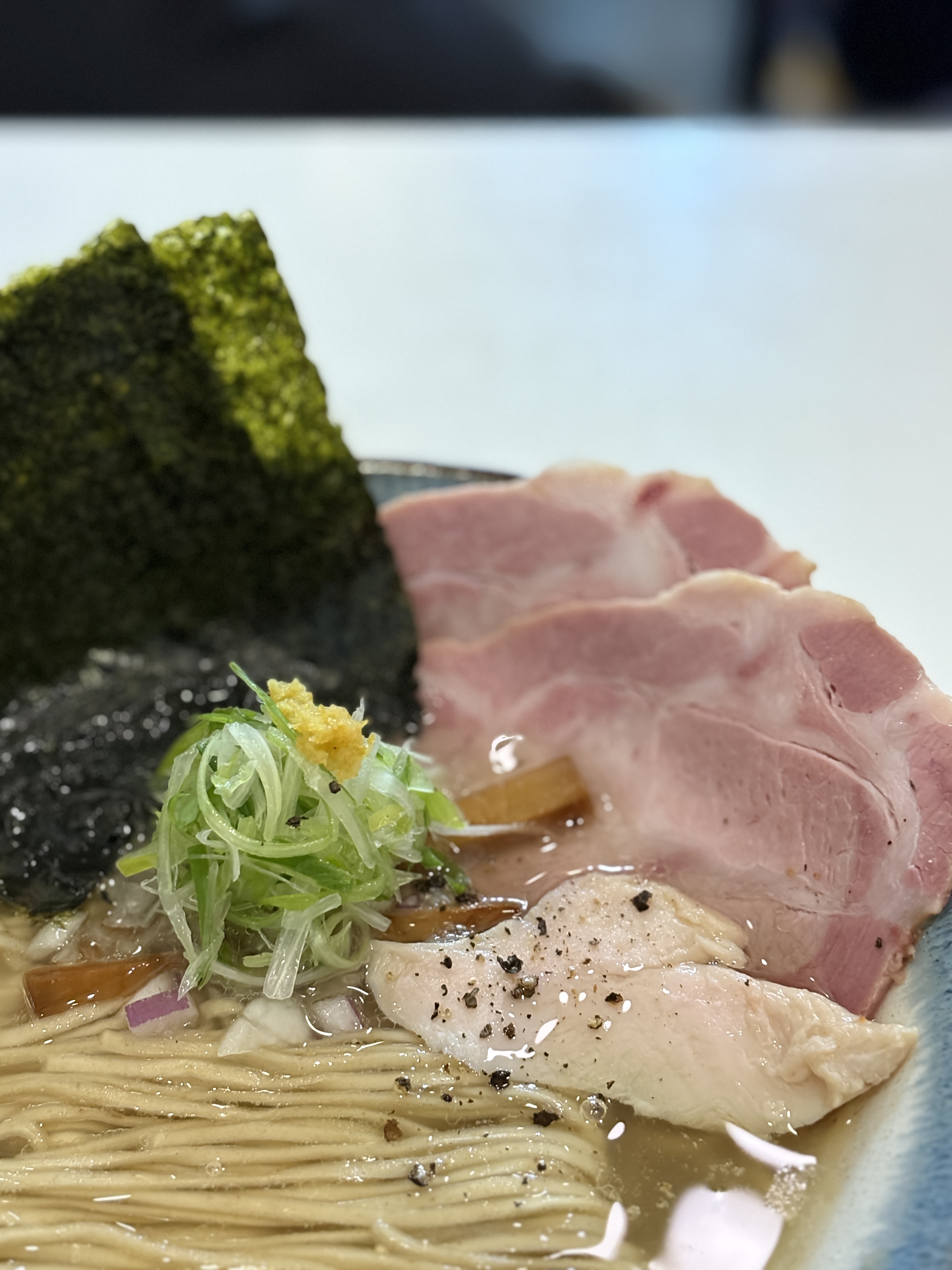 라멘 토핑의 정석이라고 할 수 있는 구성입니다. 파가 조금 뭔가 돼지곰탕에 올라갈 거 같은 느낌이긴 하네요 ㅋㅋ 닭차슈도 매우 부드럽구요, 돼지 차슈도 군더더기 없습니다. 지난번엔 추가해서 먹었지만 이날은 2라이기 때문에 기본 토핑으로만 먹었어요. 파 위에 올려진 건 유자 제스트입니다.
