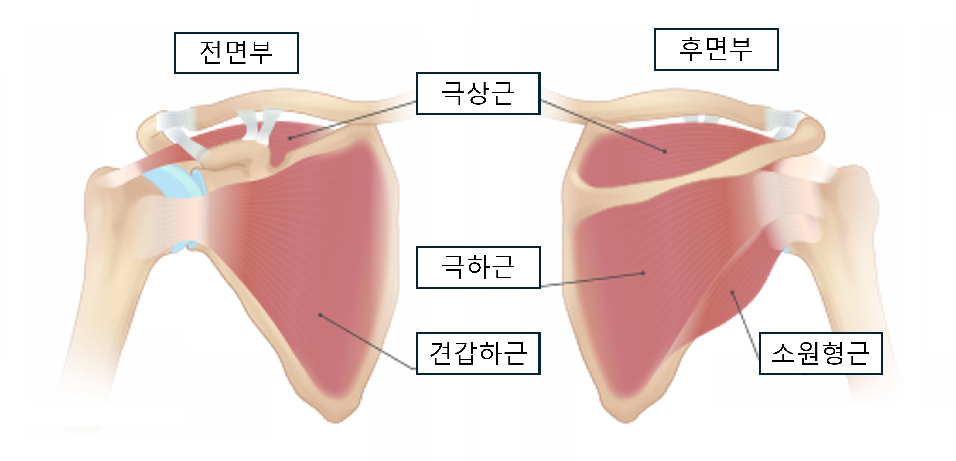 회전근개는 우리의 어깨 관절 주위에 위치하는 근육과 인대들의 집합체(근-건 집합체)를 의미합니다. 극상근(supraspinatus), 견갑하근 (subscapularis), 극하근(infraspinatus), 그리고 소원형근