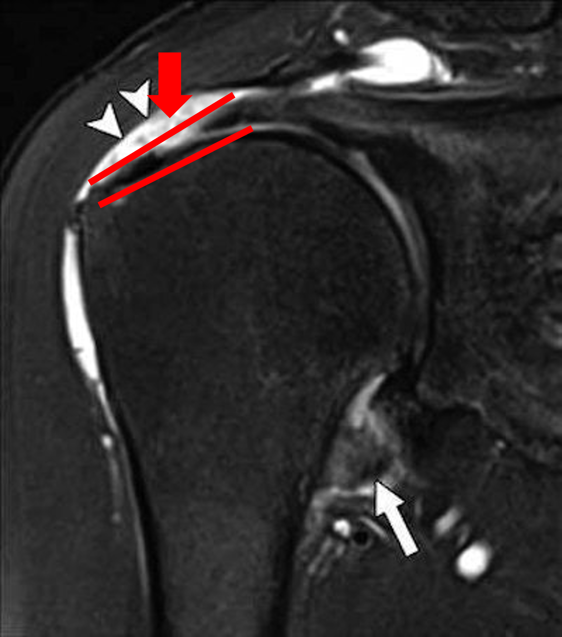 앞에서 말씀드린 회전근개 파열의 내인성 요인 중 하나인 석회가 있는지를 감별하게 해주며, 어깨를 많이 쓰는 직업을 가지신 환자분들의 경우, 극상건과 충돌하는 견봉에 퇴행성 변화중 하나인 '골극'이라는 뾰족하게 솟아오른 골조직을 확인할 수 있습니다. 이 골극이 심한 경우에는 이 골극 자체가 극상건에 손상을 가속하게 되므로, 회전근개 파열을 강력하게 의심할 수 있으며, 추후 수술 시에 단순하게 파열된 회전근개만을 봉합하는 것이 아니라, 추후 재 파열을 일으킬 수 있는 골극을 제거하기 위해서 계획을 짜는데 중요한 역할을 하게 됩니다.