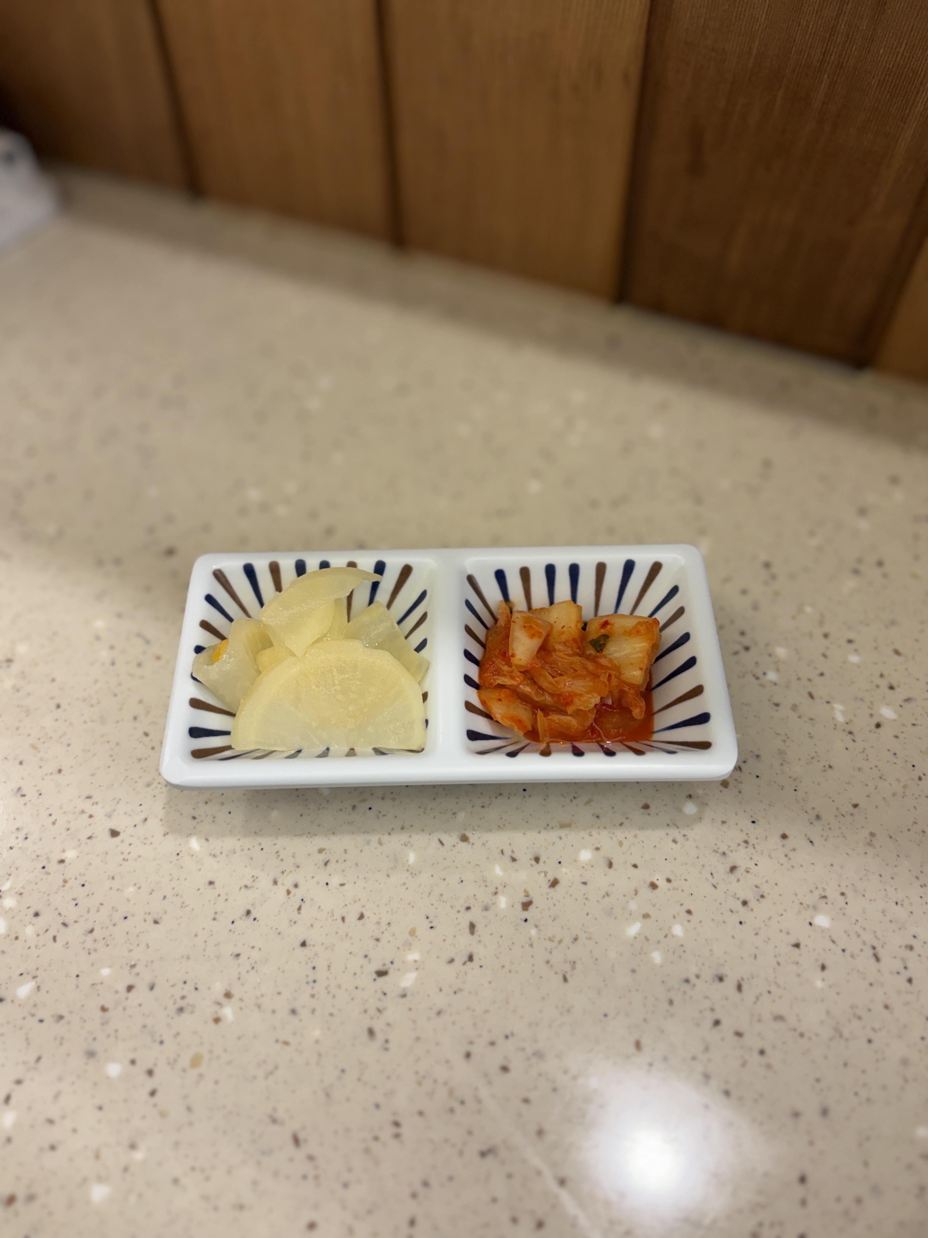 반찬이 자리마다 준비되어 있진 않았구요, 점원분이 자리마다 손님이 착석하면 가져다 주시는 방식입니다. 원하면 더 달라고 말하면 되구요, 이점이 잔반을 줄일 수는 있는데 직원분 노동력이 좀 소비되는 느낌은 없지않아 있네요.