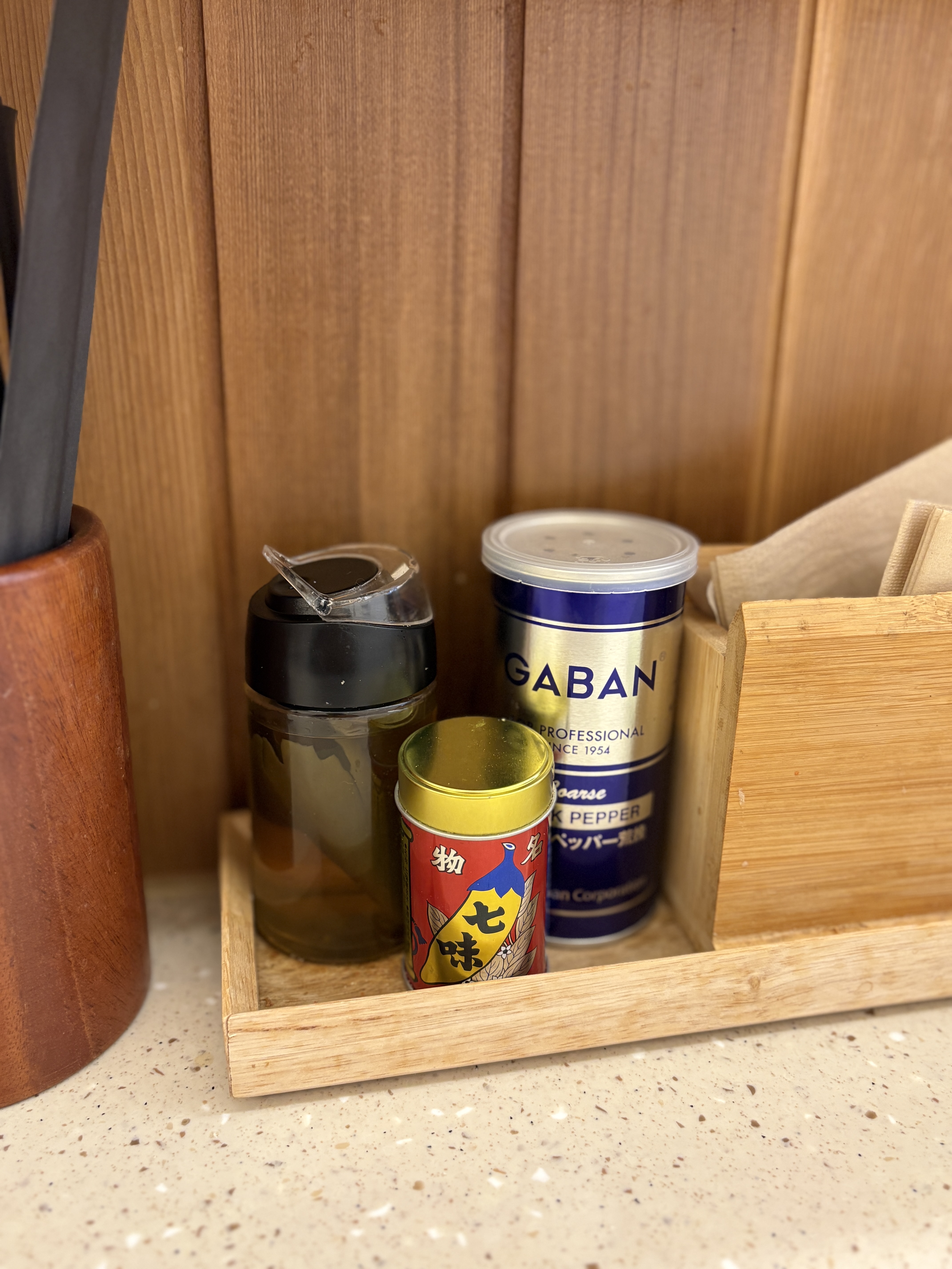 이에케 라멘을 위한 다시마식초와 가반 후추, 시치미 등이 탁상 조미료로 준비되어 있습니다.