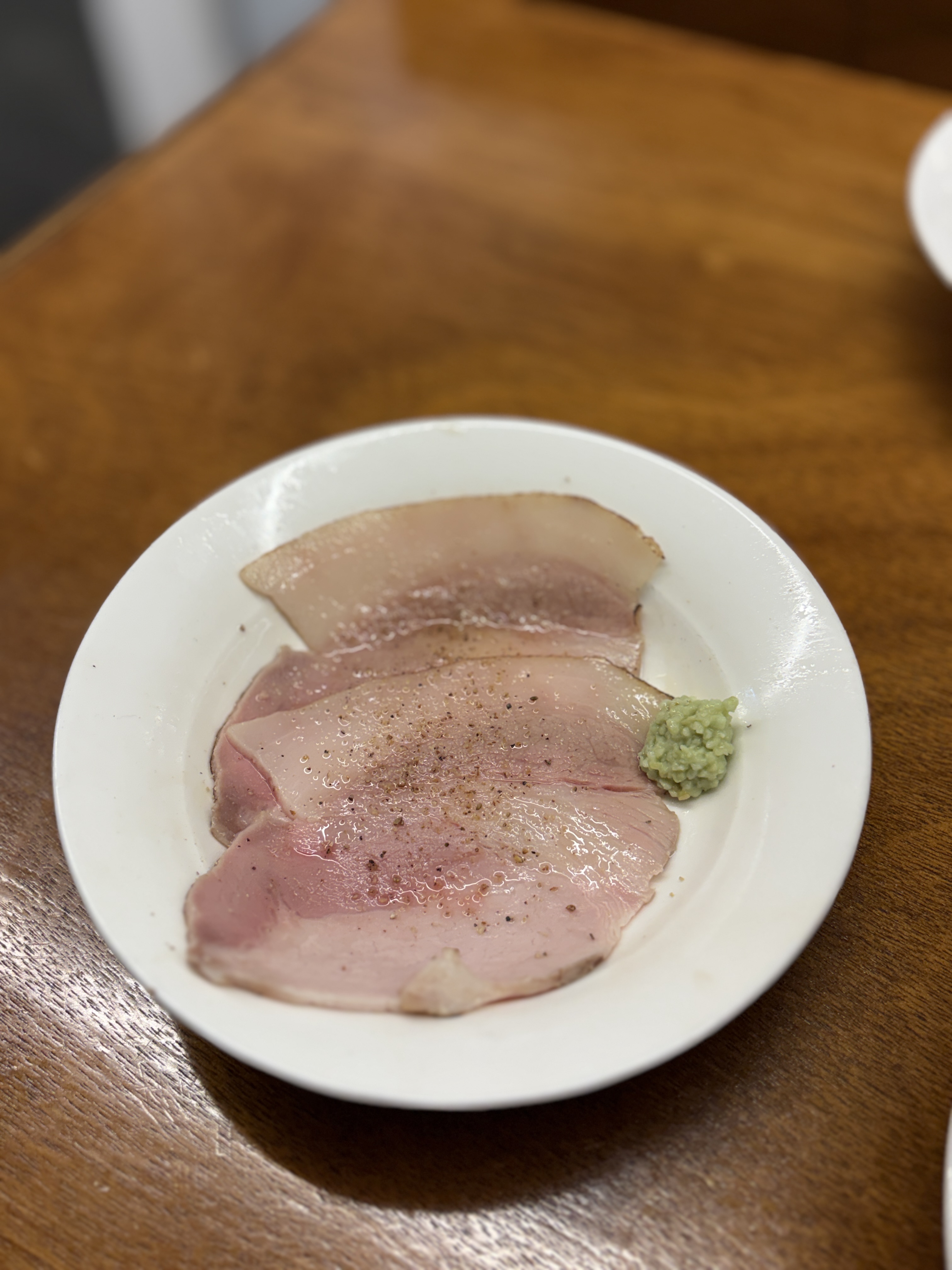차슈를 따로 추가하면 이렇게 접시에 내어주시구요, 나오기전에 토치로 아부리를 해주십니다. 그리고 와사비까지 주시는데, 불을 쬔 차슈에 와사비 먹으니 야키니쿠 집에서 먹는 맛이나네요 ㄷㄷ