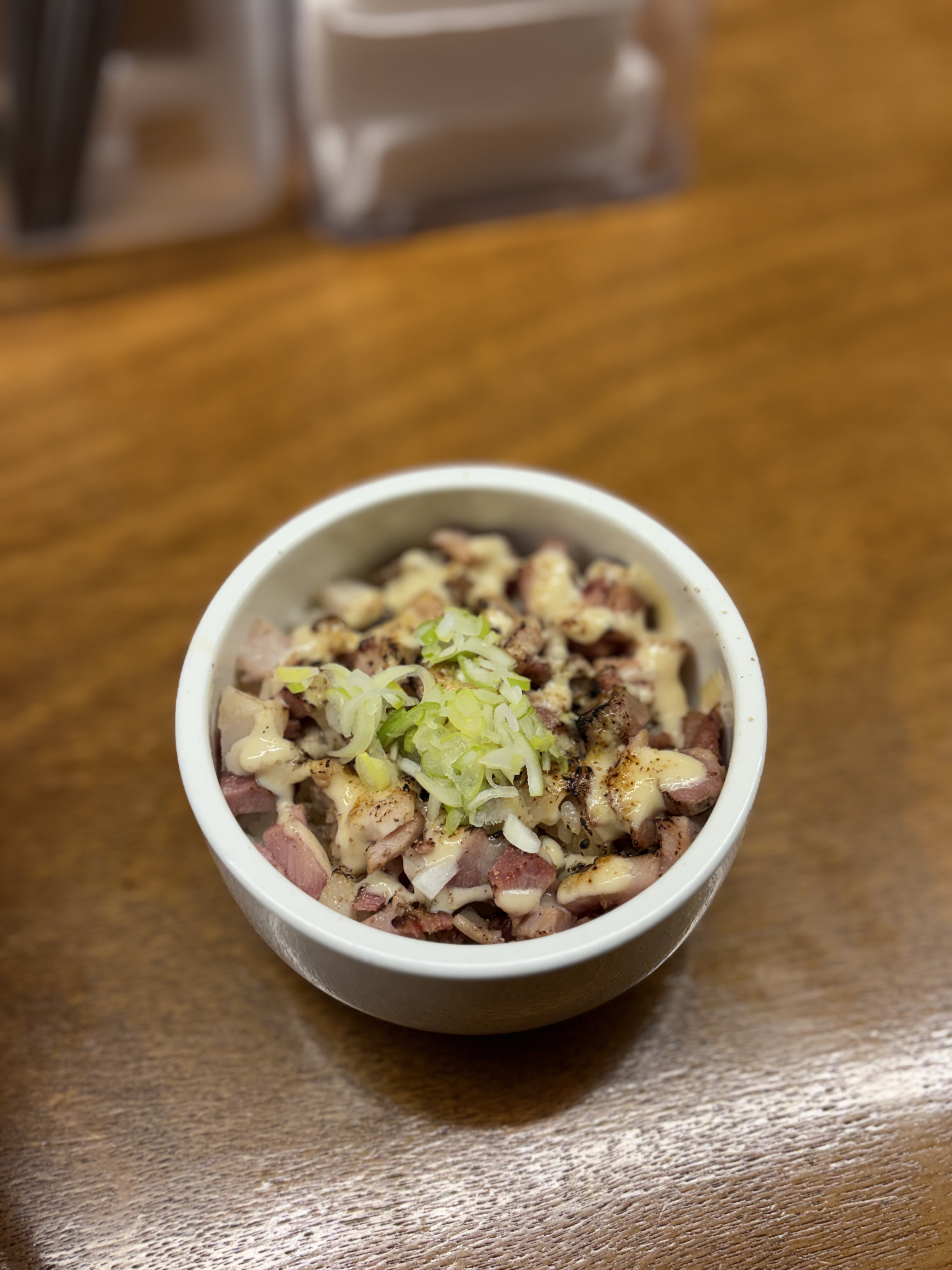 적양파와 센기리한 대파를 살짝 얹어주셨구요, 그 밑에는 레몬제스트도 놓여있습니다. 짜고 기름지게 옵션을 선택해서 기름층도 꽤나 있는 편. 나왔을 당시에는 잘 안느껴지는데 스프를 저어보면 기름층이 퍼지면서 양을 가늠할 수 있게 됩니다.