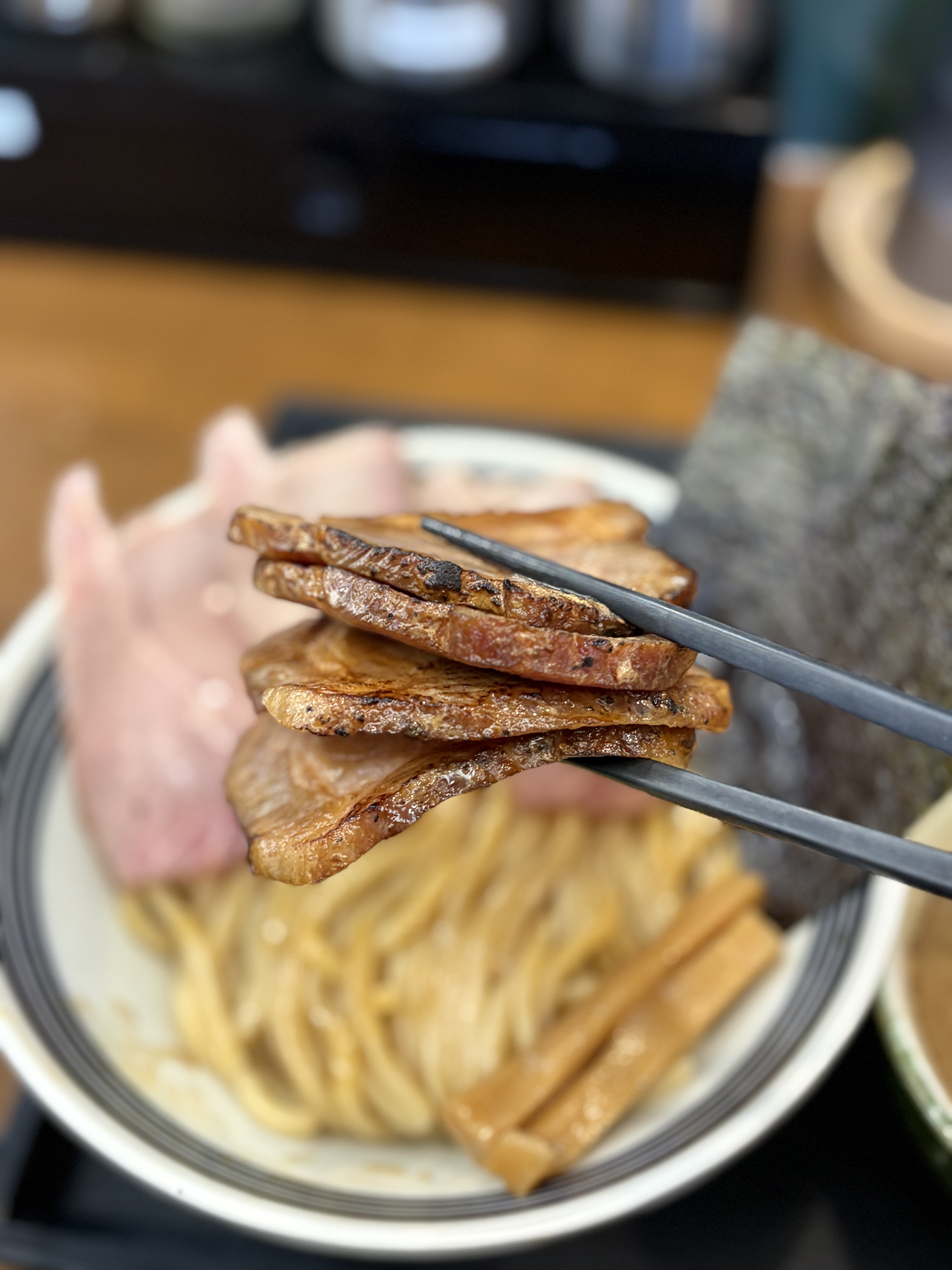 추가한 간장차슈를 들고 한컷.. 간장이 타면서 마이야르의 효과와 더불어 참기 힘든 풍미를 선사합니다. 이곳 간장차슈는 추가하는 것을 100% 추천드립니다.