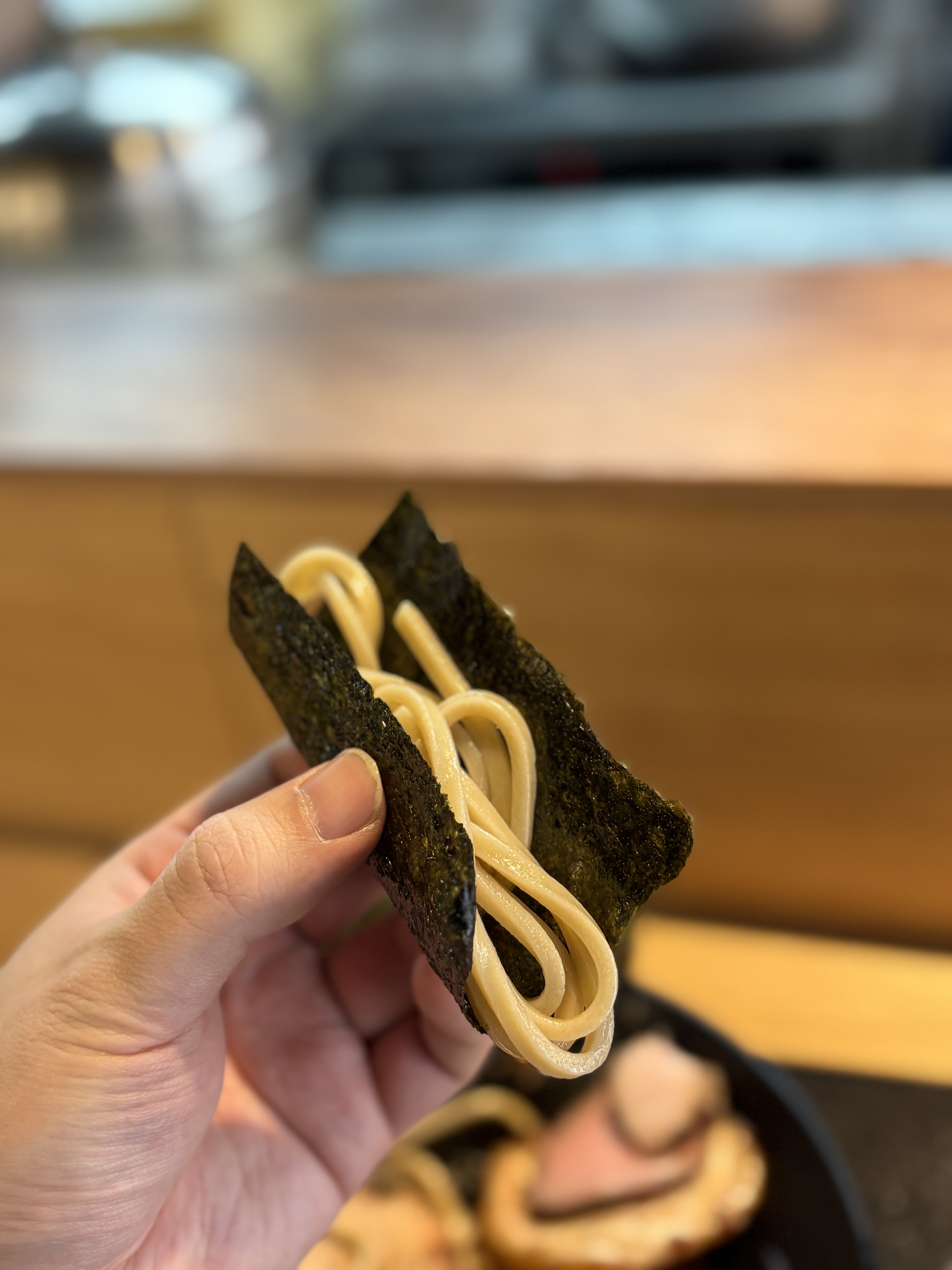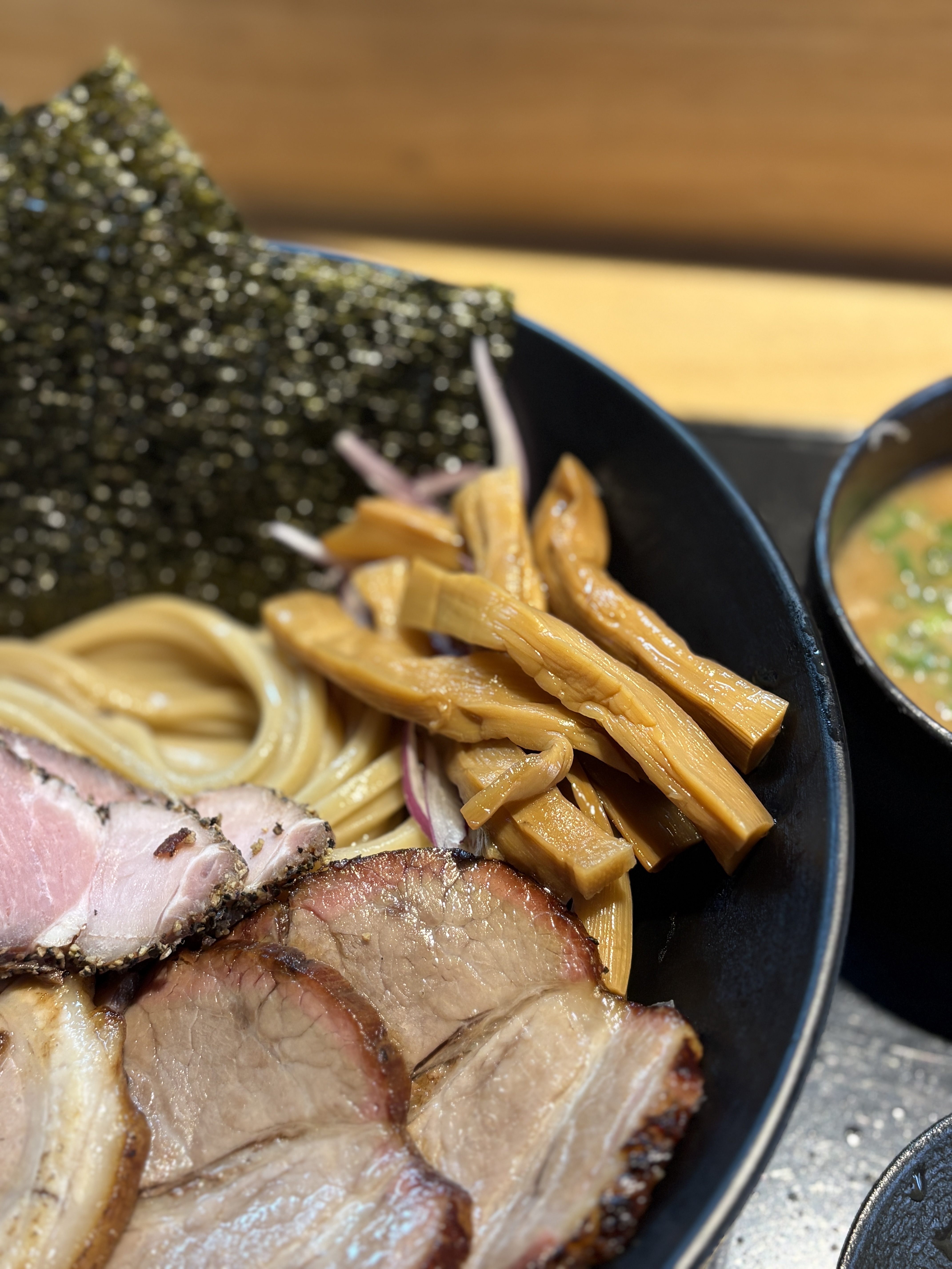 김 맛집으로도 유명하다보니 이렇게 김에 면을 싸서 츠케지루에 찍어먹어도 맛있습니다. 단짠의 각이 살아있는 넓은 김. 다음엔 김을 더 추가해야지!