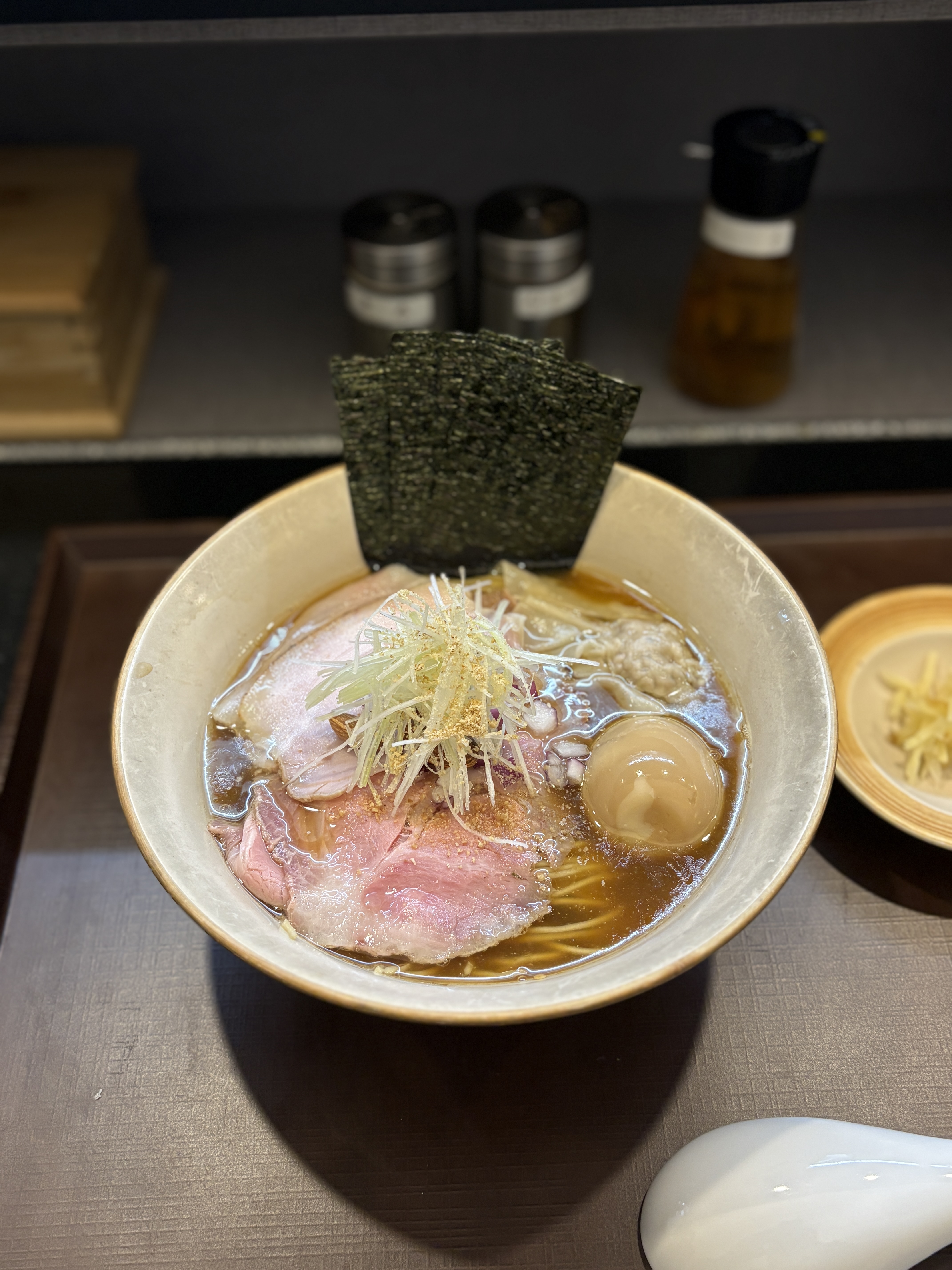 등심과 목살 차슈들이 보이고, 특선 쇼유라멘에 추가되는 아지타마고와 완탕 등도 보입니다. 멘야준 출신인 것이 잘 드러나는 구성입니다. 적어도 한국에서는요 ㅎㅎ 향미유의 빛깔이 뚜렷하게 구분되지는 않습니다만 층이 꽤나 져 있습니다. 센기리한 대파도 양이 꽤나 넉넉한 편.