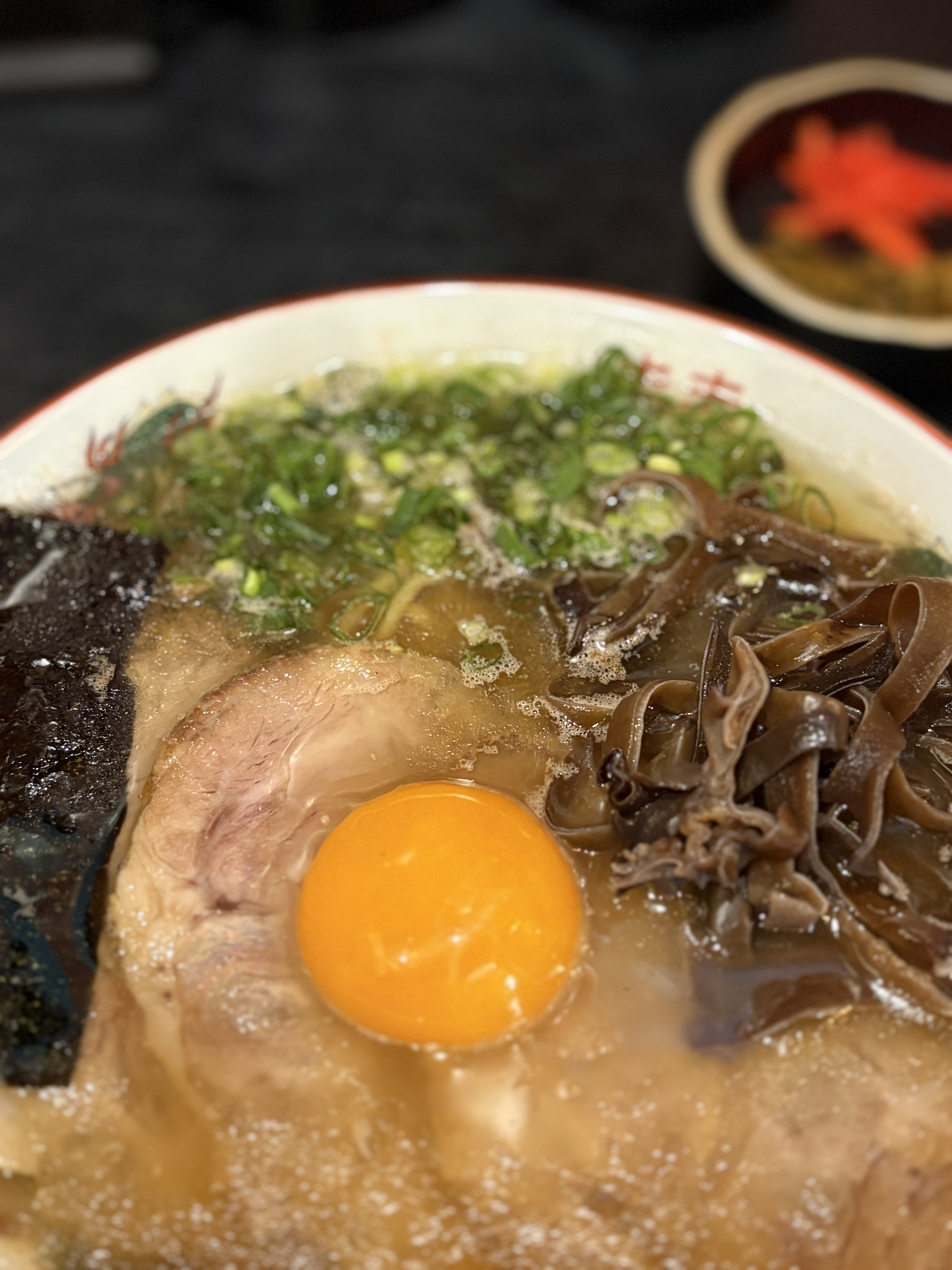 이전 버젼은 매장 들어왔을 때부터 일단 돼지냄새가 진동을했구요, 점도는 찰랑이지만 보시다시피 갈색빛이 짙게 감도는 느낌이었습니다. 이번에는 청탕에 가까울 정도로 맑은, 그러나 아래층에 쌓인 레이어는 어느정도 탁도를 가지고 있는 묘한 비주얼이었습니다. 냄새 자체도 이전의 꼬릿함은 거의 느껴지지 않았습니다. 그래서 사실 우려가 되었던 부분도 있습니다. 쿠사이 돈코츠라는 이름이 가지는 의미가 퇴색된 건 아닐까 하는.. 그러나 기우였어요 ㅎㅎ