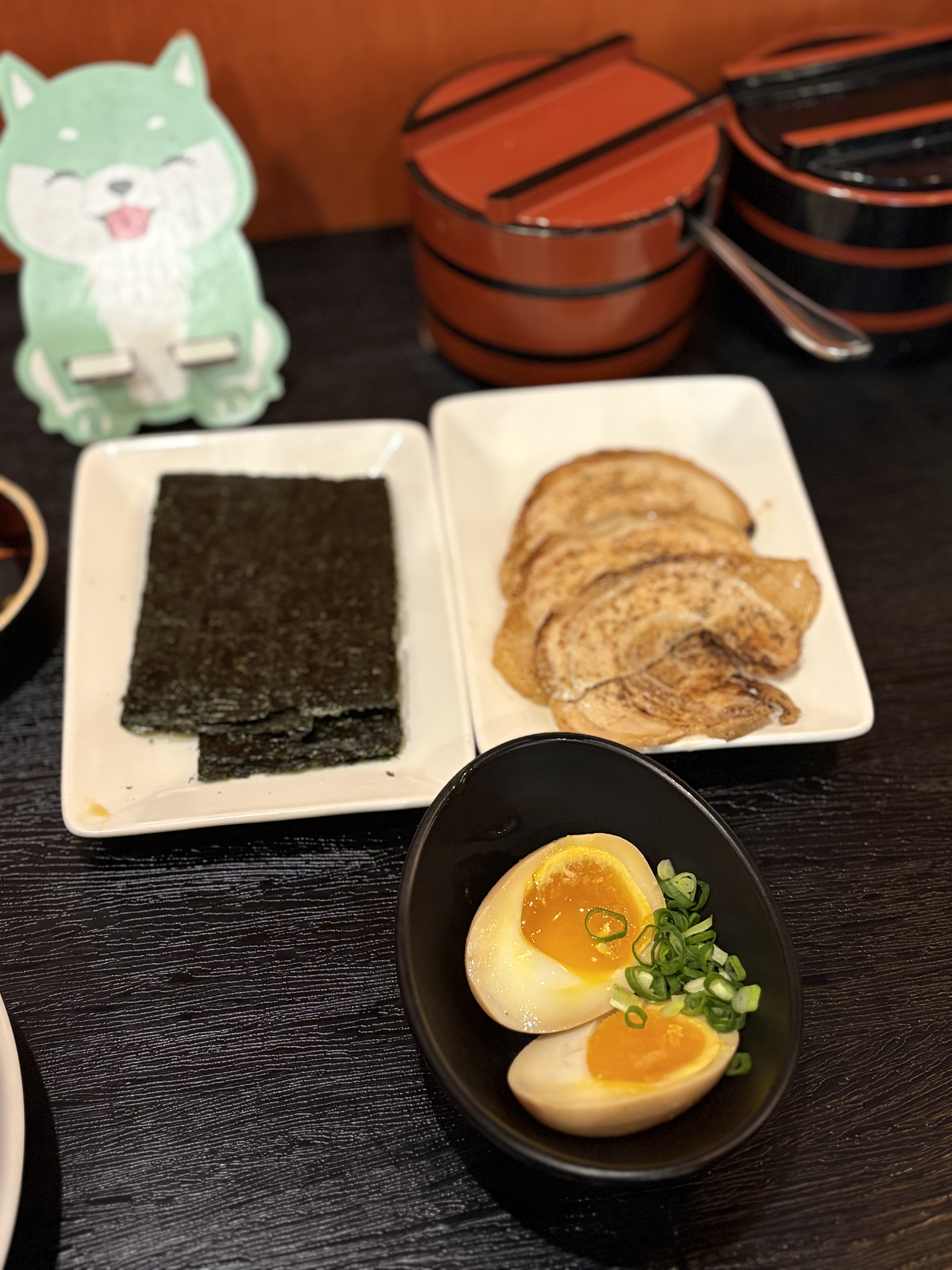 자리마다 자리잡은 귀여운 강아지 휴대폰 거치대. 앞에는 주문표를 꽂아둘 수 있는 공간이 있어서 주문 오류를 방지해줍니다. 오늘의 주문은 쿠사이돈코츠에 차슈와 김 추가. 음료는 반가운 우롱차를 주문했습니다.