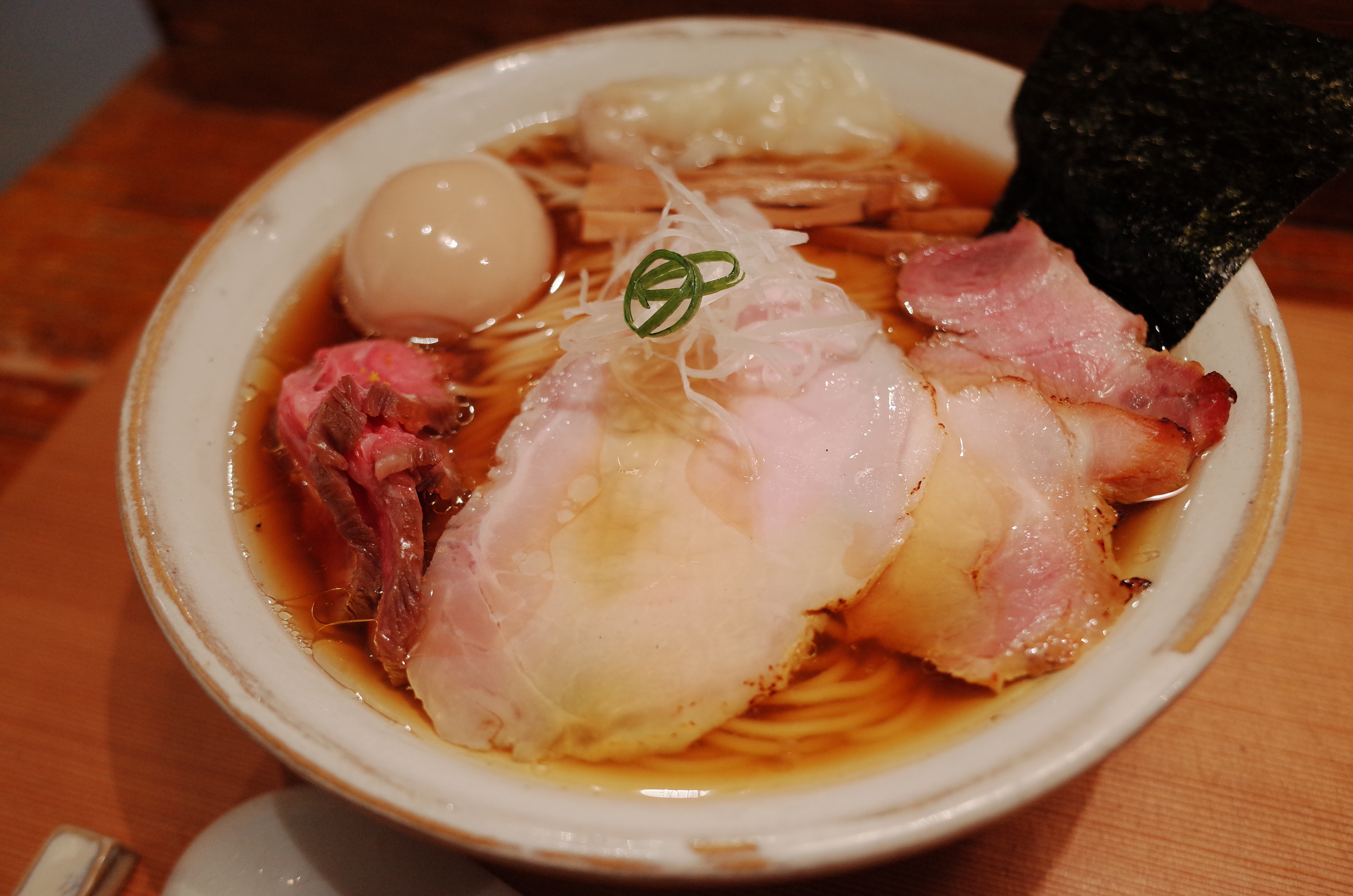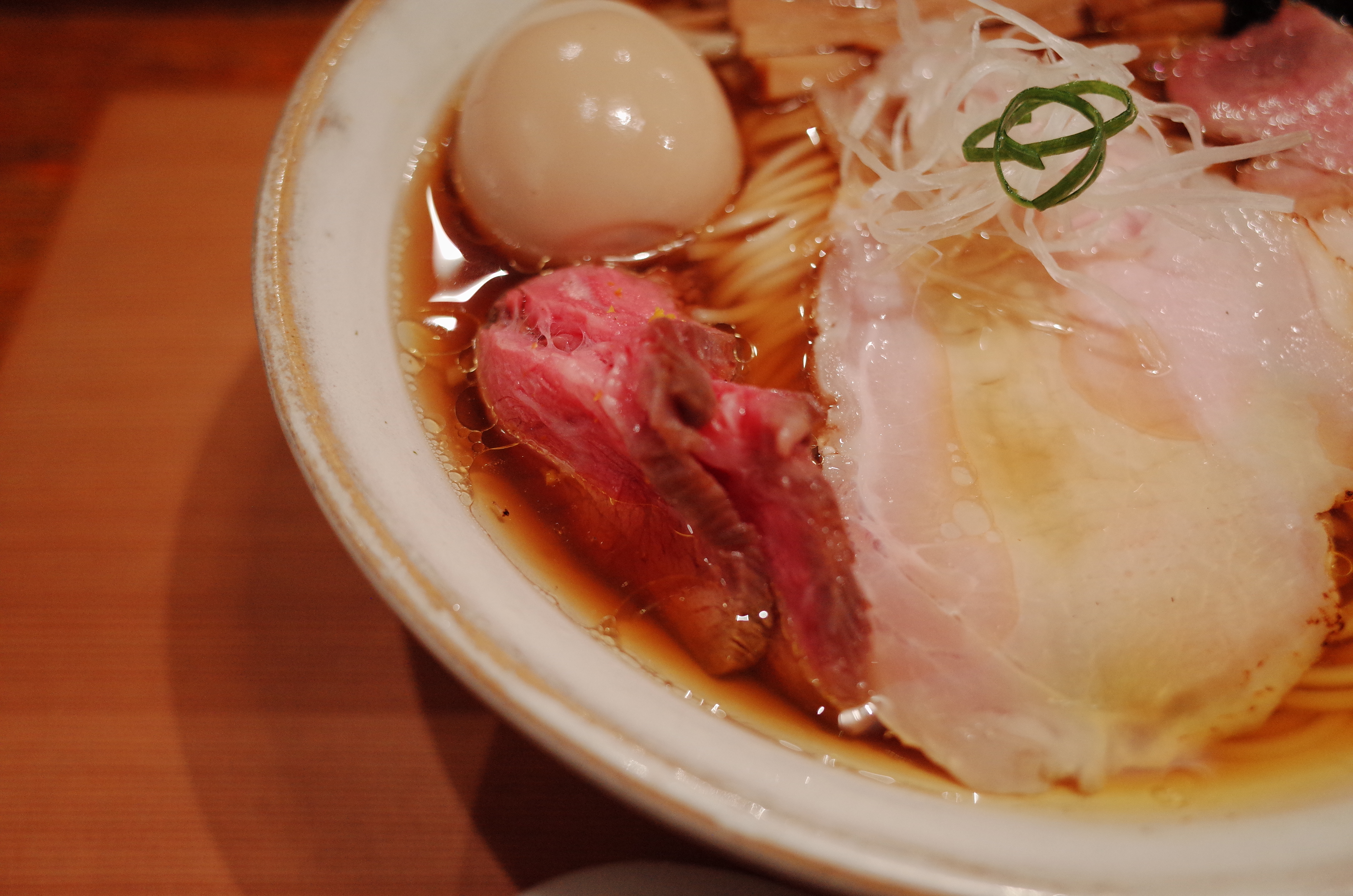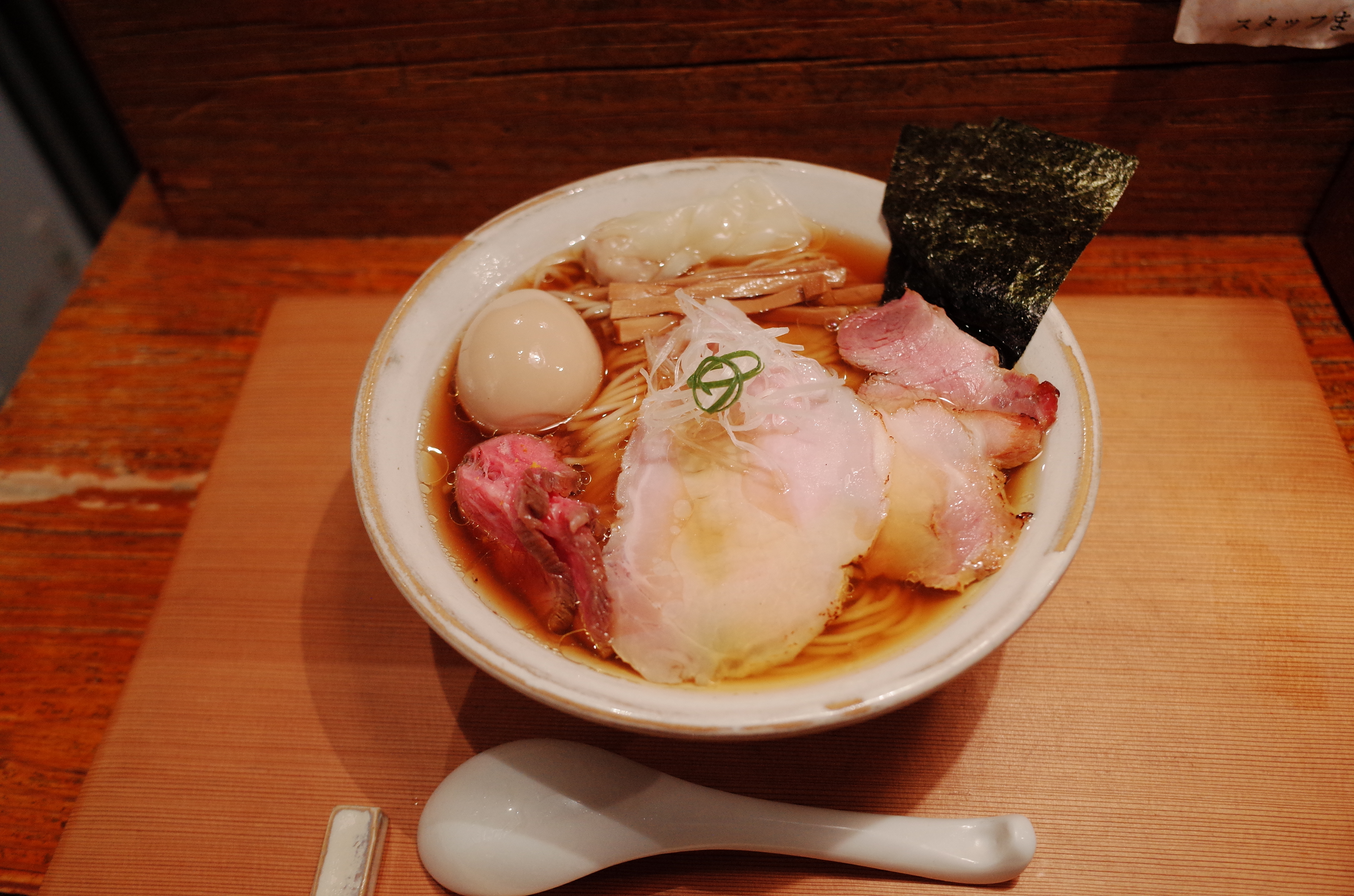 다음으로 나온 메뉴는 현재의 무기나에의 명성을 만들어준 라멘. 특선 쇼유라멘(特製醤油らぁめん). 나오자마자 아름답다는 말이 절로 나오는 담음새. 원래 맛있는 라멘을 먹으면 차슈를 추가하는 버릇이 있지만 이 곳은 그 담음새의 미학을 망치고 싶지 않아서 참았습니다.