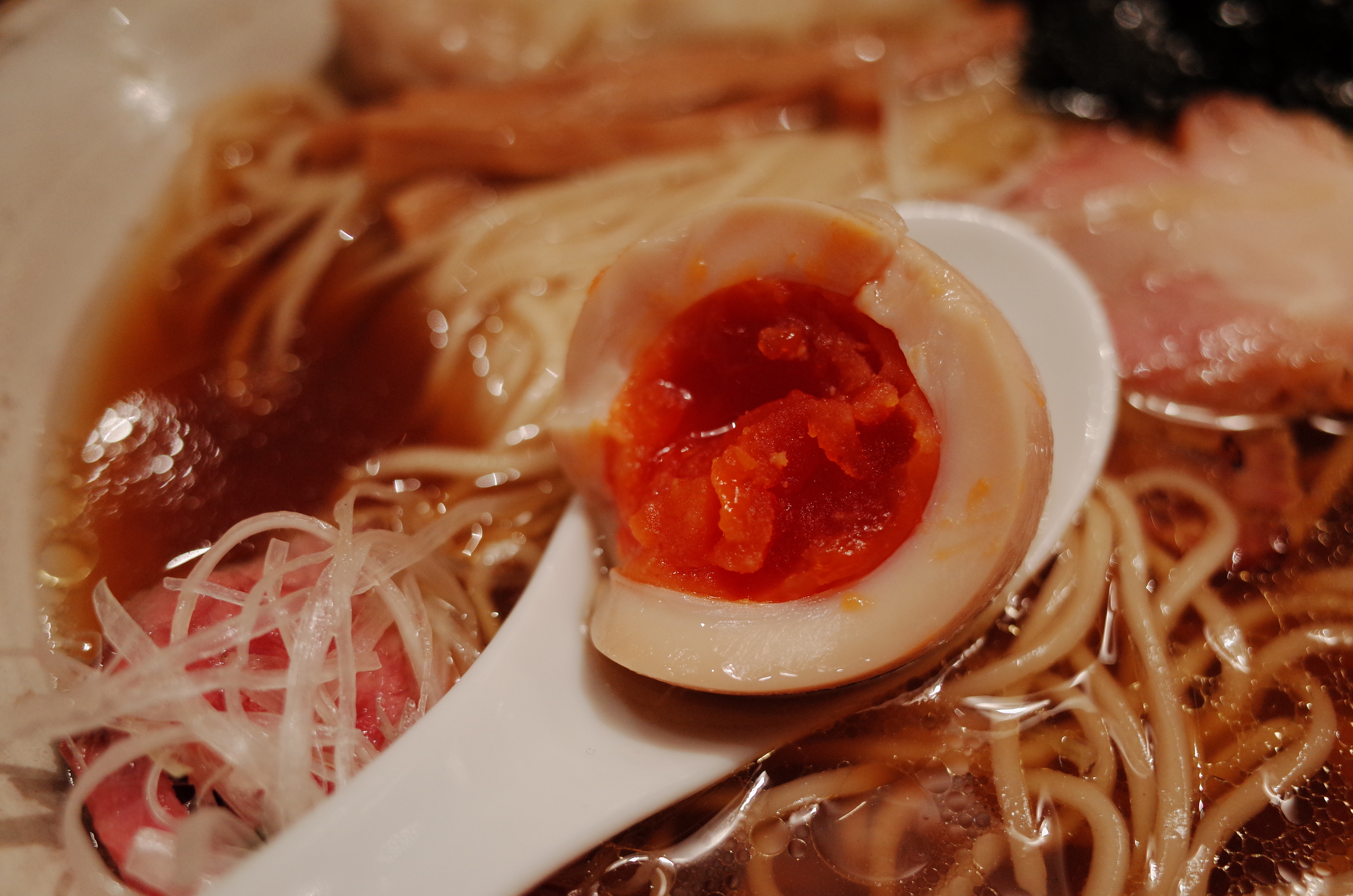 일본 라멘 토핑의 특징인 주황색에 가까운 아지타마고. 필터 씌운것도 아니구요 진짜 색깔이 이런 다크한 오렌지 색이었습니다. 너무 맛있어요..