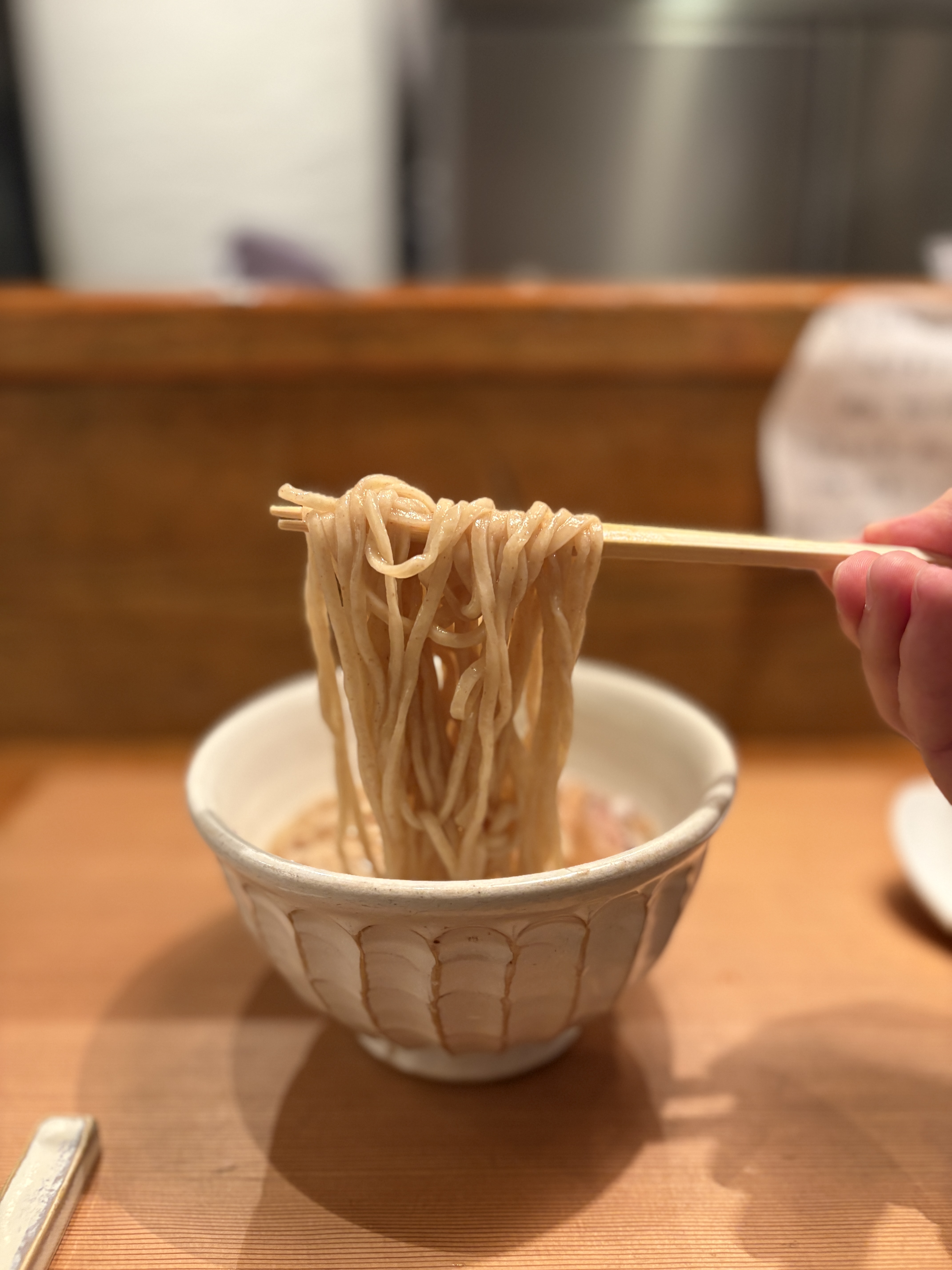 무기나에 라멘의 핵심 축인 자가제면. 츄보소스트레이트 ( 中細ストレート), 즉 중세면이자 스트레이트 면입니다. 훗카이도산 최고급 밀가루인 하루요코이(春よ恋)를 사용했다고 알려져있는데요, 부드러움과 탄력의 밸런스가 굉장히 훌륭하면서 밀향이 풍부한 면입니다. 이후에 먹었던 이이다쇼텐의 면이 확실히 더 부들부들하다는 느낌이었구요, 무기나에의 면은 부들거림은 있지만 식감이 명확하게 느껴지는, 그리고 씹으면서 입안에 퍼지는 밀향이 매우 아름다운 면이었습니다. 빨아들일 때 표면도 스트레이트면 특유의 매끄럽게 빨려들어가는 쾌감도 좋았구요.