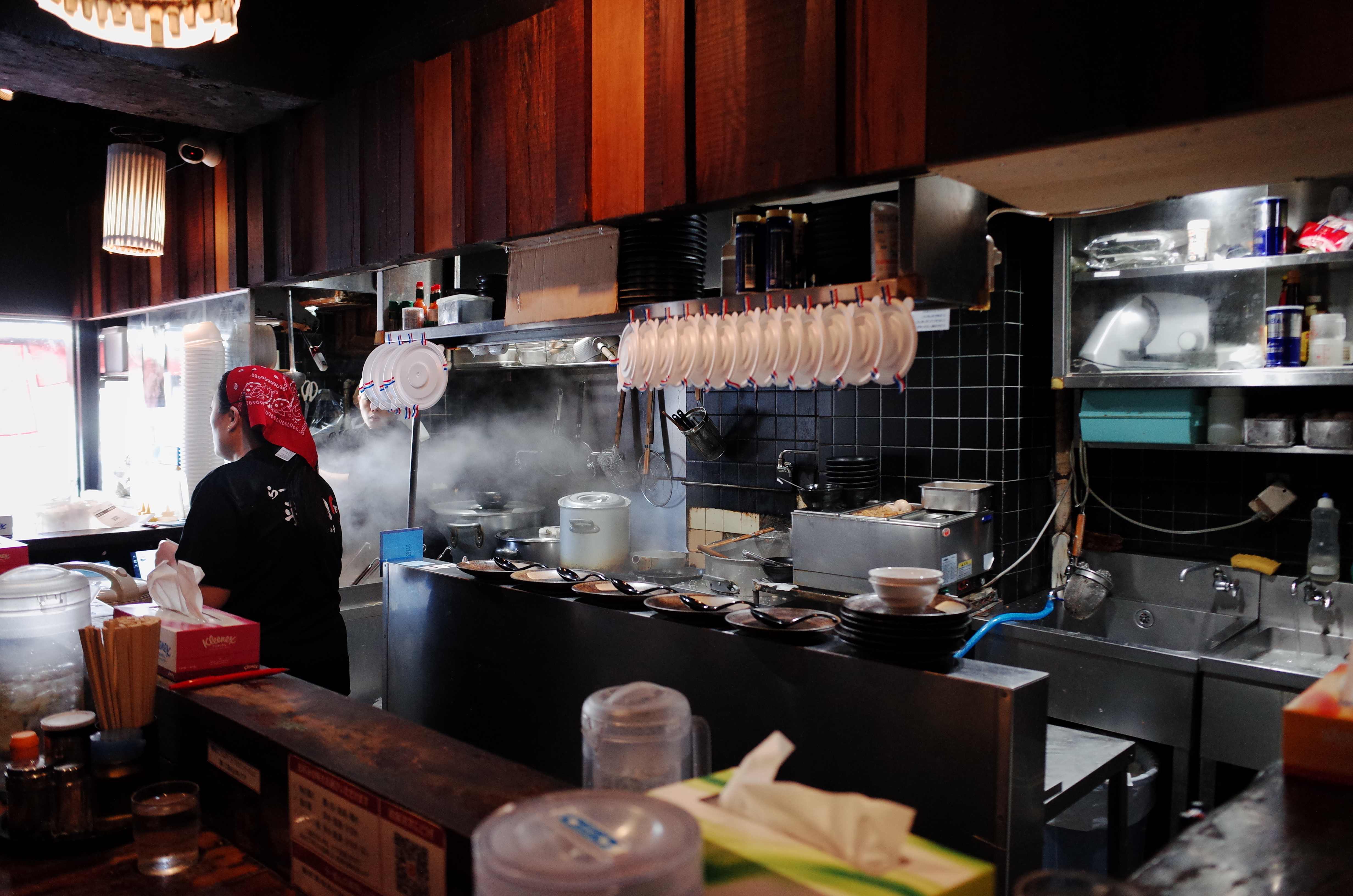 역사와 전통이 깊은 명점이지만 내부는 소박했는데요, 심지어 포장주문까지 가능한 곳이어서 다량의 포장용기들이 위에 매달려 있는 모습이 매우 신기했습니다. 우리나라와 달리 점심에 라멘으로 끼니를 해결하는 직장인들이 많다보니 이렇게 주변 오피스에서 일하는 분들이 와서 포장해가는 모습을 볼 수 있었어요. 배달도 물론 가능했구요. 배달 라멘이라고 하면 좀 낮은 급으로 보는 우리 나라의 모습과는 좀 다른 모습이지요? ㅎㅎ 직원은 총 3분이서 근무하고 계셨구요, 여자분이 주문을 받으시고 남자분 두분이 라멘을 만들어내고 계셨습니다. 여자분이 영어가 거의 안되서 사실 주문할 때 조금 힘들긴 했습니다만 눈치는 있으셔서 알아서 잘 해주십니다.