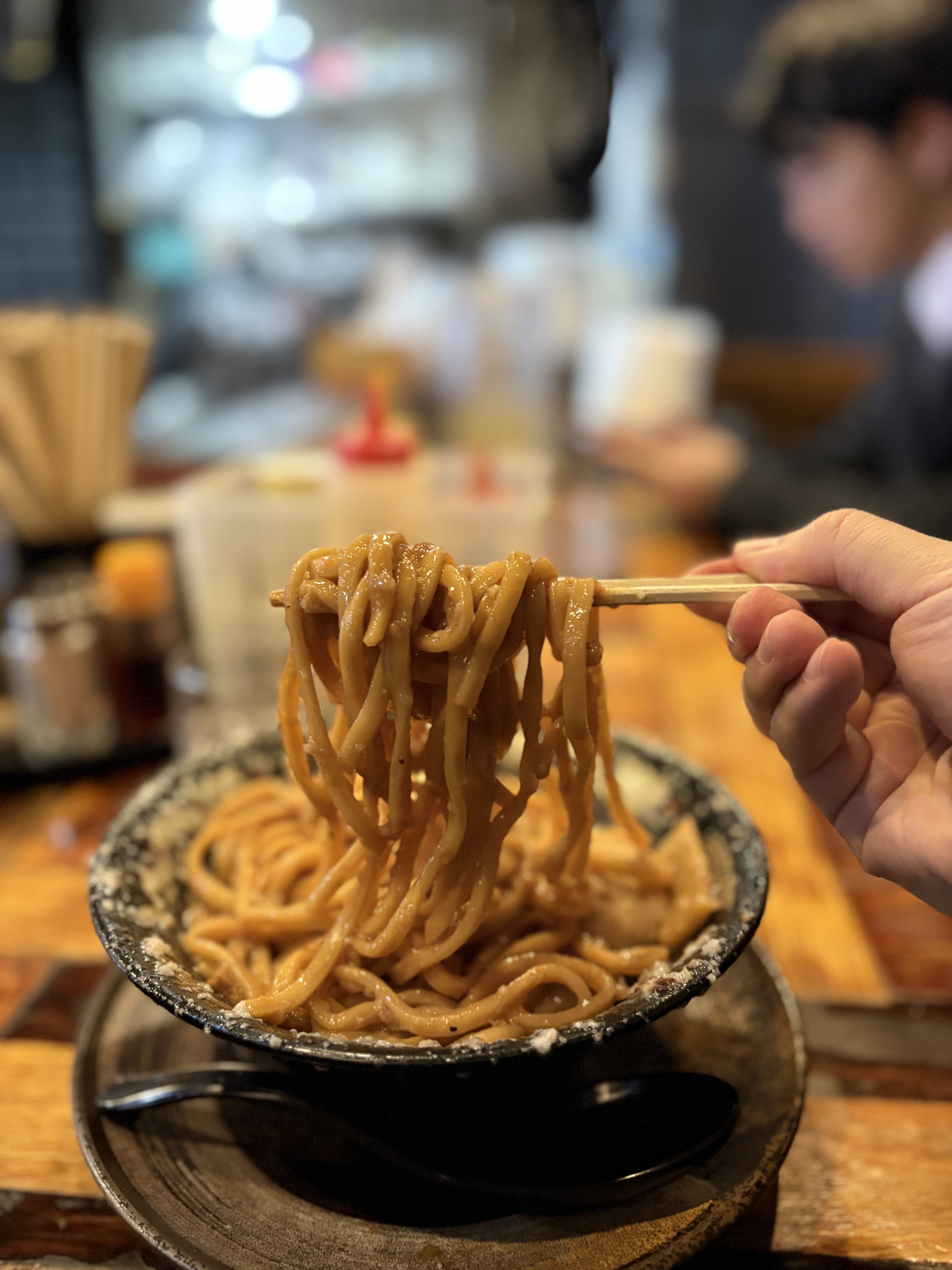 지로라멘의 천지 뒤짚기처럼 아래에 깔려있는 면을 위로 올려봅니다. 진한 타래를 머금은 극태면이 보입니다. 온도감도 괜찮았구요, 극태면이 주는 특유의 식감이 인상적인 라멘입니다. 저항감이 있는 면으로 익힘 정도가 심지가 느껴질 정도입니다. 탄력도 꽤 강한편. 꼬들한 면을 싫어하시는 분들에게는 불호일 것 같습니다만 전 이건 이것대로 좋아라 하는지라, 게다가 그런 것에 비해서 면이 흩뿌려진 지방과 타래를 타이트하게 잡고있어 여기서 맞는 표현일지 모르겠지만 '일체감'이 굉장히 뛰어납니다. 가끔 비빔 라멘 중에서 소스와 흡착이 제대로 안되서 밑바닥이 흥건한 라멘들이 있는데 개인적으로 정말 불호거든요. 비빔라멘이라면 이렇게 저가수면을 이용해서 강하게 타래를 잡아줘야한다고 생각합니다. 면이 잔뜩 붙잡고 있는 타래는 쇼유 베이스지만 감칠맛 위주로 느껴지고 짠맛은 세아부라의 뭉근한 단맛에 의해서 중화되서 기분좋게 마무리됩니다.