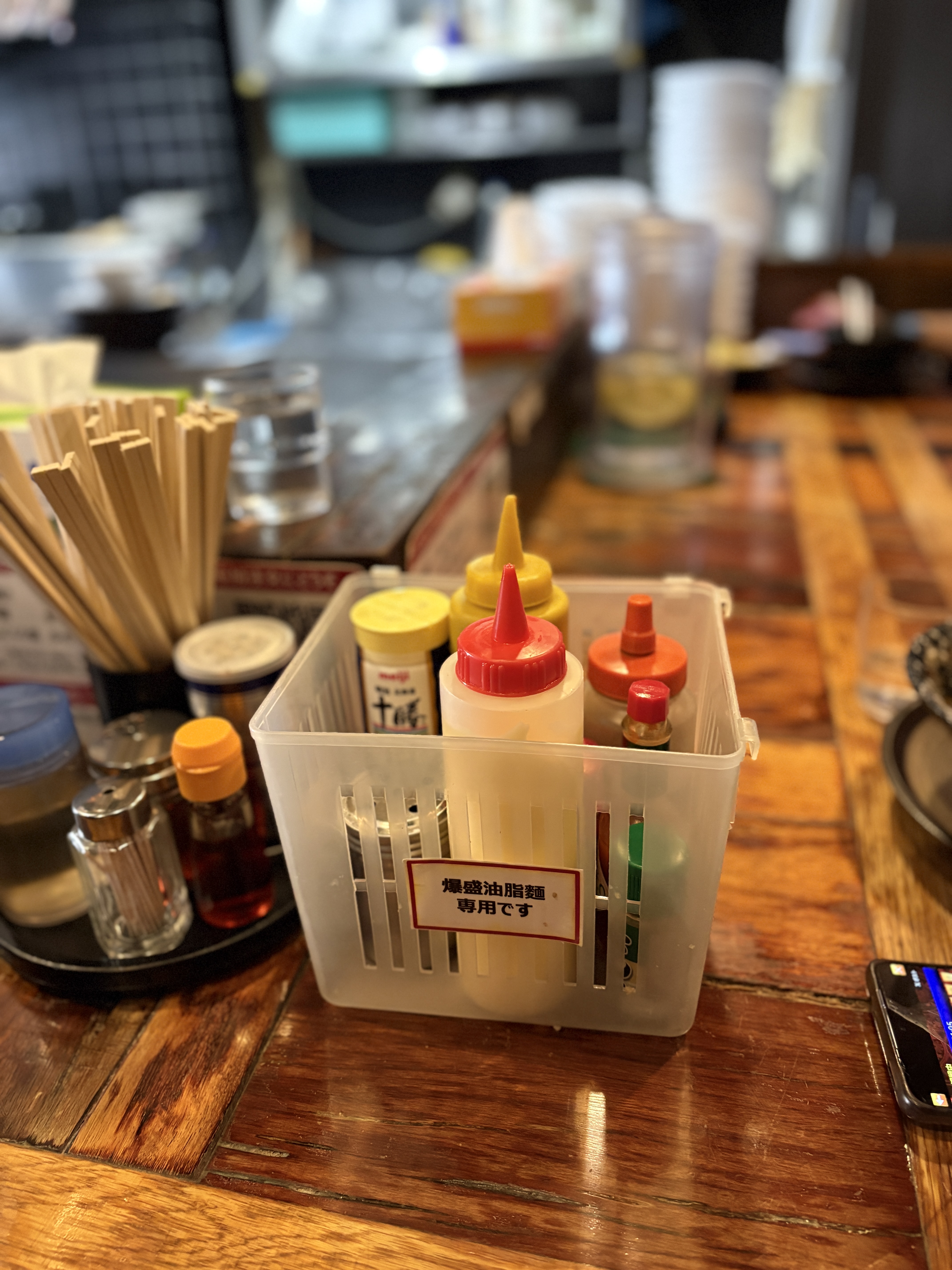 제가 방문한 시간이 2시가 지난 시간이다보니 대부분의 손님이 바쿠모리 아부라소바를 주문했구요, 바쿠모리를 주문할 경우 위 사진과 같은 조미료 모음 바구니를 갖다주십니다. 라멘을 먹다가 중간에 조미료나 토핑을 추가해서 맛을 바꾸는 행동인 '아지헨(味変)'을 위한 바구니인데요, 이 곳의 바쿠모리 아부라소바는 이 아지헨이 갖는 중요성이 꽤나 큰 것으로 알려져있습니다. 자세한 건 뒤에서 이야기를..