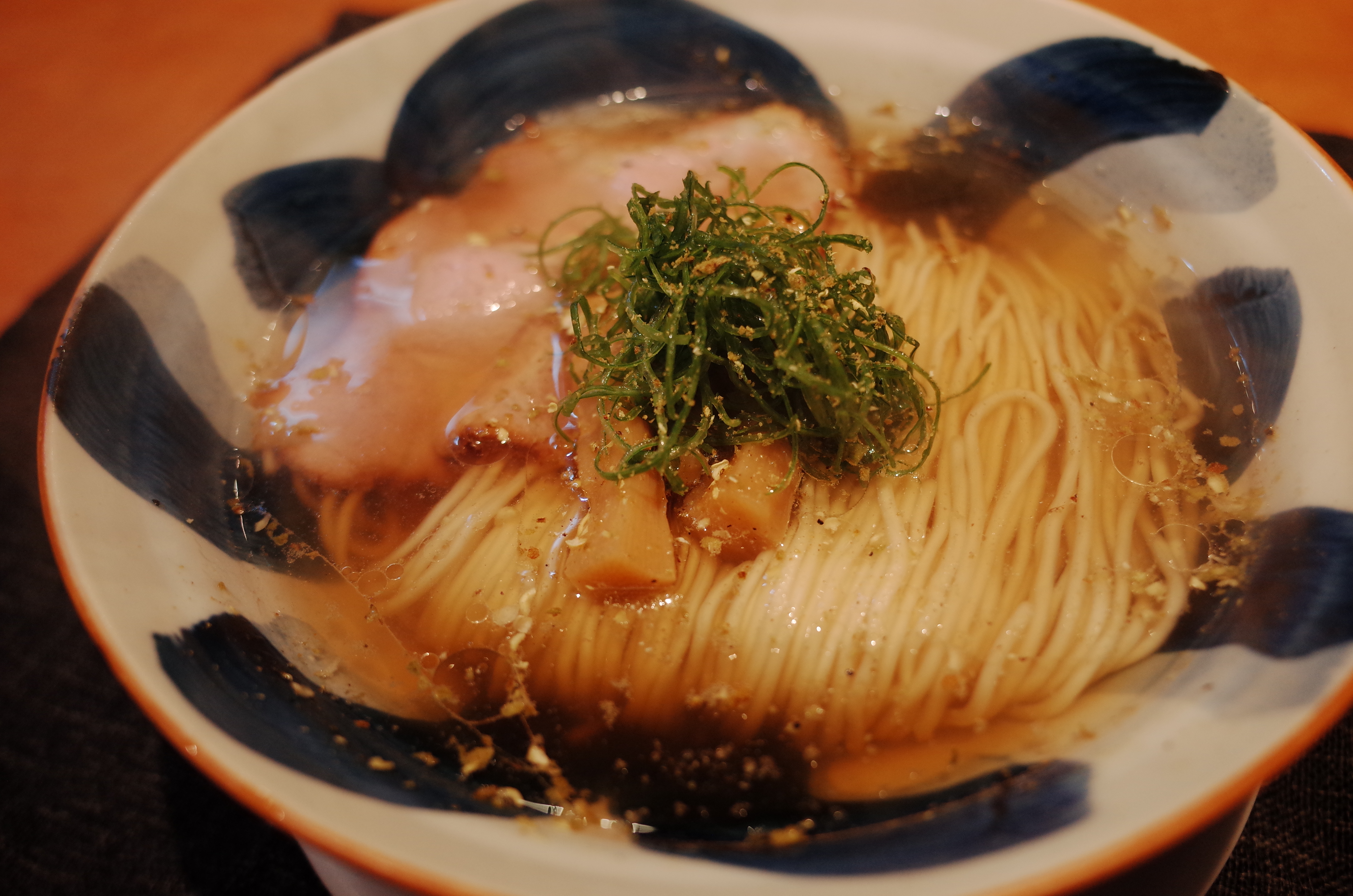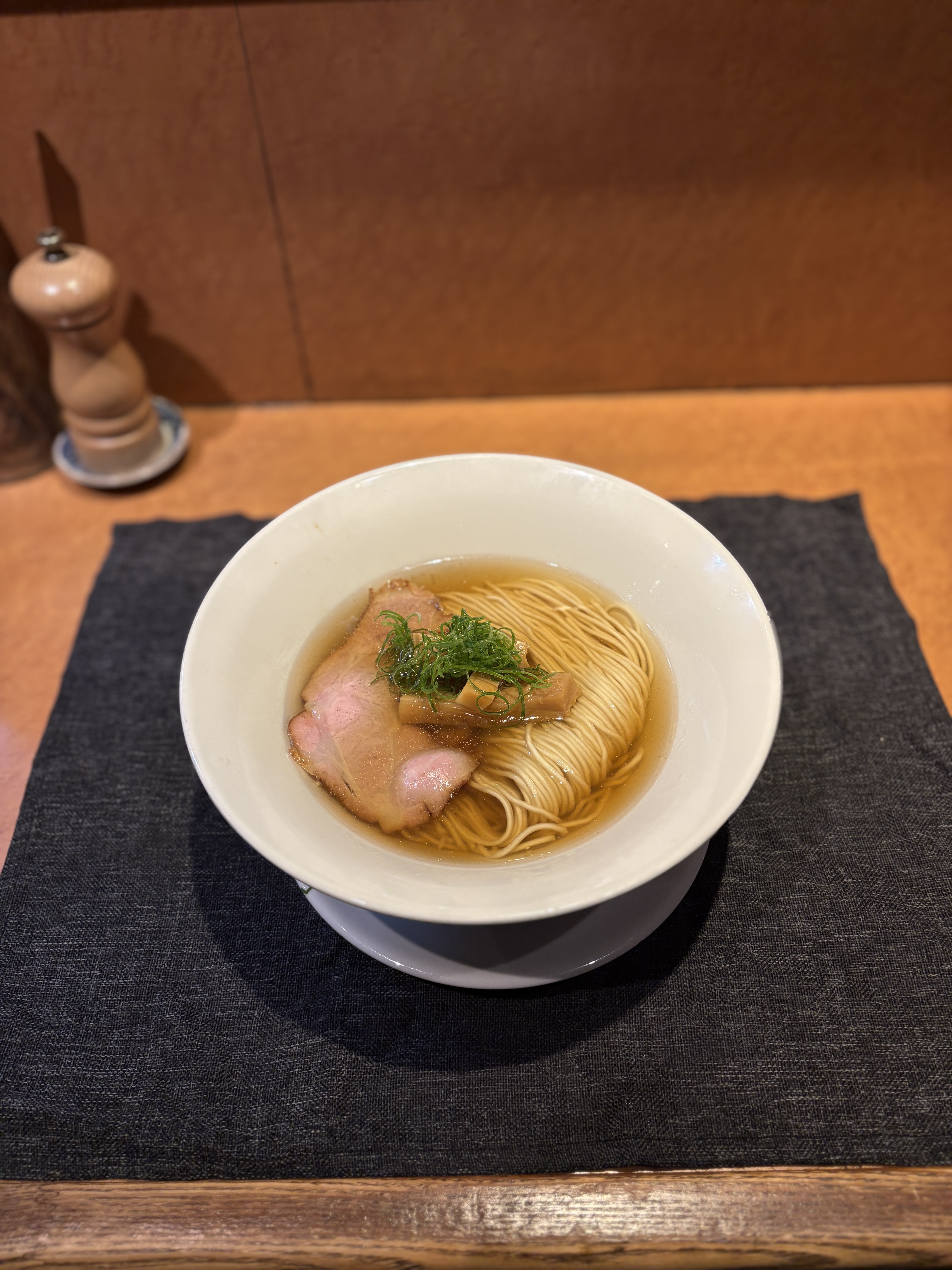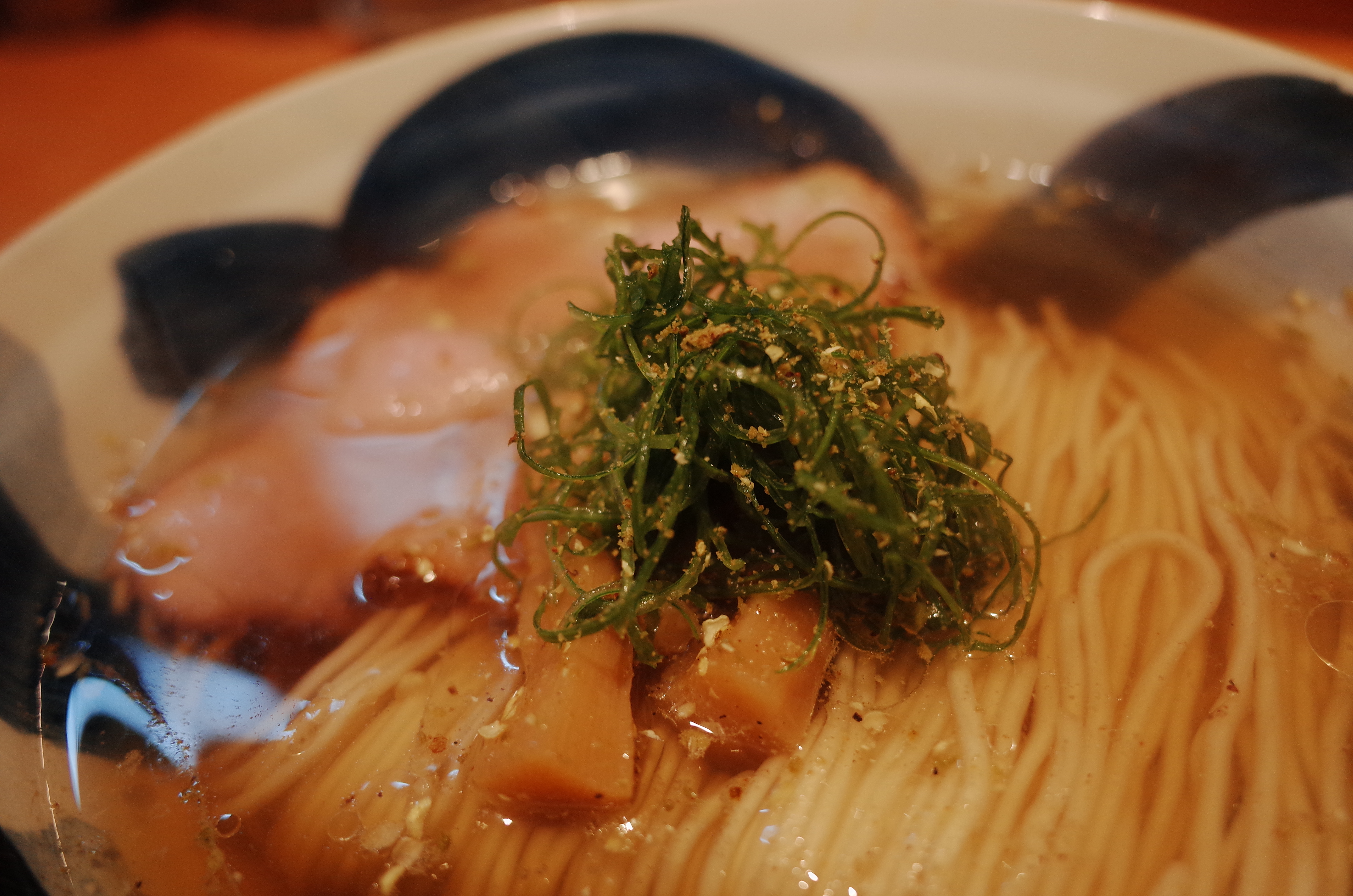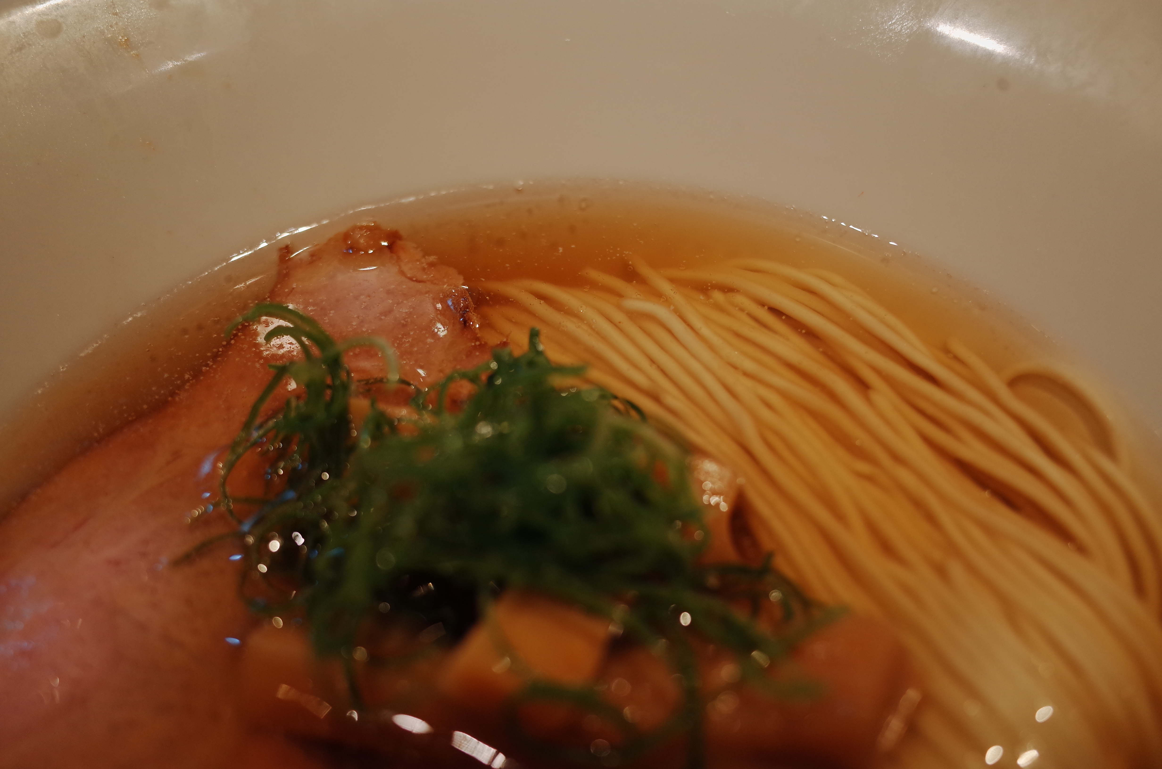 먼저 나온 완탕추가 없는 기본 니보시 시오 소바는, 역시나 듣던대로 면선이 아주 아름다웠습니다. 기본이다보니 간결한 토핑때문에 맑은 스프 아래로 정리된 면선이 더욱 돋보이는 구조였습니다. 어류계 스프 향에서 나는 독특한 우마미가 살며시 올라오는데요, 스프의 온도감이 굉장히 좋습니다.