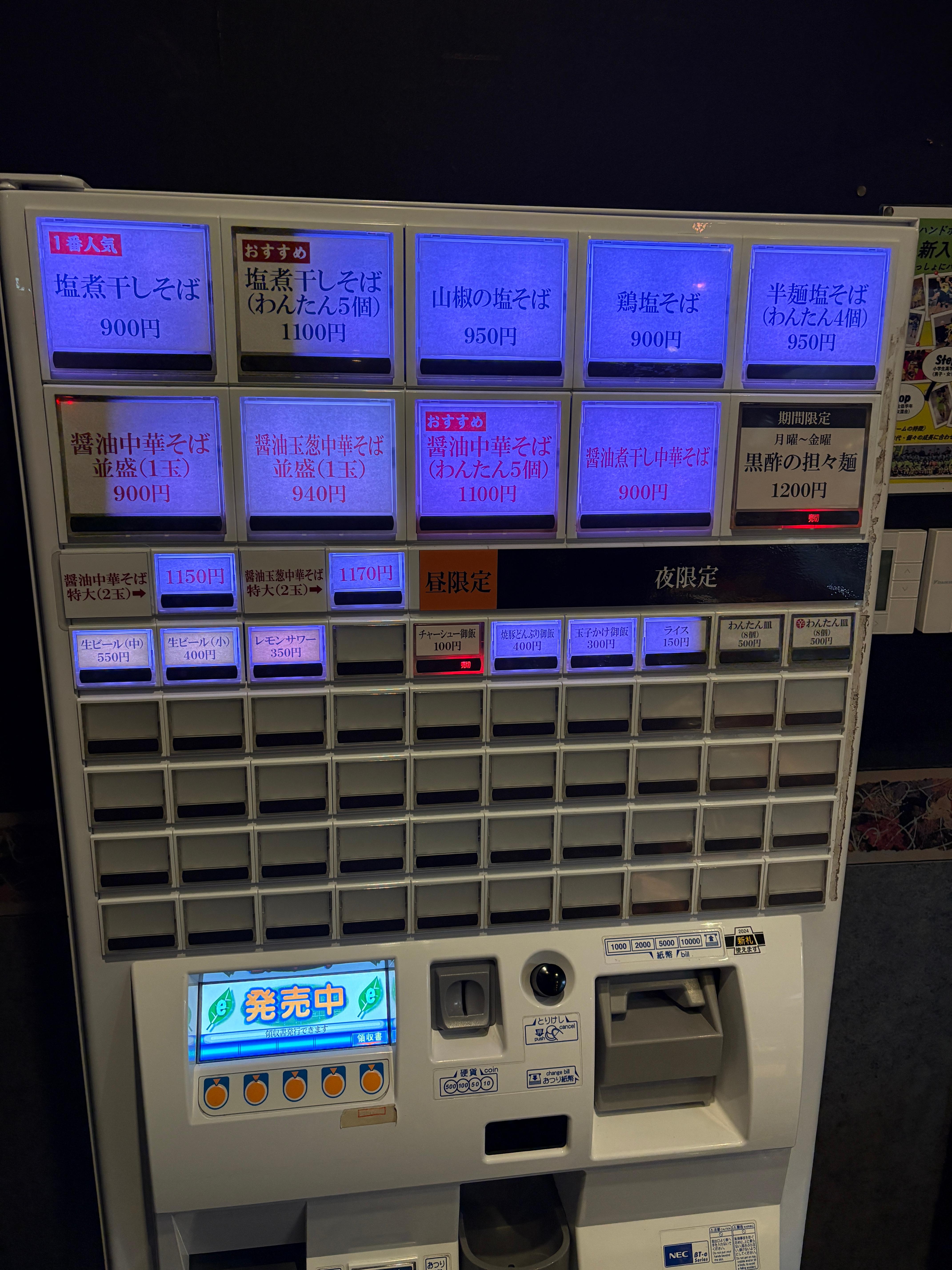 그와 더불어 라오타들에게 유명한 것은 바로 이곳의 산초소바(山椒の塩そば) 입니다. (키오스크 맨윗칸 중 가운데) 시오라멘 베이스의 스프에 강렬한 재료인 산초를 넣어 맛의 새로운 지평을 열었다는 평가가 많습니다. 어찌보면 과감할 수 있는 재료의 선택을, 역시나 와쇼쿠 출신 사장님 답게 세련되고도 우아하게 믹스해 내었다는 평입니다. 이외에도 완탕을 추가한 중화소바도 인기메뉴이자 추천 메뉴 중 하나. 전 니보시 시오소바와 산초소바를 도전해보았습니다.