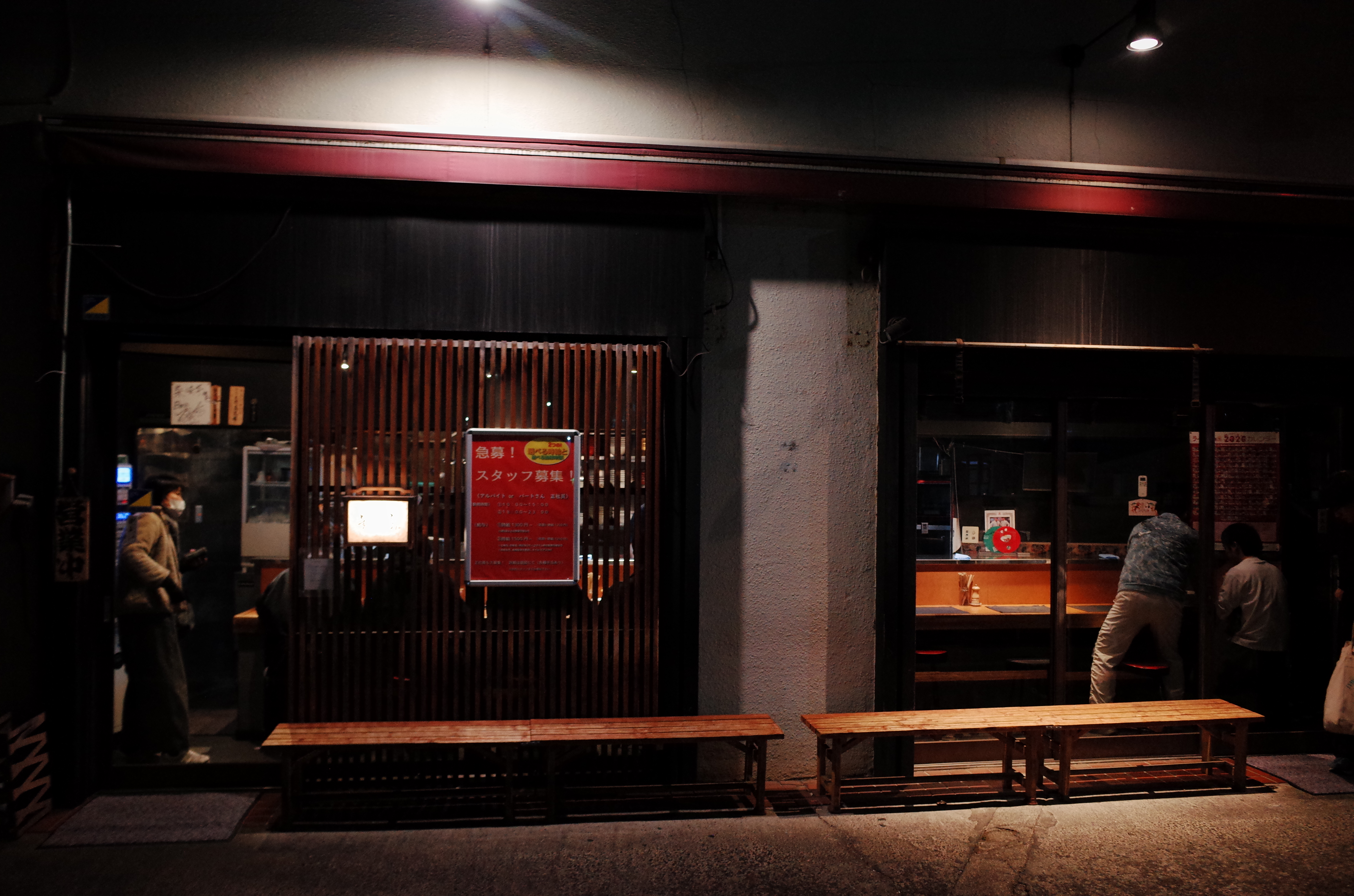 가게는 10석 규모의 아담한 크기입니다. 그리고 모두 다찌석으로 되어있는데, 다찌석에 앉는 의자 뒤로 공간이 없어서 저 좌측 끝에서 키오스크로 주문을 한 후 사진 우측에 보이는 좌석에 가서 앉으려면 재밌게도 밖으로 문을 열고 나가서 우측에 있는 다른 여닫이 문을 열고 가서 앉아야하는 구조입니다. 가게가 좁다 못해서 밖으로 나가서 돌아들어가야하는 수준이다보니 이게 또 웃깁니다. 내부는 조용한 음악이 흐르고 있었구요, 사장님이 직접 라멘을 만드시고 다른 점원 한분이 청소와 서빙 등을 도와주고 계셨습니다.