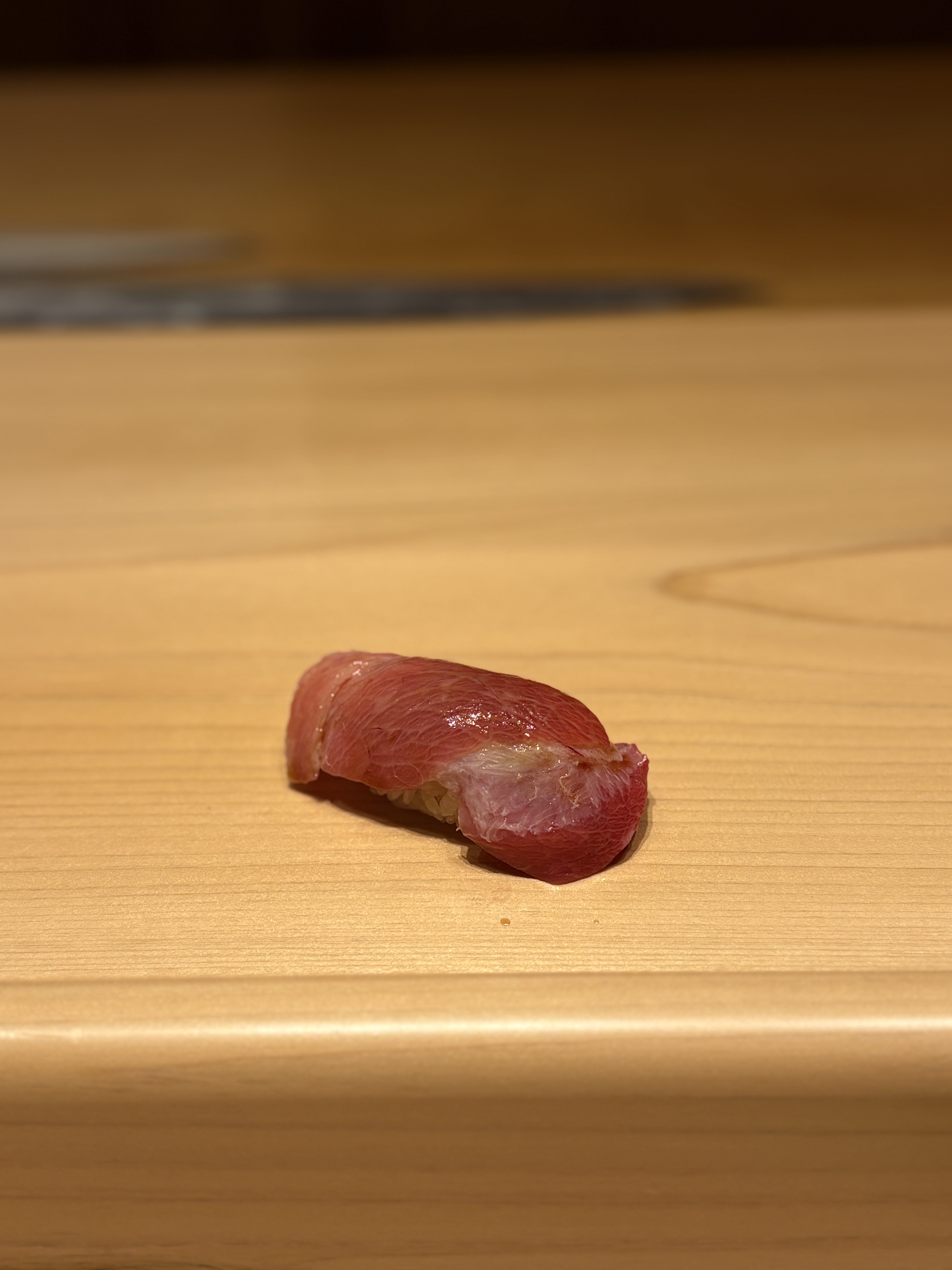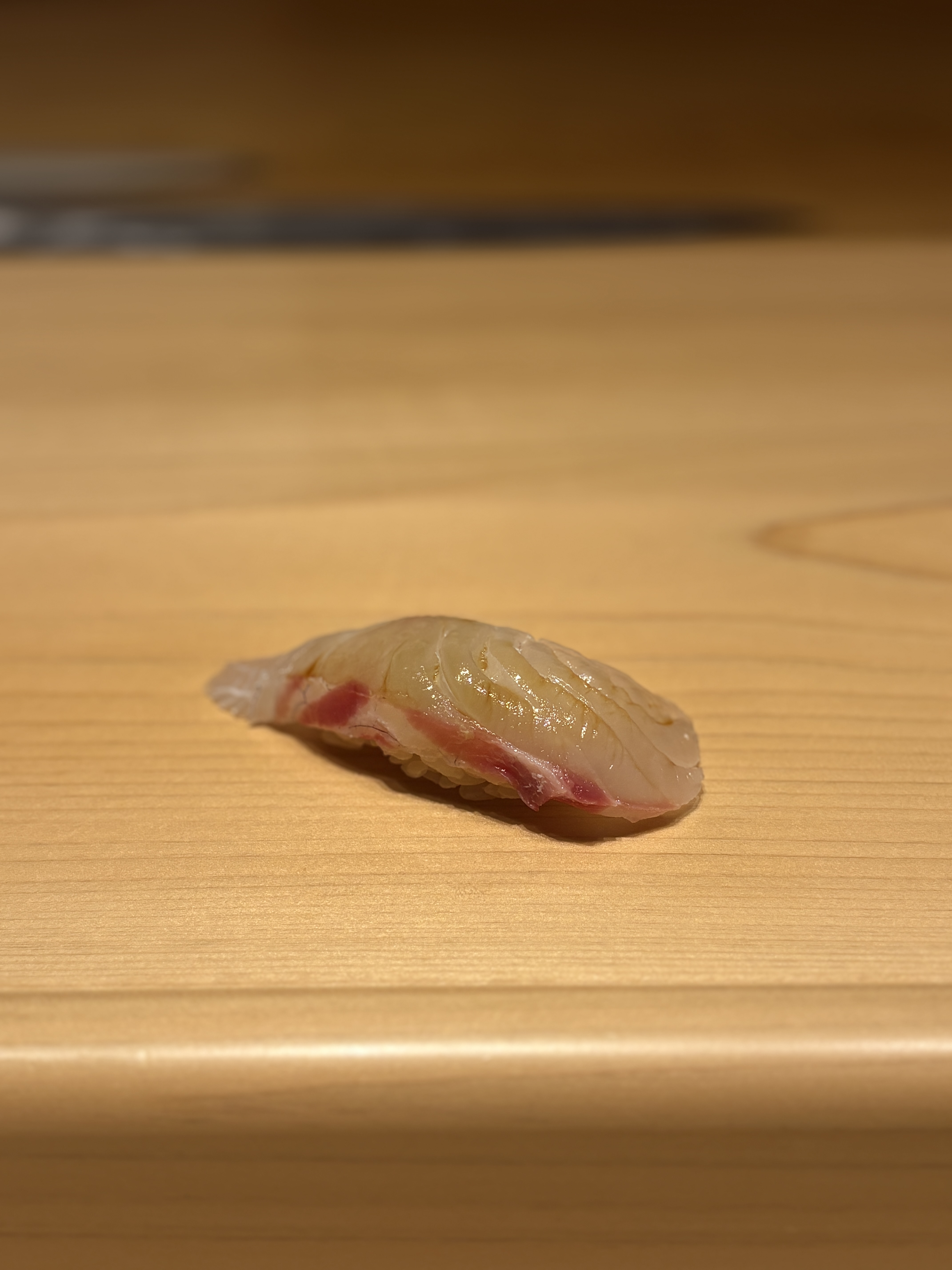 뒤에어 나온 부위는 우리에게도 익숙한 참돔, 마다이 입니다. 강한 숙성을 거치거나 간을 세게잡지 않은 원물 자체의 특성을 잘 살린 한점이었습니다. 씹을수록 올라오는 단맛이 아주 좋았구요, 칼질을 통해 섬세한 식감이 살아나는 타입이었습니다. 이 한점 만으로도 이타마에의 클라스를 느낄 수 있는 기준점이 되는 스시라고 생각했습니다.