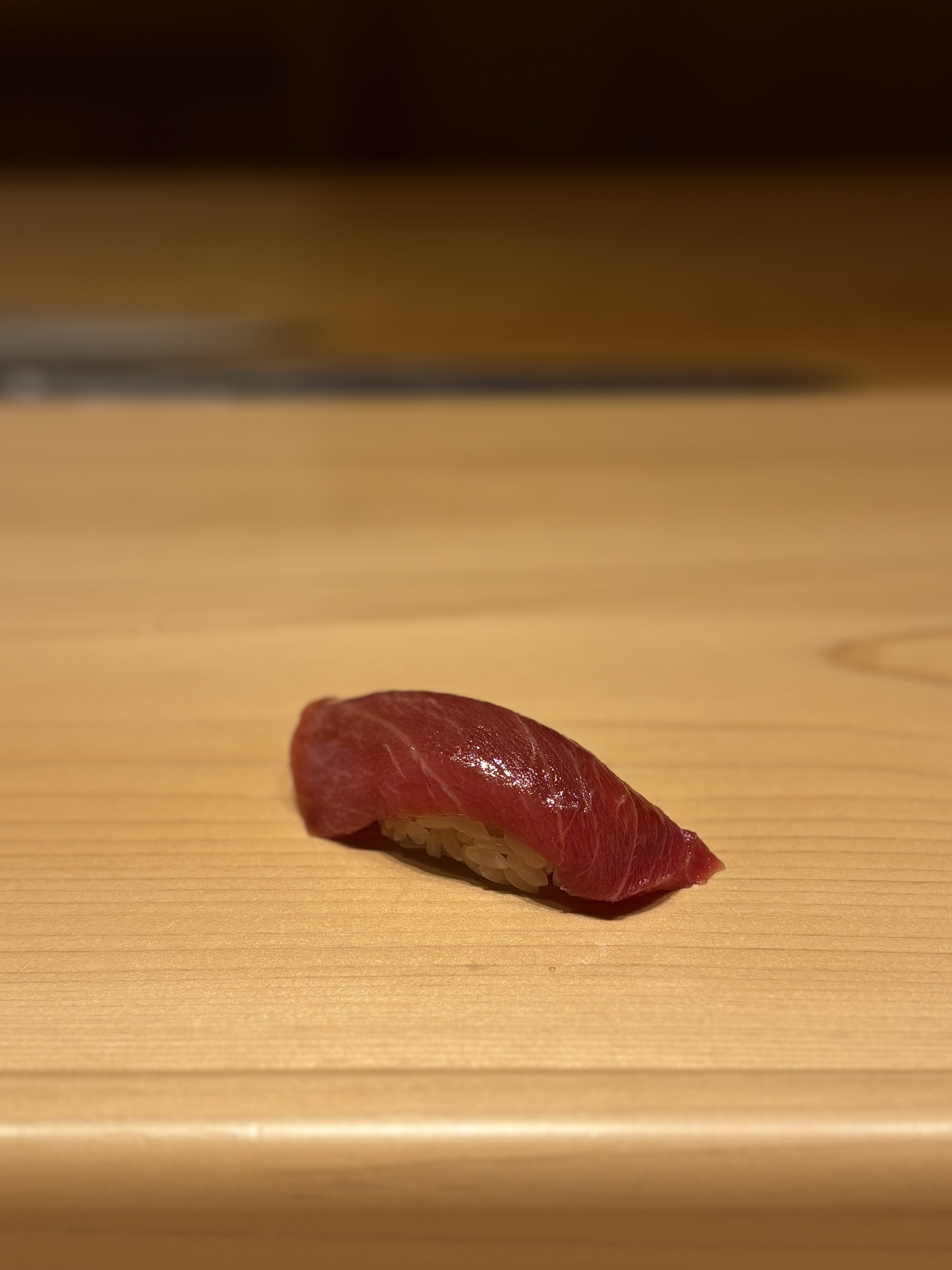 시작을 알린건 참치 등살인 아카미, 적신입니다. 오우 런치라서 니기리 위주라 타이트한 구성일거라고 생각했지만 참치등살을 먼저 내어줄 줄은 상상도 못했네요. 츠케해서 준비해둔 적신이고 첫 점에서부터 사타케씨의 클라스가 보입니다. 과하게 숙성되진 않은 것 같구요, 감칠맛이 즈케해서 내놓았음에도 처음부터 강하게 치고올라오는게 아니라 천천히 올라오는 타입입니다. 그리고 굉장히 촉촉한 편이었어요. 보통 아카미에서는 특유의 맛을 빼려고 과하게 수분기를 빼서 조금 식감이 타이트하게 느껴지는 경우가 있는데, 여기는 수분감이 상당히 잘 유지가 되어있으면서 그게 감칠맛이 천천히 올라오는 것과 맞물려서 굉장히 고급스러웠습니다. 입안에 넣으면 샤리와 동시에 풀어지면서 자연스럽게 이어지는 일체감으로 완성됩니다.
