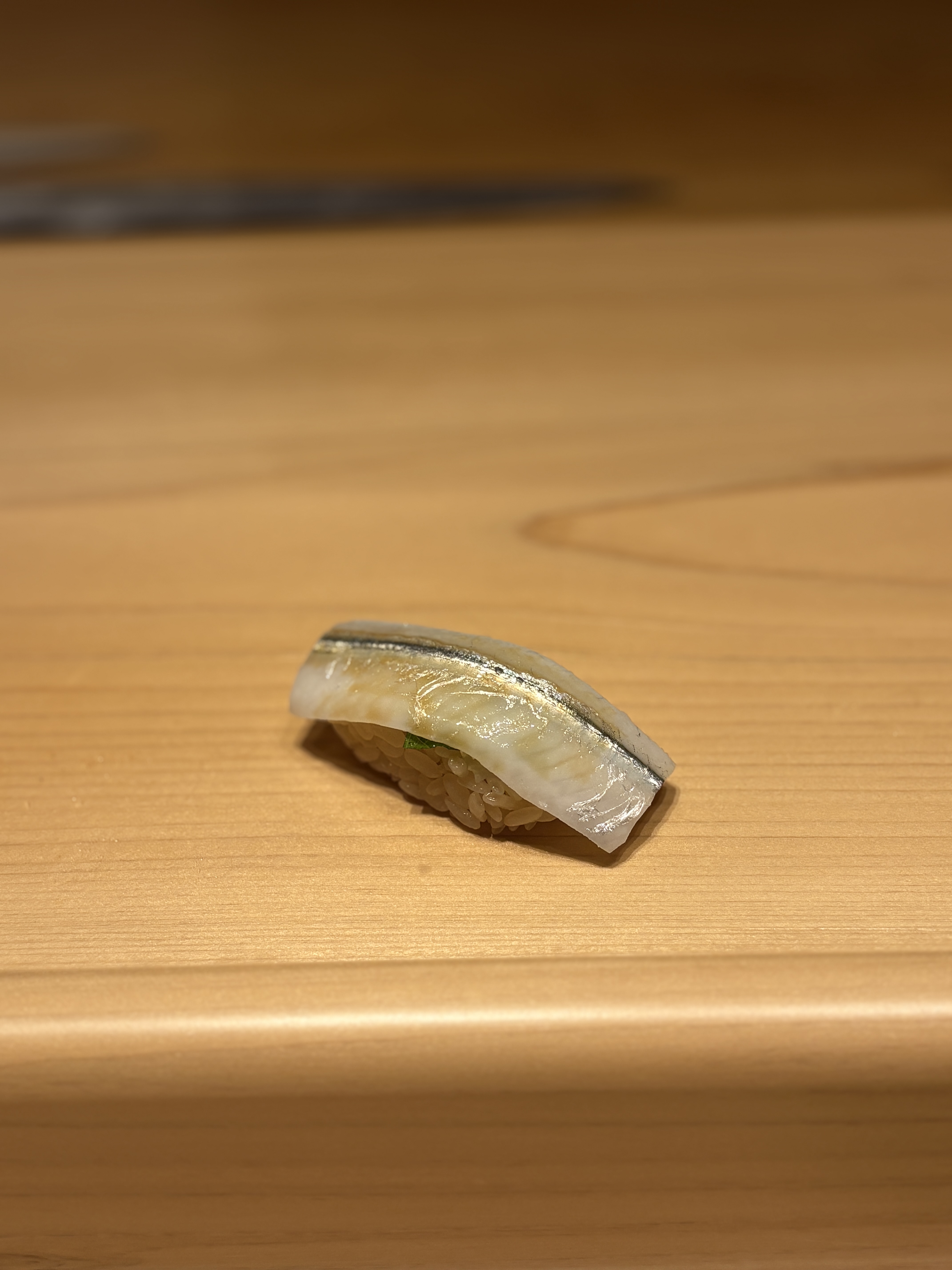 임팩트가 큰 친구들이 나오다가 이젠 섬세함이 생명인 친구로 전환됩니다. 학꽁치인 사요리. 수분, 칼질, 온도가조금이라도 어긋나면 바로 싸구려 맛으로 전락해버리는 녀석이죠. 본래 맛자체가 강하지 않기 때문에 미묘하게 올라오는 단맛과 식감, 그리고 수분감으로 먹는 스시라서 재료를 다루는 솜씨를 볼 수 있는 한 점 이었습니다.