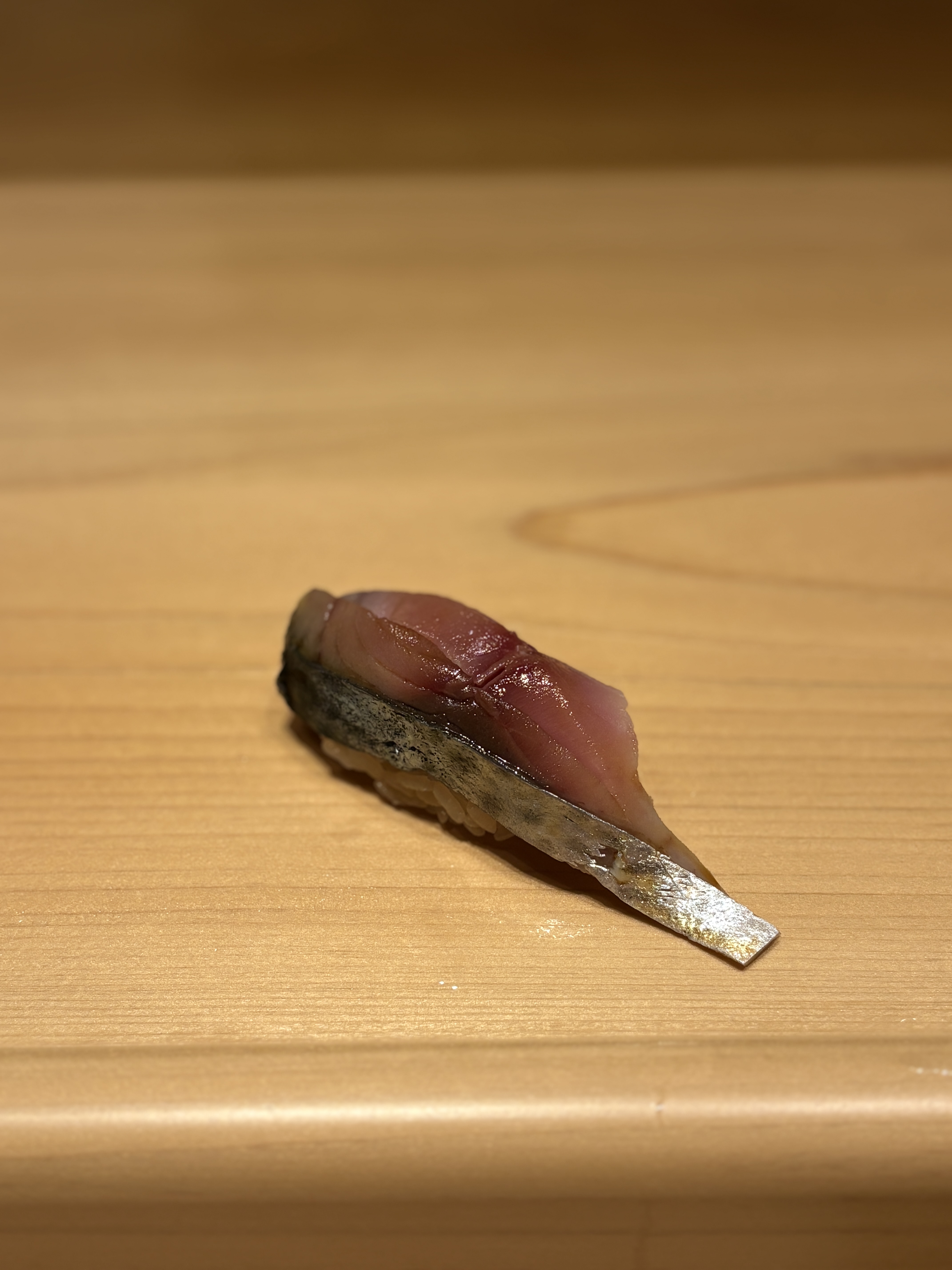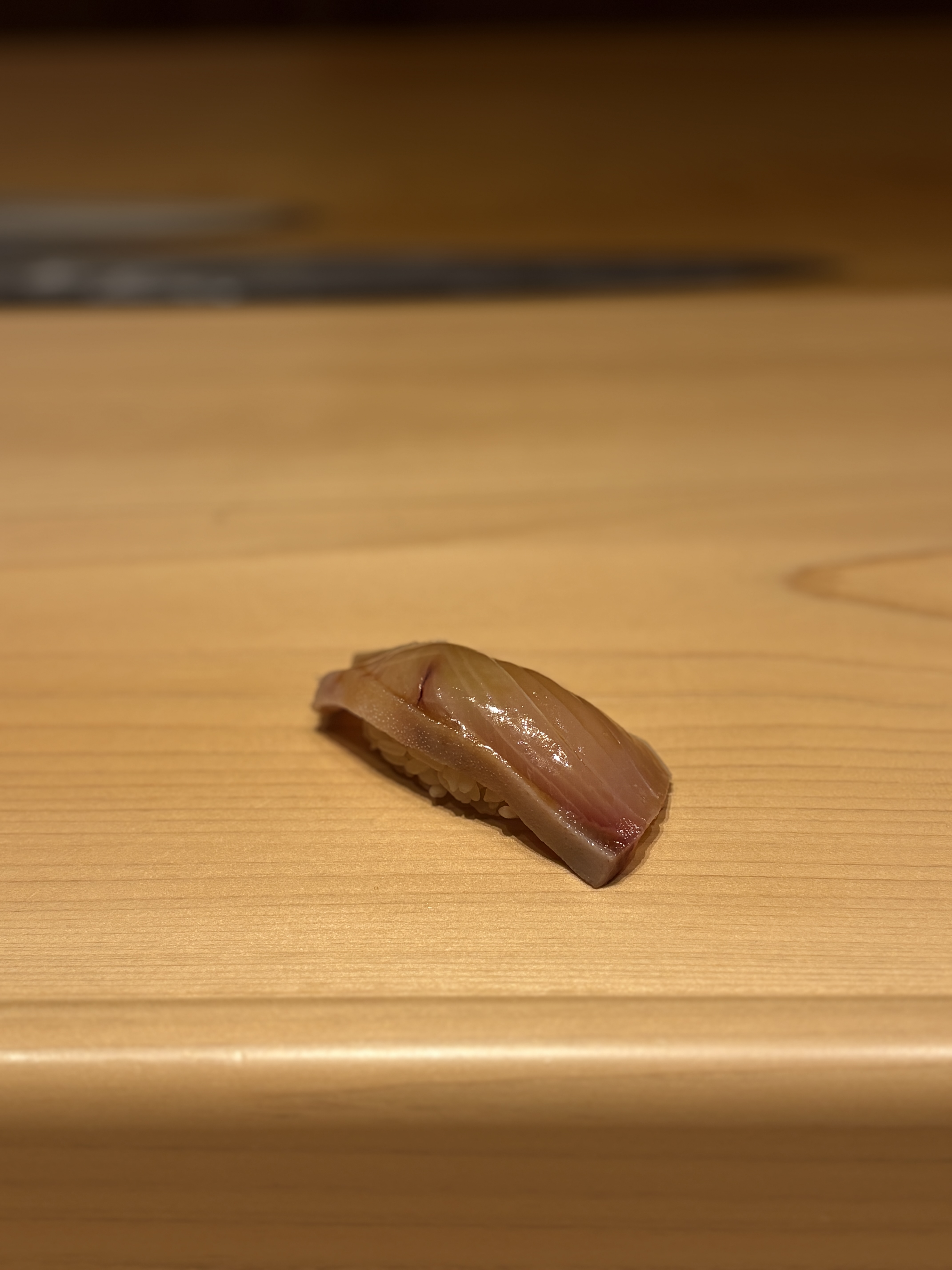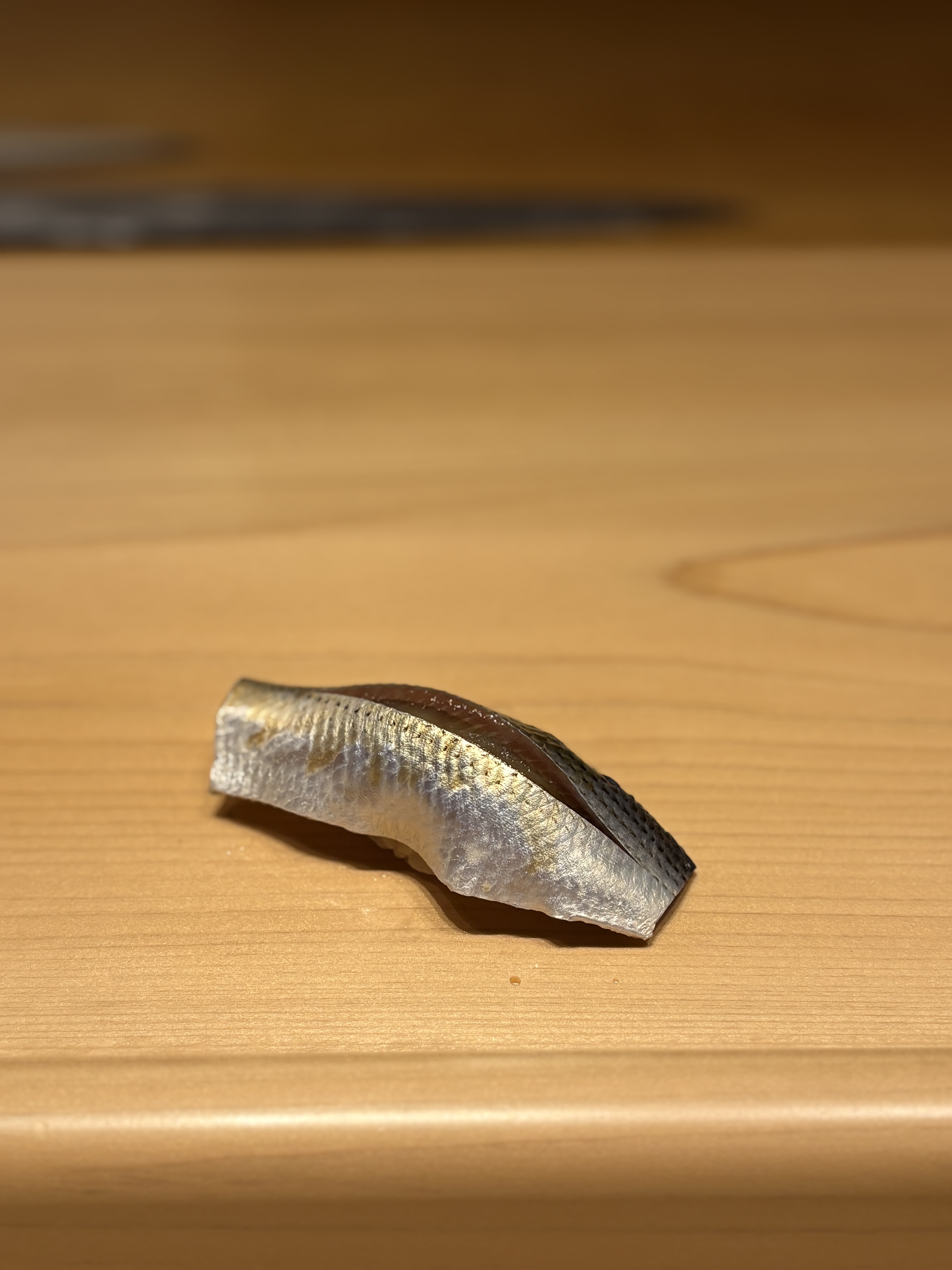 다음으로 나온 시마아지, 줄무늬 전갱이입니다. 그동안 다른 스시야에서 먹었던 것보다 굉장히 시마아지의 살 부분에서 나오는 단맛이 도드라지는 느낌이었어요. 아카미와 마찬가지로 일반적으로 먹는 시마아지 스시에서의 서걱거리는 맛이 강조되는게 아니라 적당한 탄력이 살아있으면서 씹을 때 결은 또 살아있는 맛이었습니다. 전통 에도마에식 스타일이라기보단 좀 더 현대적인 맛이라고나 할까요.