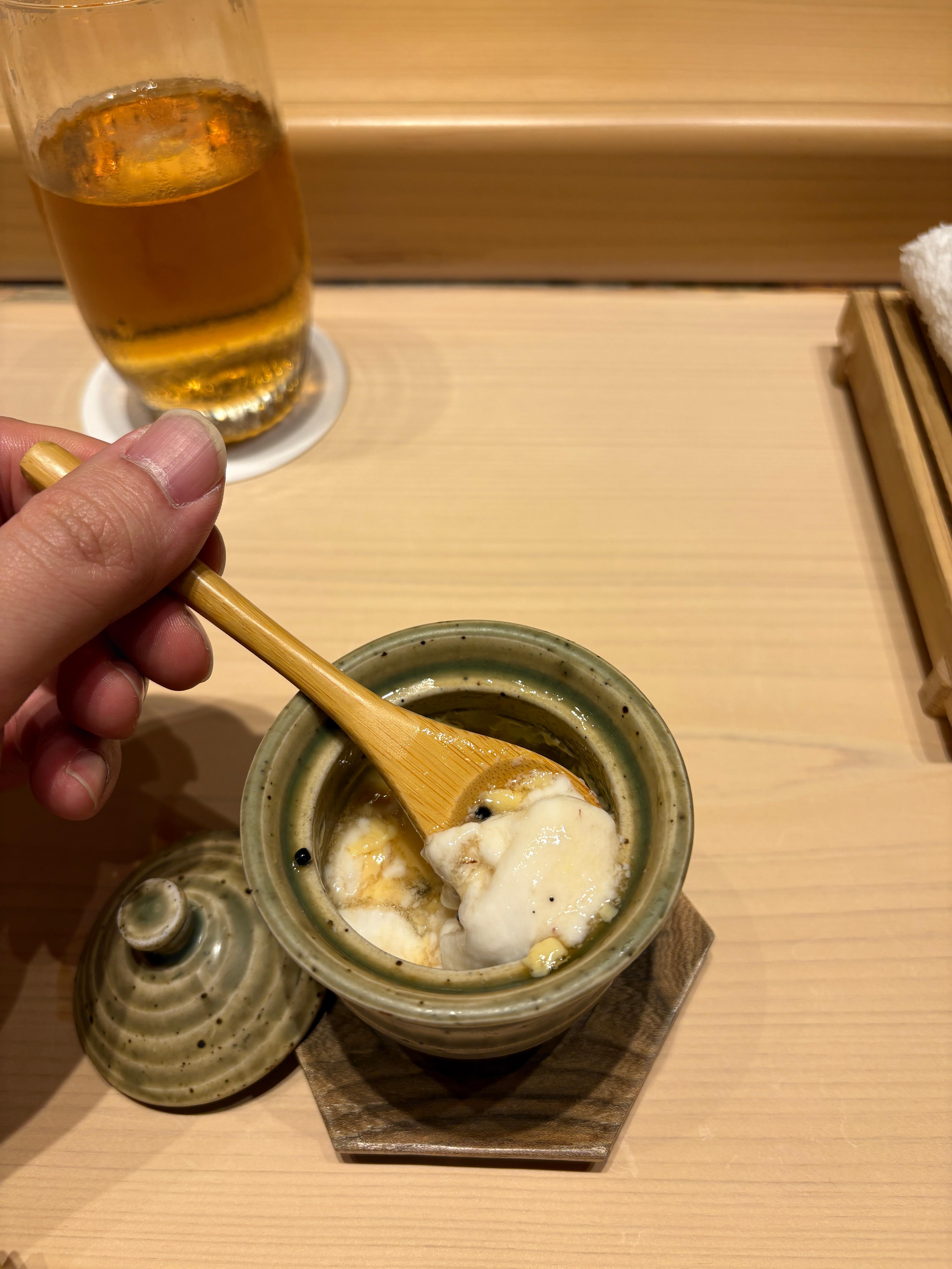 먼저 처음 나온 메뉴는 차완무시. 아주 정갈한 자기에 담겨서 나옵니다. 사실 차완무시가 거기서 거기라는 입장이긴한데, 한입 떠서 안에 들어가있는 내용물을 먹어봐야 진짜 가치를 알 수 있죠.