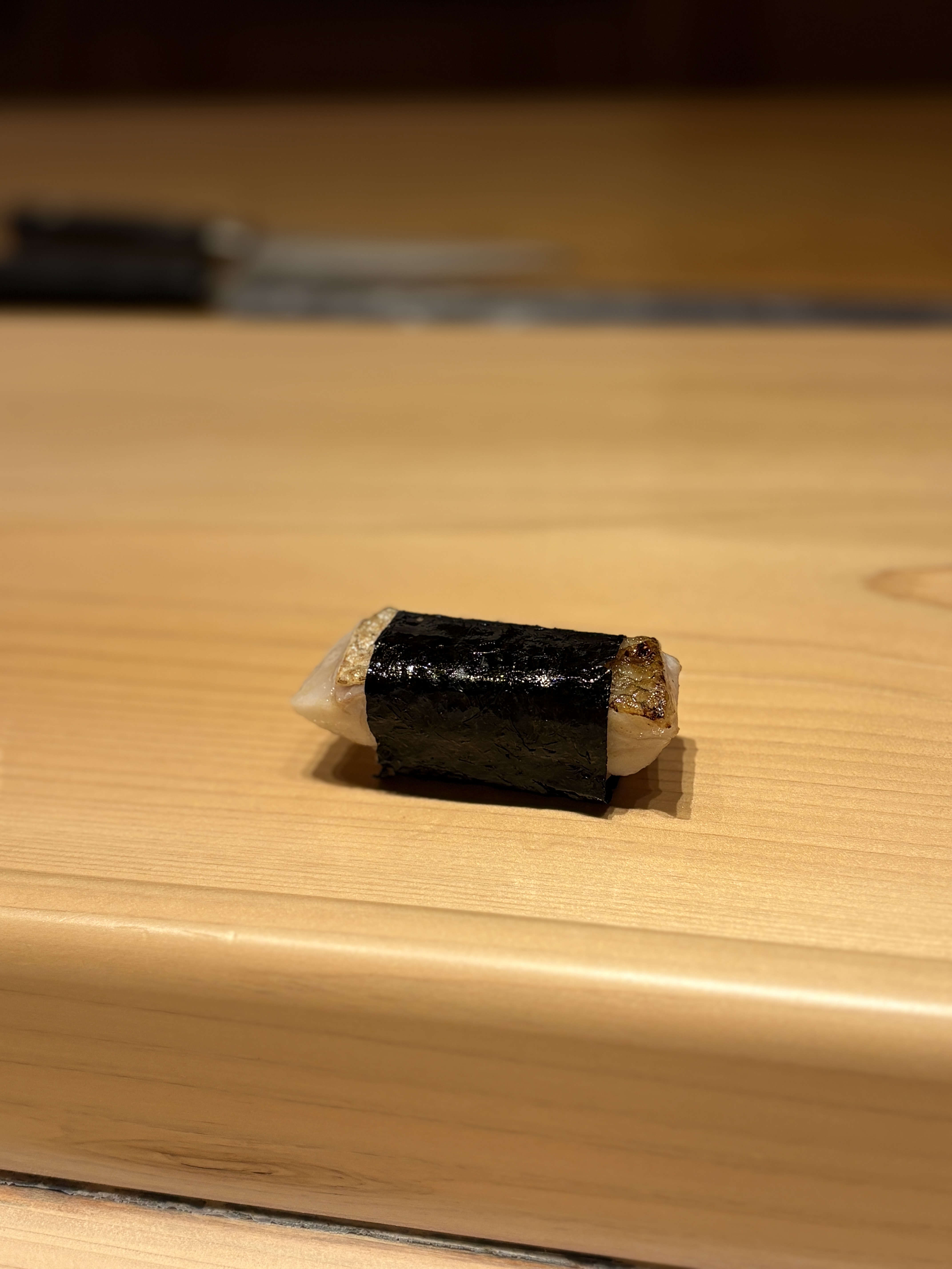 다음으로 나온건 노도구로입니다. 이런식으로 모양은 잡아준 노도구로 스시는 보기 힘들죠 ㅎㅎ 겉을 살짝 아부리해서 지방의 맛과 향을 최상으로 끌어올렸습니다. 같이 싸준 김 향이 입안에서 먼저 퍼지면서 뒤를 이어 노도구로의 지방감이 폭발을 하는데요, 고소한 김의 바다향이 노도구로의 지방의 과도함을 잡아주는 역할인 것 같구요, 둘의 하모니가 좋았습니다. 네타의 퀄리티 자체도 최상급이었구요. 가나자와에서 먹은 노도구로보다도 더 맛있었던 기억...
