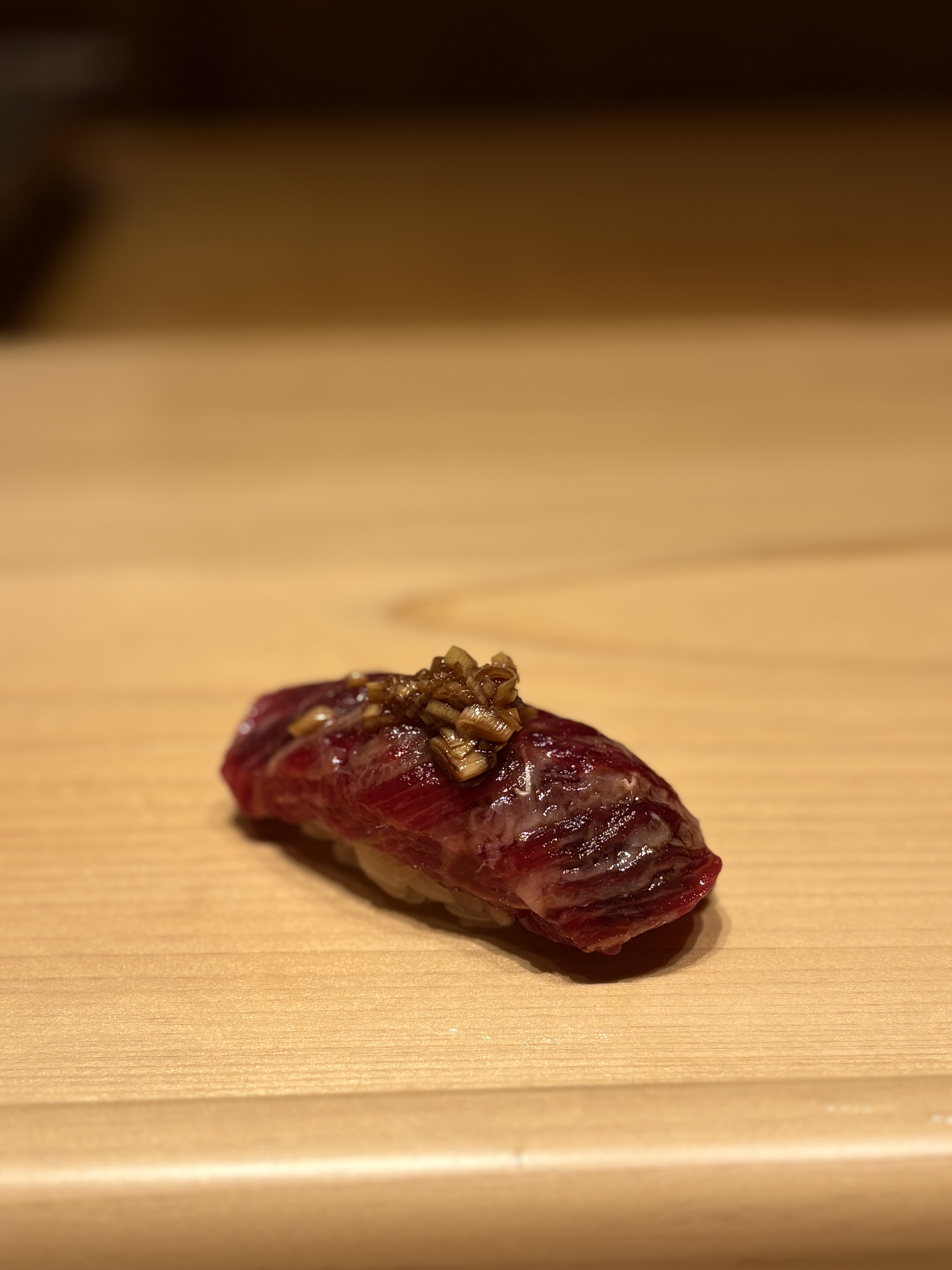 마지막은 네타 이름을 듣고 주문 안 할 수 없었던 쿠지라, 즉 고래고기입니다. 고래 스시를 일본에서 처음 먹어보는 것 같은데 사실 한국에서의 고래고기는 냄새 때문에 매니아들만 즐겨 먹는다고하죠. 근데 이 쿠지라 스시, 정말 아주 질좋은 기름 많은 육사시미를 초밥처럼 먹는 것 같습니다. 그리고 위에 올라간 양념이 절묘해서 아주 고급진 육사시미를 초밥으로 먹는 기분. 근데 고래 고기에서만 느껴지는 특유의 감칠맛이 있다고 하는데 저로서는 처음 먹어보는 맛이라서 이 맛을 잘 기억해두고자 노력했습니다. 한 10개 사서 먹고 싶었네요 ㅋㅋ 다음에도 기회가 되면 반드시 다시 주문해서 먹어보고 싶은 네타였습니다.