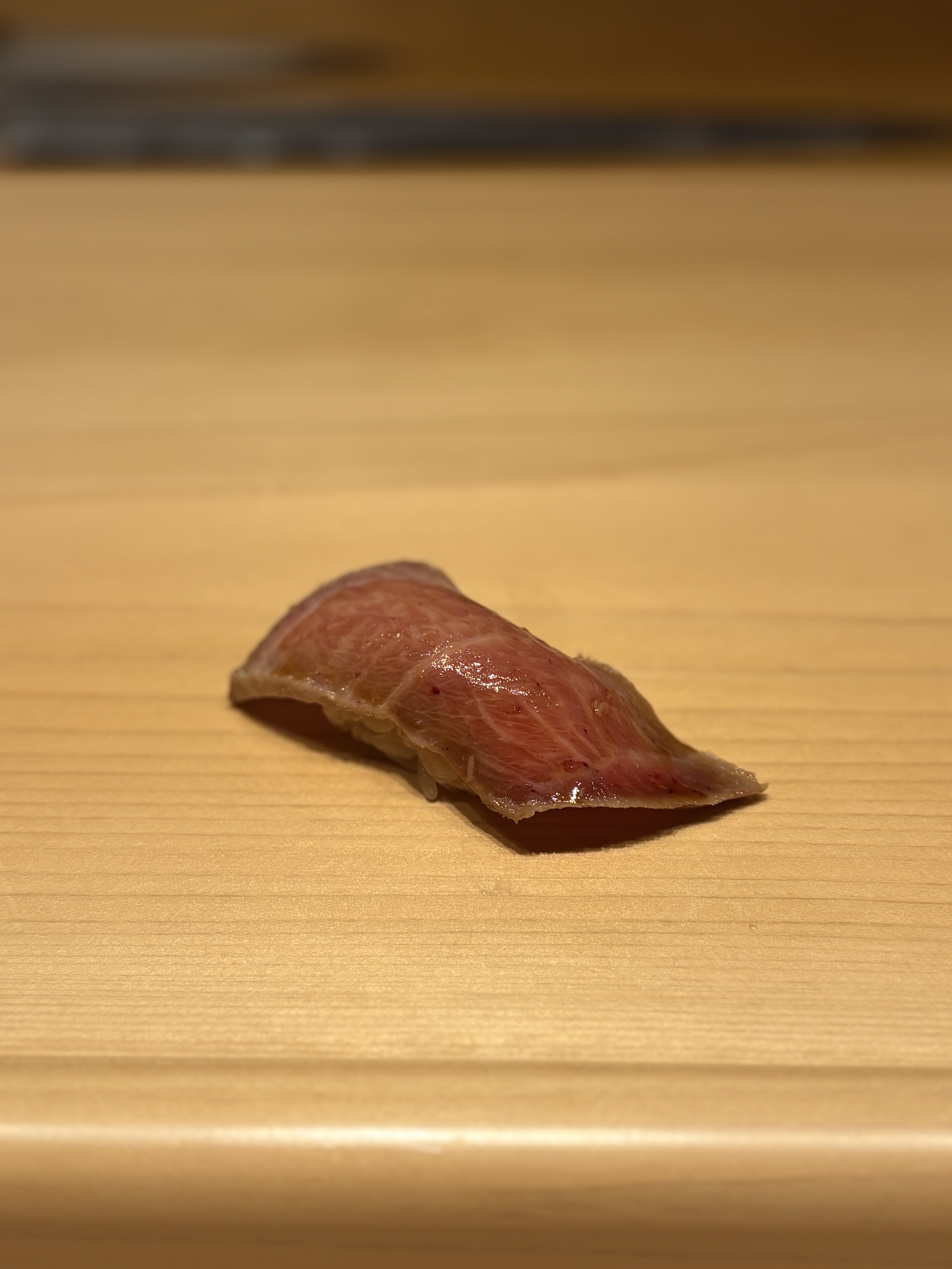 갑자기 이타이밍에 나온 참치 대뱃살 오토로, 외관이 익히 알던 오토로랑 뭔가 다릅니다. 스시를 잡아보면 왜그런지 느낌이 옵니다. 샤리의 온도가 생각보다 높습니다. 아니 스시에서 샤리온도가 높으면 어떻게해? 라는 생각도 들지만, 내어주자마자 바로 먹어야 그 의도를 느낄 수 있다 생각해서 먹어봅니다. 아 이래서 그런거구나. 샤리의 온도감이 지방의 맛을 매우 증폭해주는 느낌입니다. 이런건 또 처음이네요. 겉모습만 보았을 때는 실망했는데 먹어보니 샤리의 온도 설계가 예술입니다. 입에서 녹아버립니다. 이런 식으로 오토로를 풀어낼 수도 있군요.