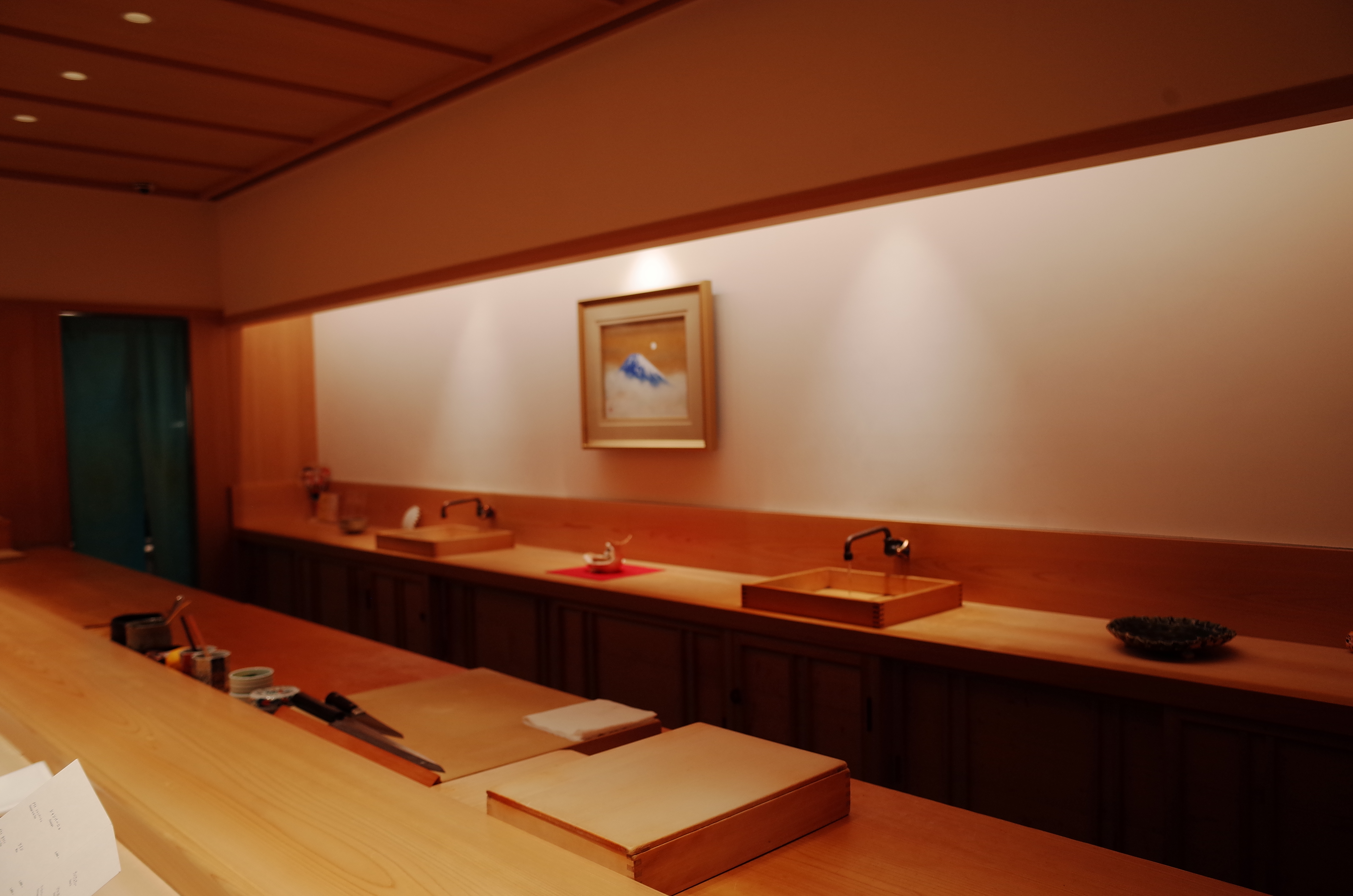 오늘 설명 드릴 내용 중에서 어찌보면 가장 중요한 내용인데요, 실제 구글 리뷰에서 언급된 부분이기도 합니다. 이 곳의 가게 이름과 일치하는 이타마에 '사타케'씨에 관한 내용인데요, 저도 방문 후에 자리에 입장하자마자 압도적인 매장 분위기에 조금 위압감이 들었습니다. 굉장히 깔끔하게 정리된 다찌석들 뒷편으로 뒷짐을 지고 서있는 사타케씨의 첫 인상은 손님을 환대한다기보다는 무표정에 가까웠어요. 업계에서 벌써 30년 가까이 스시를 잡아온 분이시고, 실력에 있어서는 이미 검증받은 분인데요, 인사를 먼저 건내거나 그런 서비스 정신이 투철해보인다는 느낌은 들지 않았습니다. 오히려 중간에 아내가 사진을 찍으려고 일어나 있었는데, 사진 촬영이 길어지자 영어로 'Please, sit down'이라고 말해서 뭔가 혼나는 느낌마저 들었다는.. 근데 코스가 시작되려는 순간 예약석이 비어있는 것을 보고 외국인에 대해서 조금 부정적인 인상이 있을 수 있겠구나라는 생각이 들었습니다. 중국계 손님인 것 같았는데 일제시작임에도 불구하고 10분이상 늦어버려서.. 예약사항에 써있던 것처럼 취소시키진 않았지만 코스 자체가 약간 그 분들만 늦게 시작이 되어버렸다는..