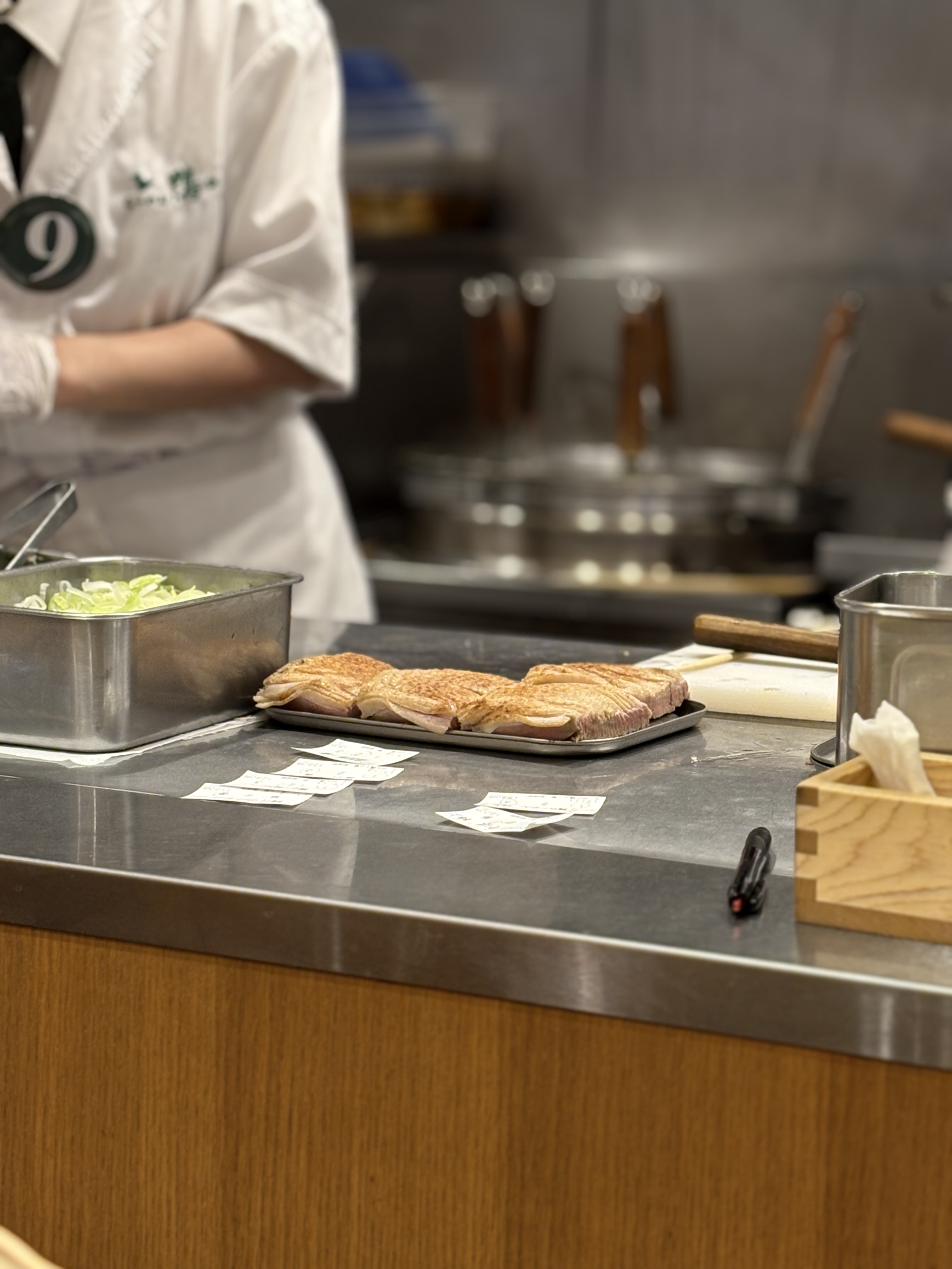 매장에 다찌석으로 안내 받아 앉으면 이렇게 라멘을 담아내는 과정과 재료들을 볼 수 있습니다. 가지런히 정리되어있는 오리 차슈들. 명색이 오리 라멘집이라면 오리 차슈는 있어야지라는 생각에 부흥하는 토핑입니다. 오리 차슈 맛이 히스에에서 먹었던 것처럼 감동적인 맛은 아니지만 그래도 전문점 다운 준수한 퀄리티를 보여줍니다.