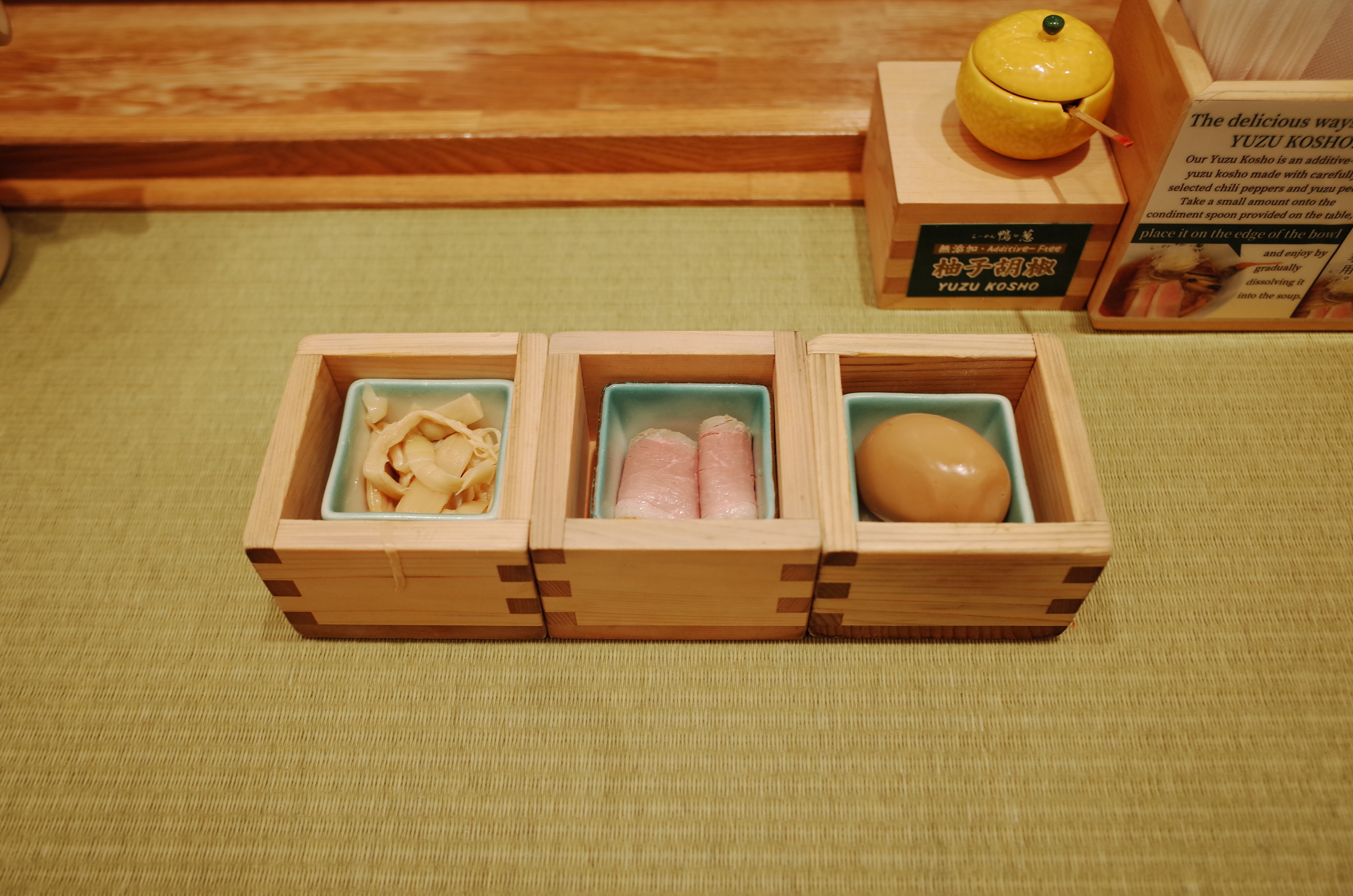 착석 즉시 나오는 토핑 3종 세트. 당연 돈 추가로 내야합니다..ㅋㅋ 토쿠죠 라멘, 즉 특상 라멘으로 주문을 했더니, 따로 멘마, 차슈, 계란이 나와있구요, 완탕은 라멘 안에 들어가있습니다. 가격은 특상 오리 라멘 (特上 鴨らーめん) 기준 1,580엔. 개인적으로 멘마 처리 상태가 너무 개판이라서 여기서 만족도가 확떨어지긴 했습니다..ㅋㅋ 다른 토핑에 비해서..