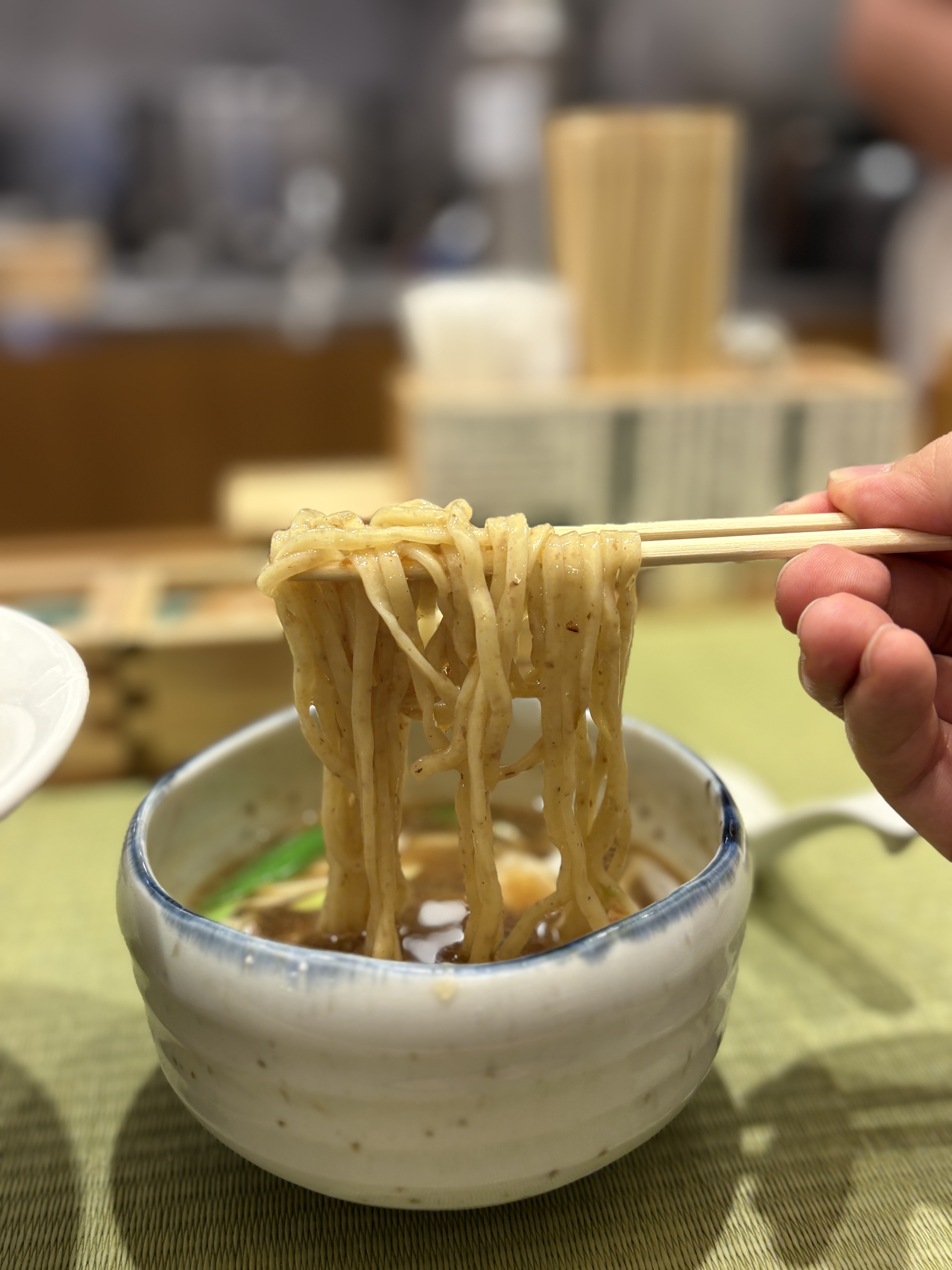 츠케지루 안에는 오리 차슈 자투리가 잘라서 들어가있습니다. 파의향도 잘 살아있구요. 오리 풍미가 확실히 쇼유라멘보다 더 진합니다. 오리 맛을 제대로 느끼고 싶어 방문한 분이라면 일반 쇼유라멘보다는 츠케소바를 추천드리는 이유입니다.
