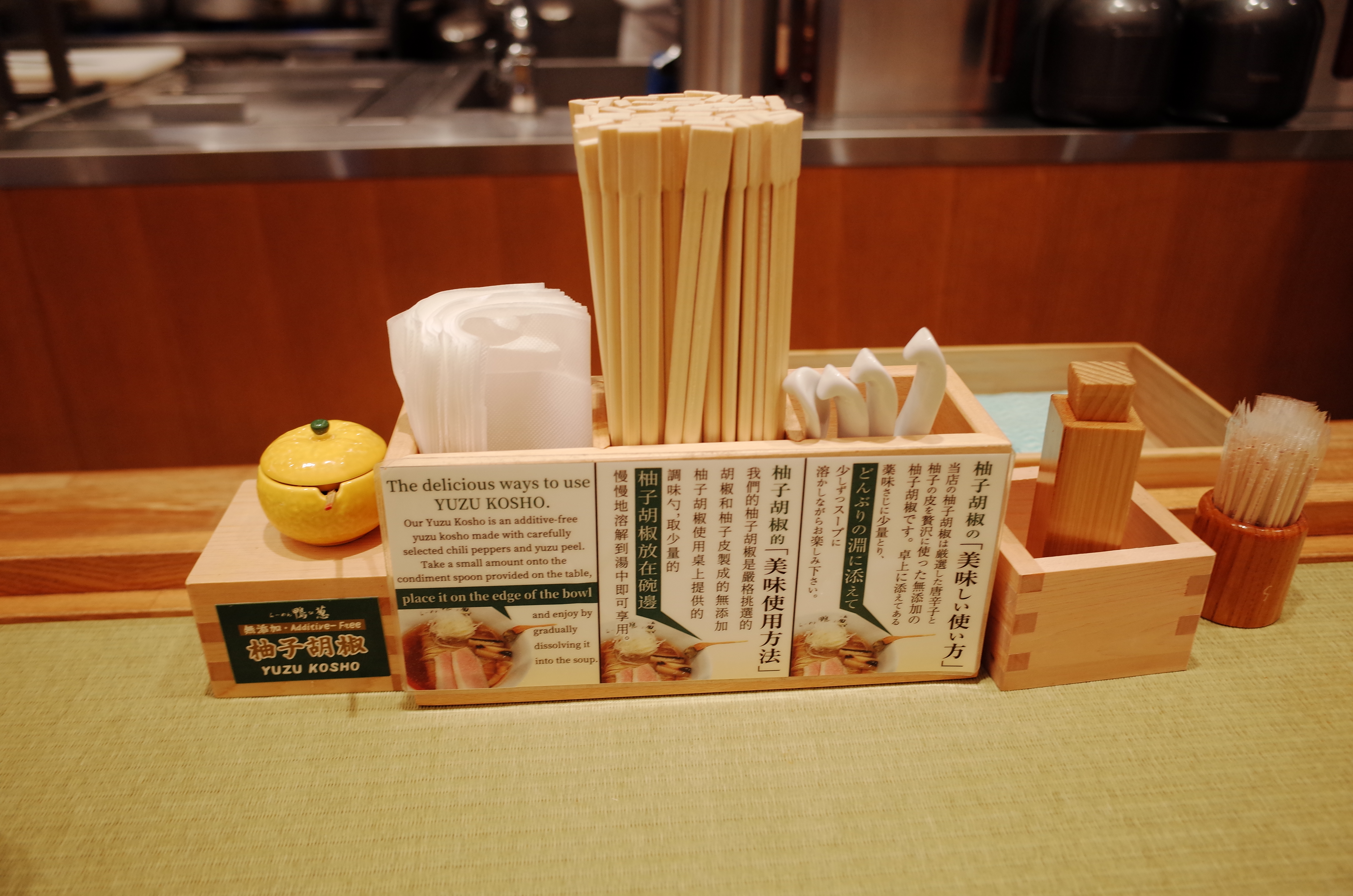 라멘 앞에는 여러까지 조미료들과 뿌려먹는 방법을 설명하고 있어요. 유즈코쇼를 주로 많이 넣어서 먹는데 이것마저 뭔가 카모소바의 느낌과 닮아있는 맛이라는..ㅋㅋ