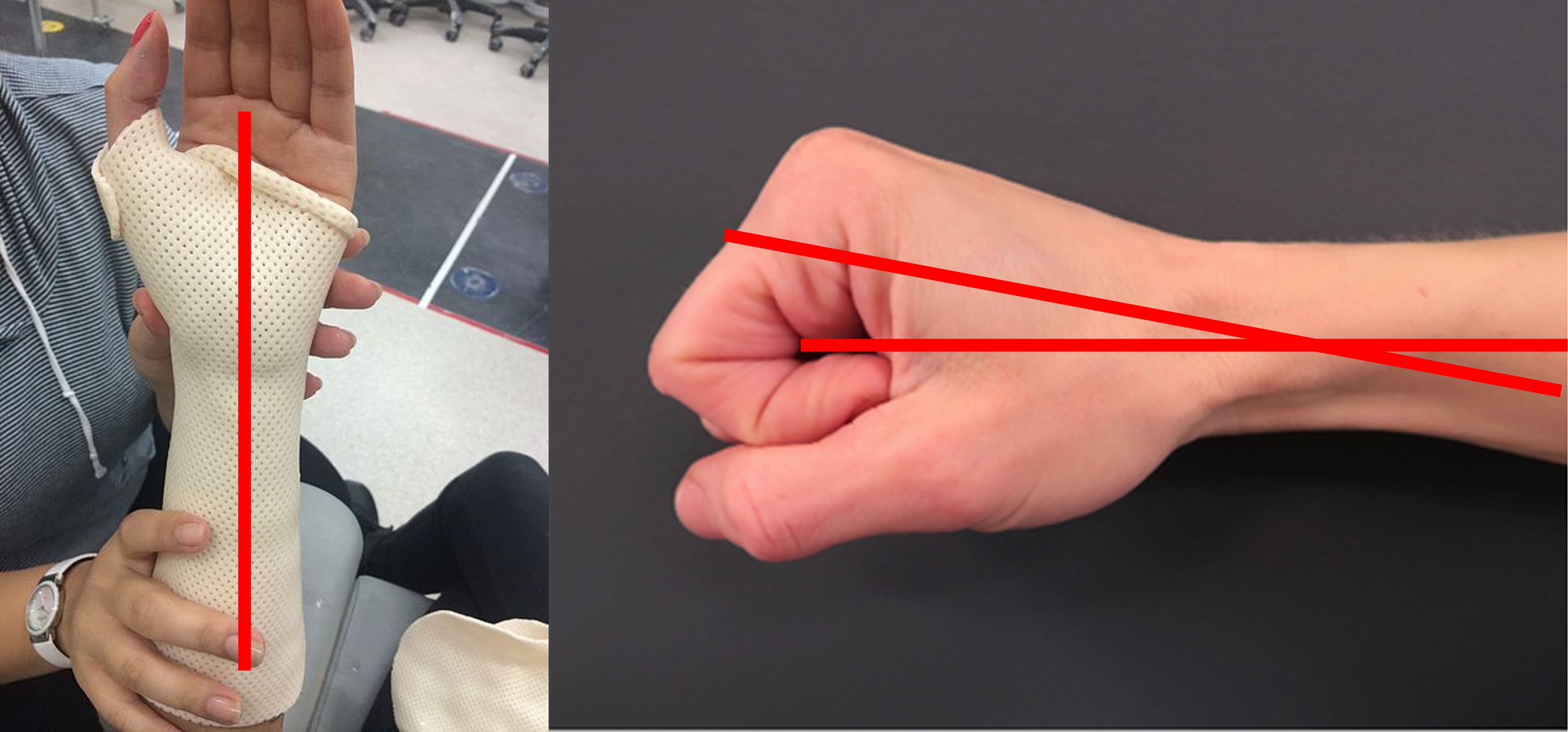 이처럼 좌우 기준으로 직선이 되도록, 그리고 손목을 살짝 손등쪽으로 편 상태로 고정해주는 것이 손목 관절의 중립 위치가 되며, 이는 손목 관절을 이루는 구조물들에 가장 무리가 가지 않는 자세를 의미합니다. 평상시에 이러한 자세를 기억해 두었다가, 작업하시는 환경에 적용하시면 손목에 무리가 더 안가겠지요? 이러한 부목의 경우 잠잘때만 착용하는 야간 부목만으로도 증상의 상당부분 호전을 가져온다고 보고되고 있습니다.
